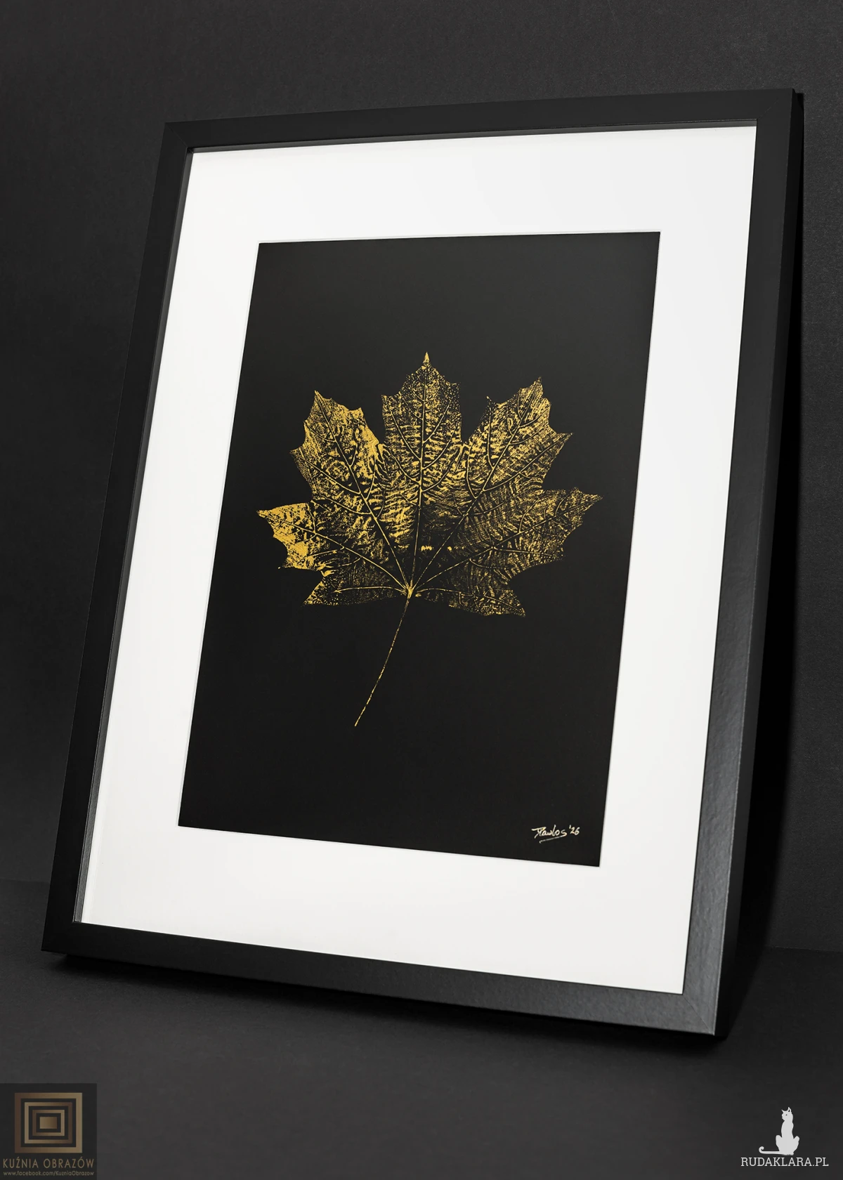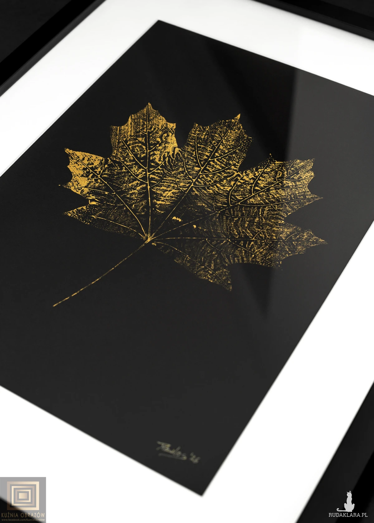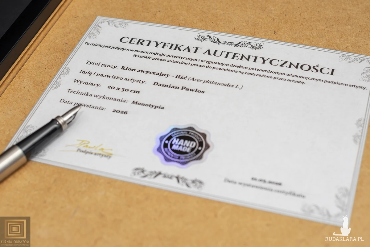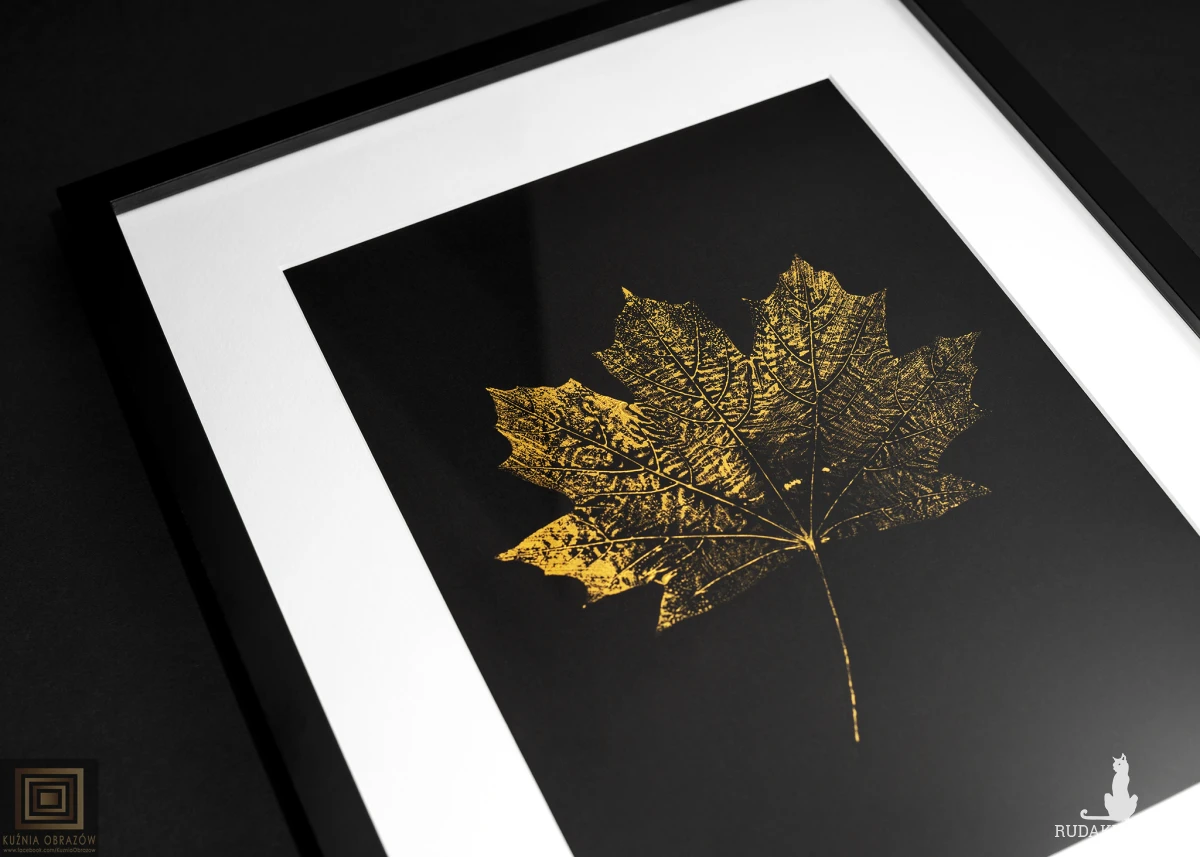 Wyjątkowa praca artystyczna przedstawiająca liść klonu wykonany techniką monotypii, która gwarantuje niepowtarzalność każdego egzemplarza. Subtelne złote akcenty nadają kompozycji szlachetnego blasku, pięknie kontrastując z głębią czarnej ramy oraz czystością białego passe-partout. Całość zamknięta w czarnej ramie w formacie A3 tworzy harmonijną i gotową do zawieszenia dekorację ścienną.