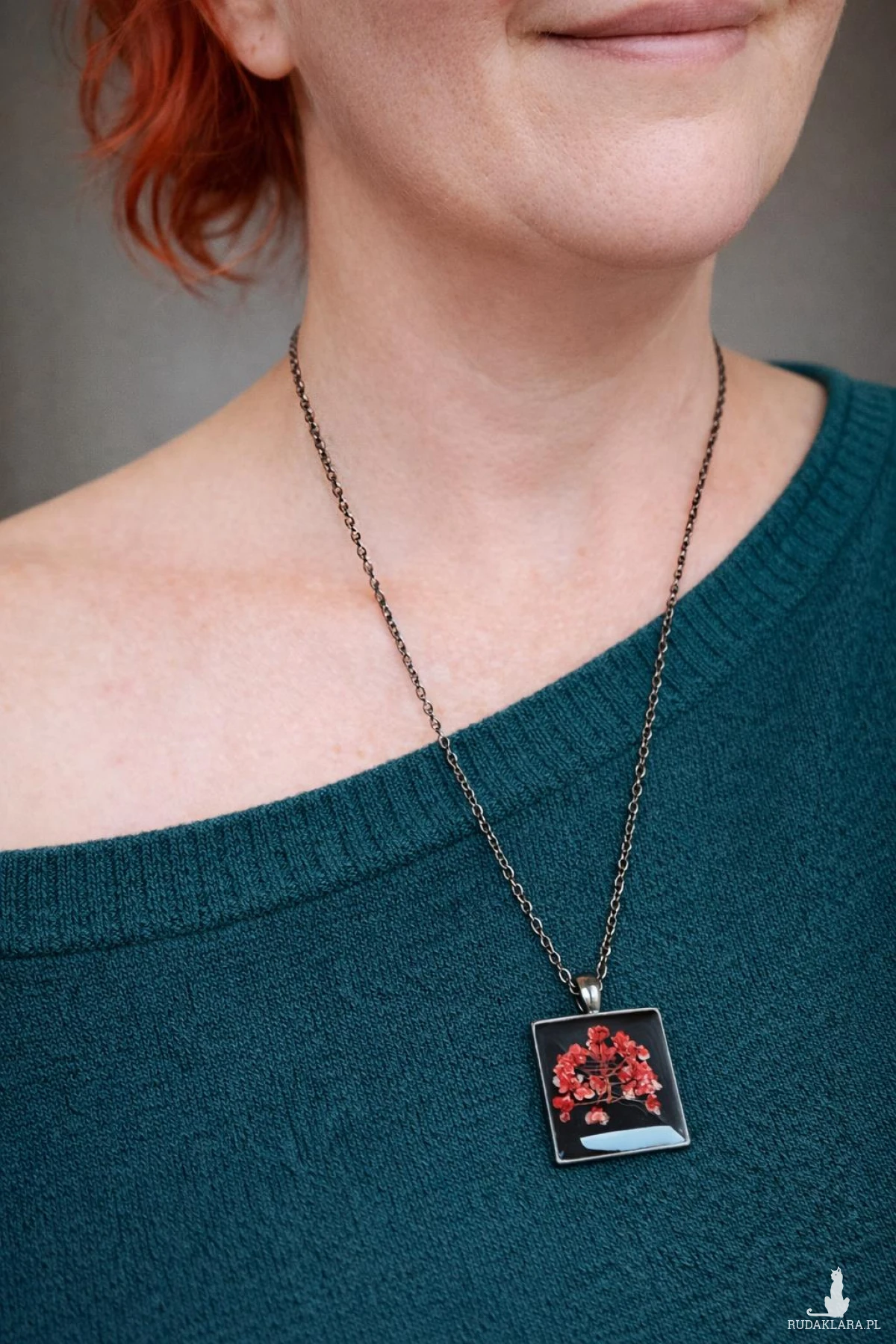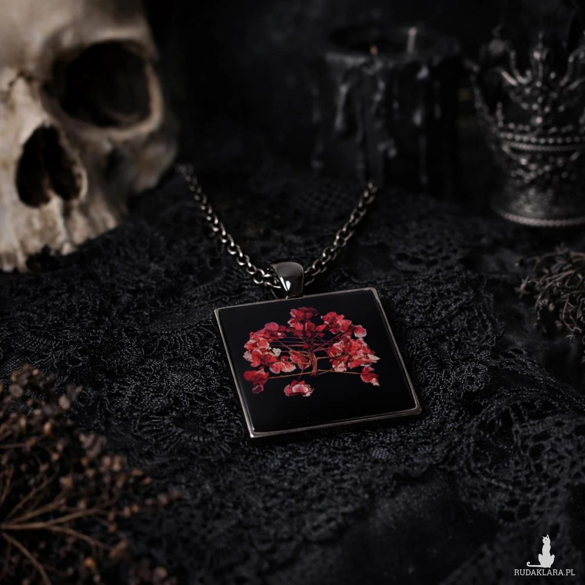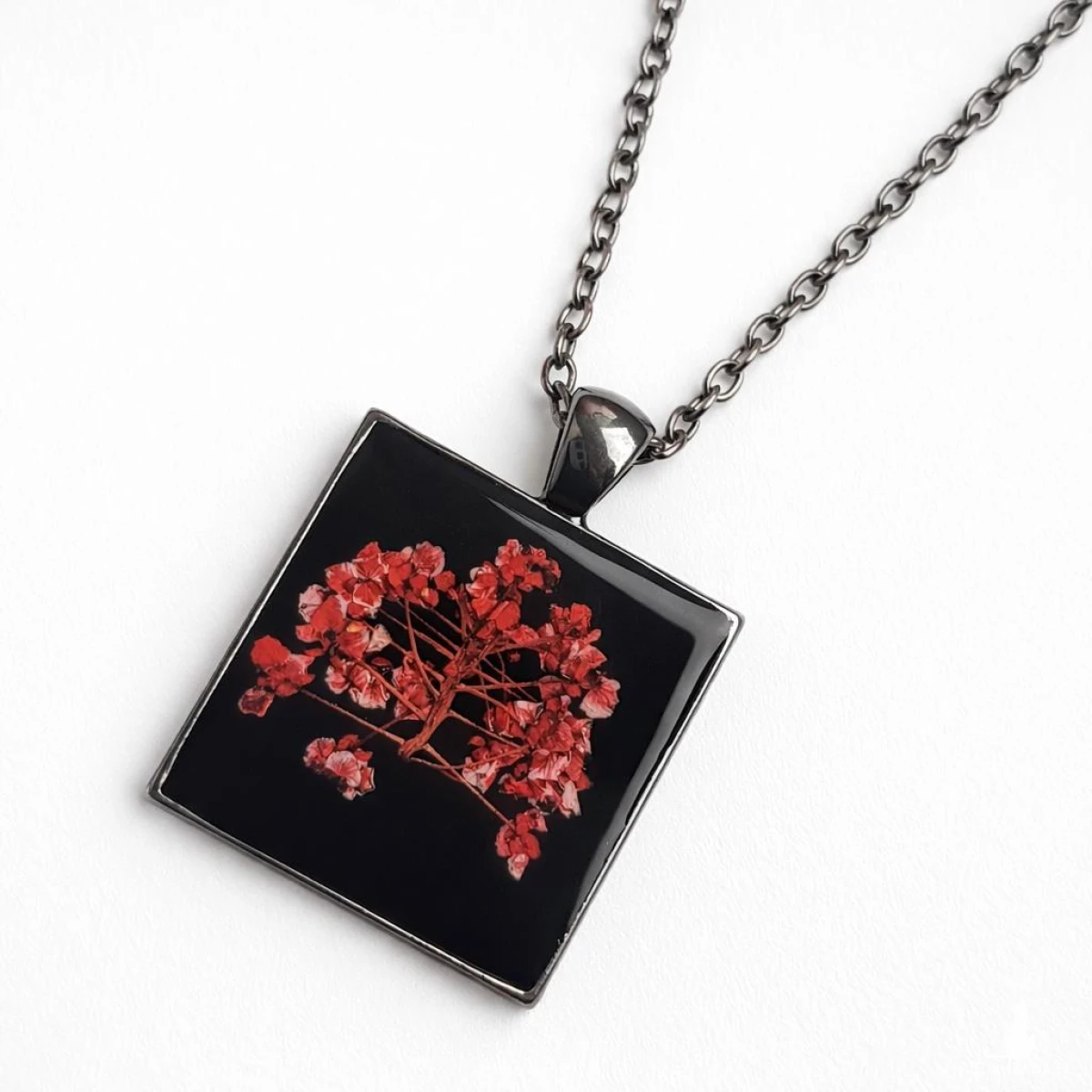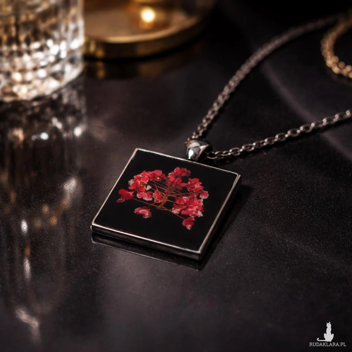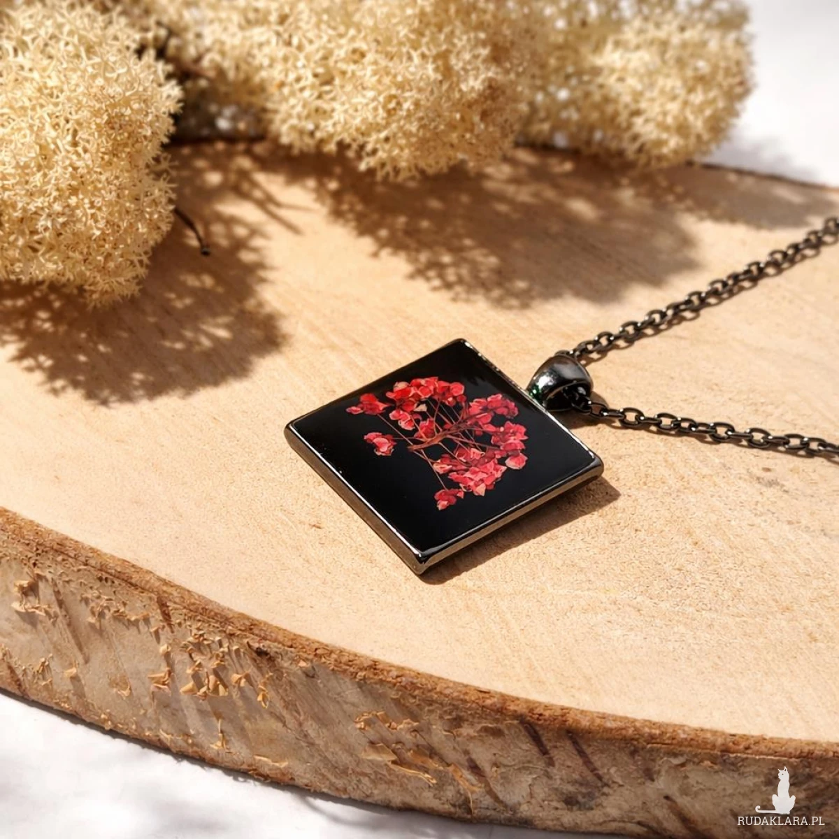 Wyjątkowy, ręcznie wykonany wisiorek z żywicy w eleganckiej antracytowej oprawie. W jego wnętrzu znajdują się naturalne, suszone czerwone kwiaty smagliczki, które tworzą unikalną kompozycję na głębokim czarnym tle.