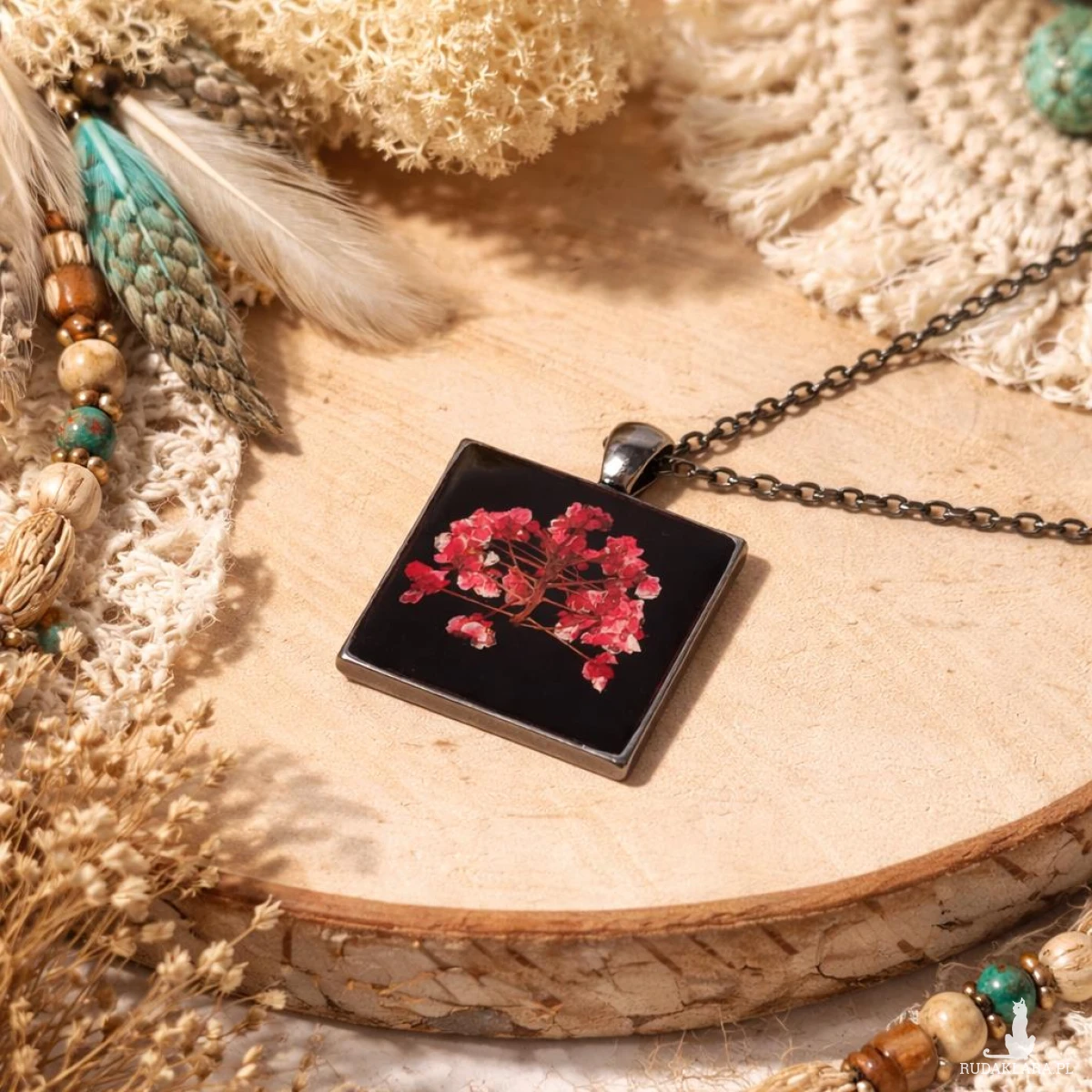 Wisiorek został wykonany ręcznie z dbałością o detale. Proces tworzenia obejmuje selekcję roślin, ich suszenie oraz zatapianie w krystalicznej żywicy, co pozwala zachować ich naturalny wygląd na długie lata.