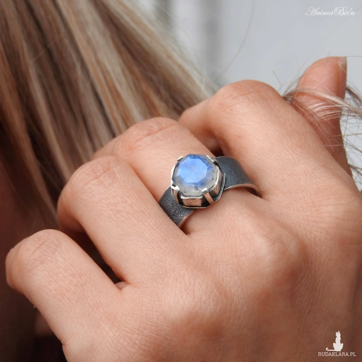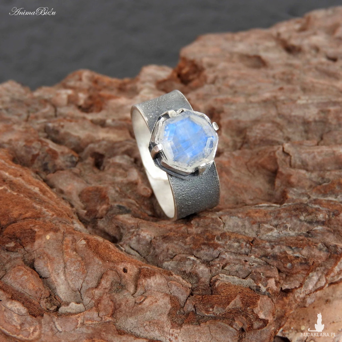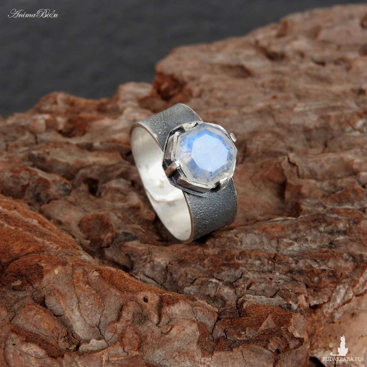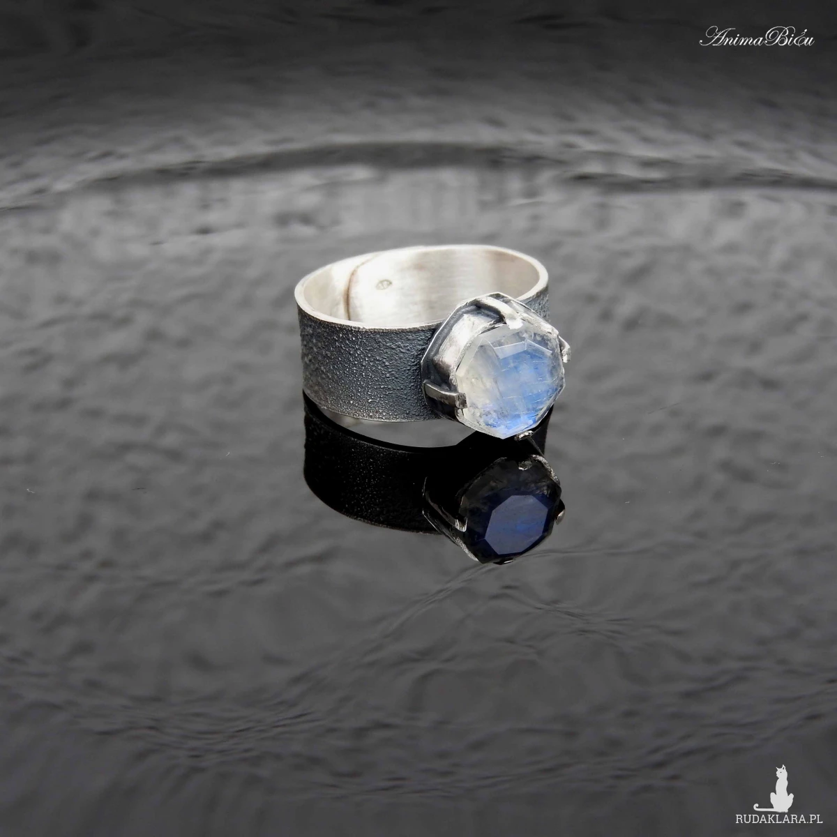 Obrączka srebrna z kamieniem księżycowym. Piękny, wysokiej