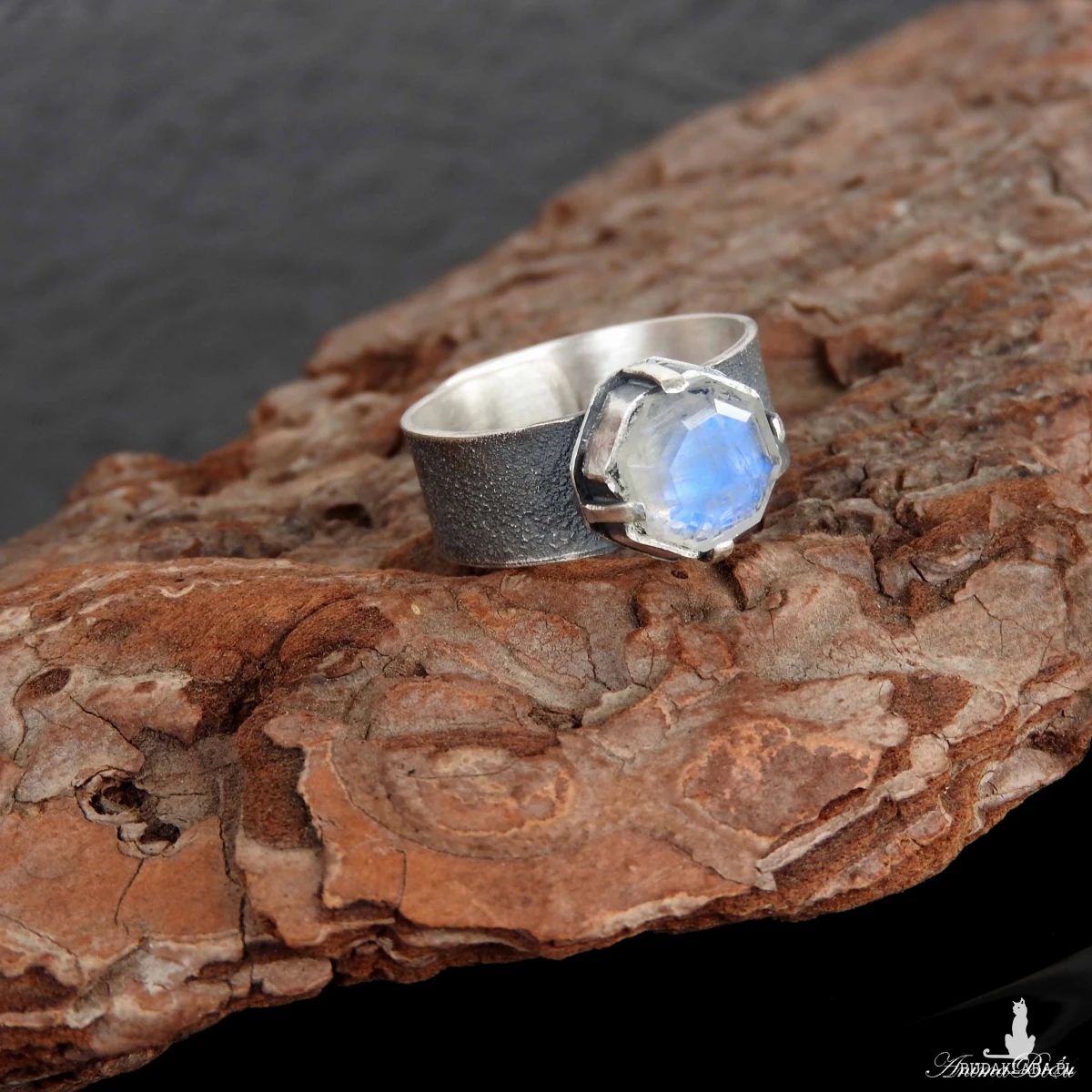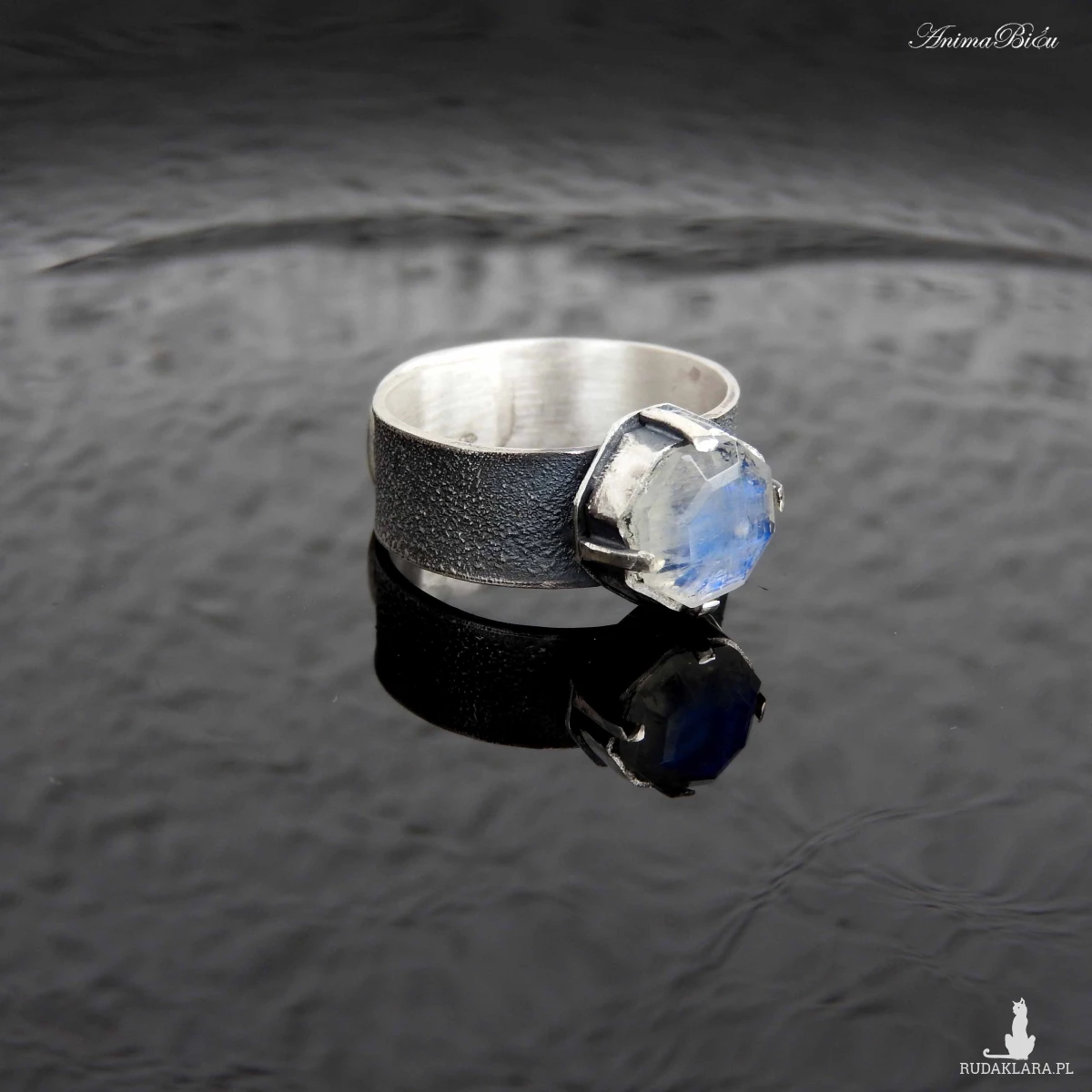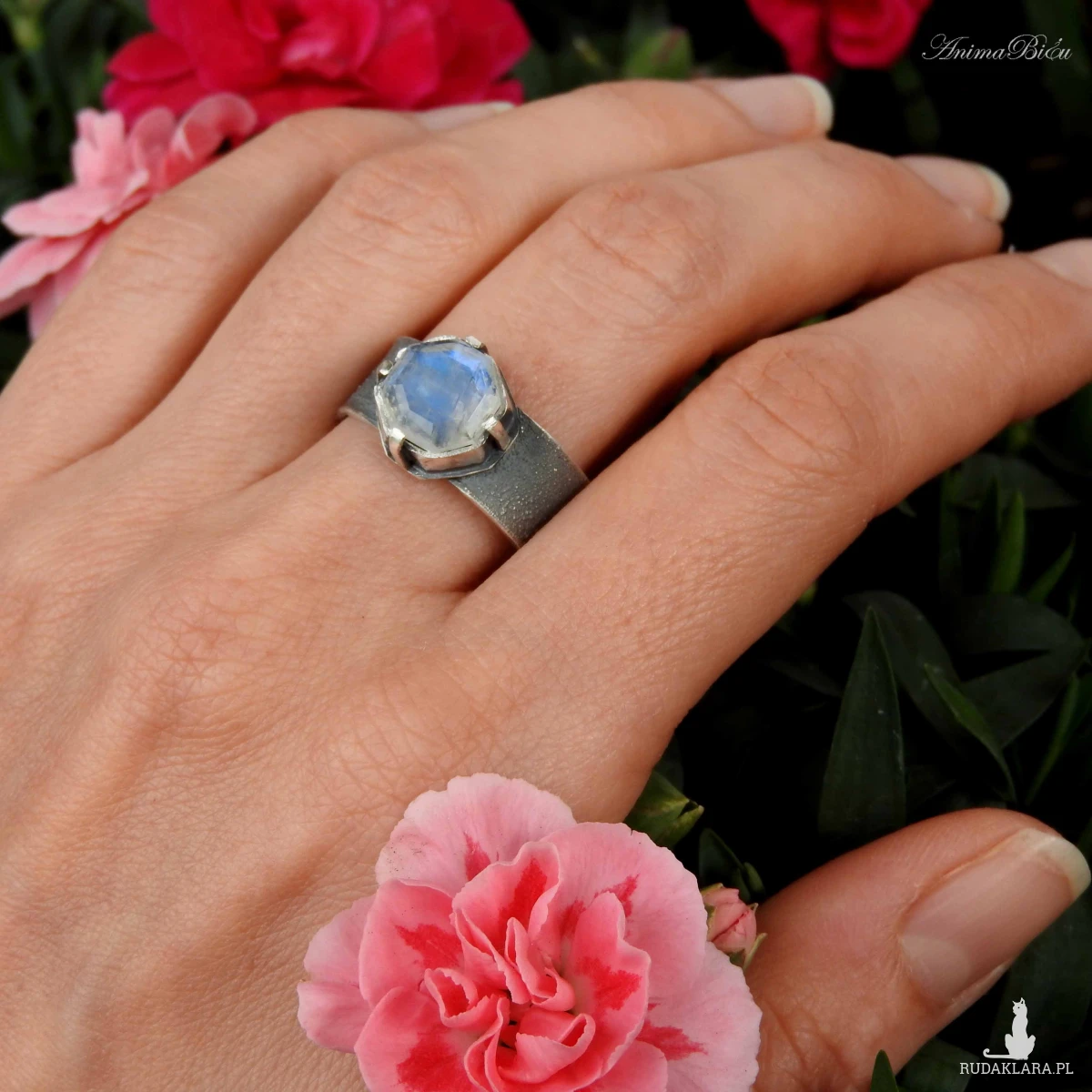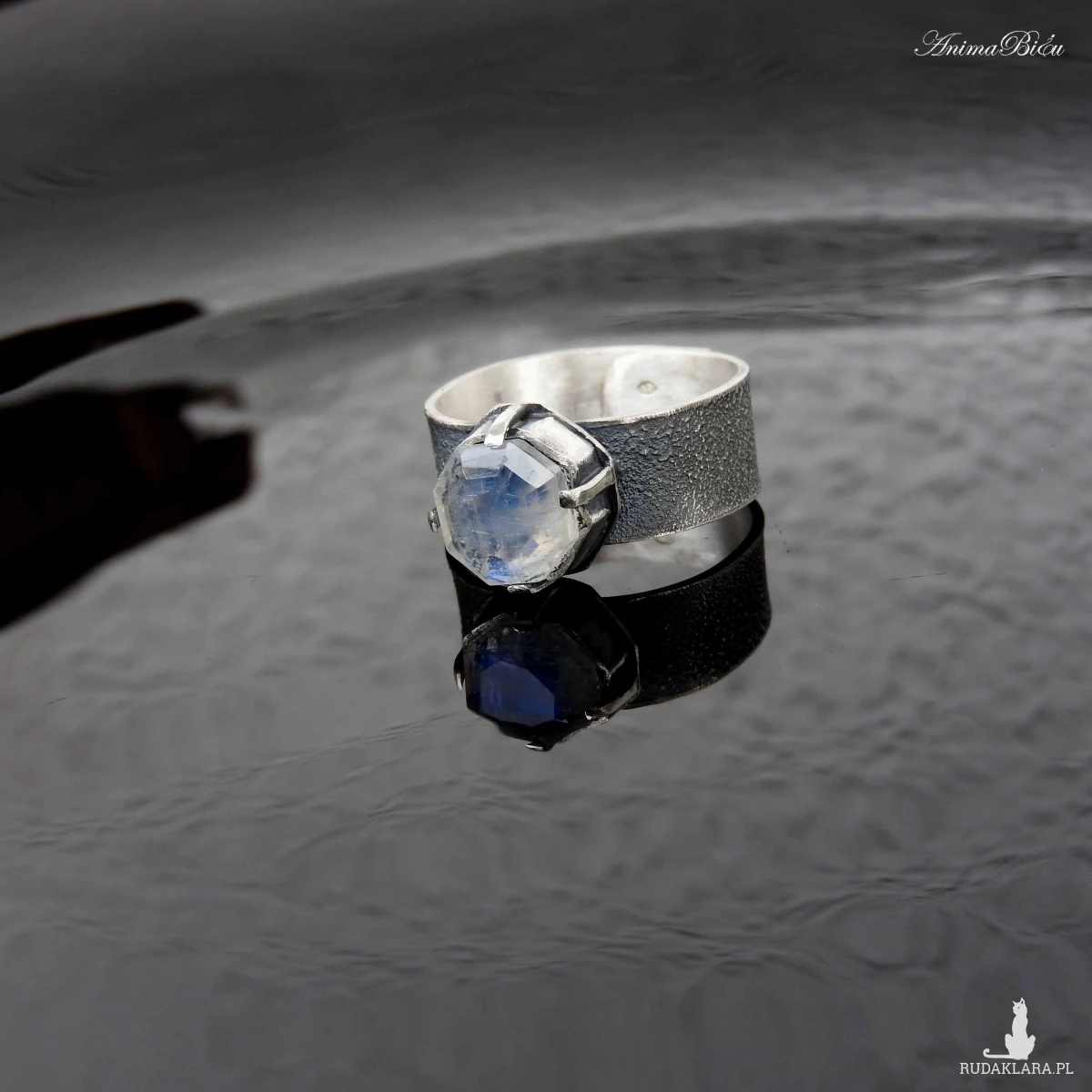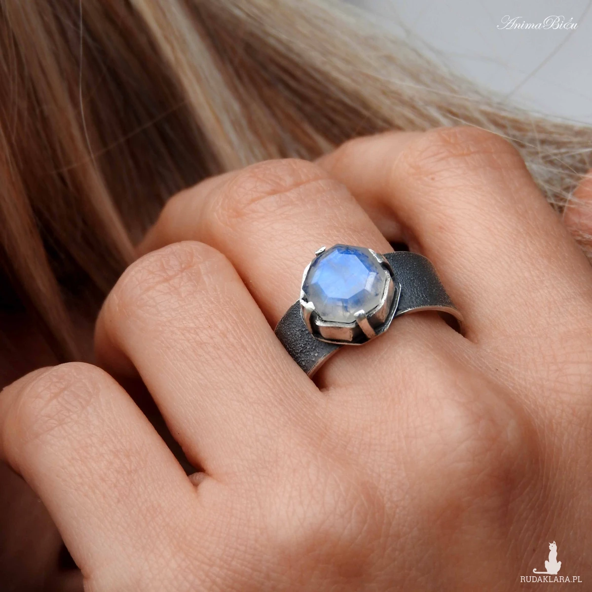 Obrączka srebrna z kamieniem księżycowym. Piękny, wysokiej