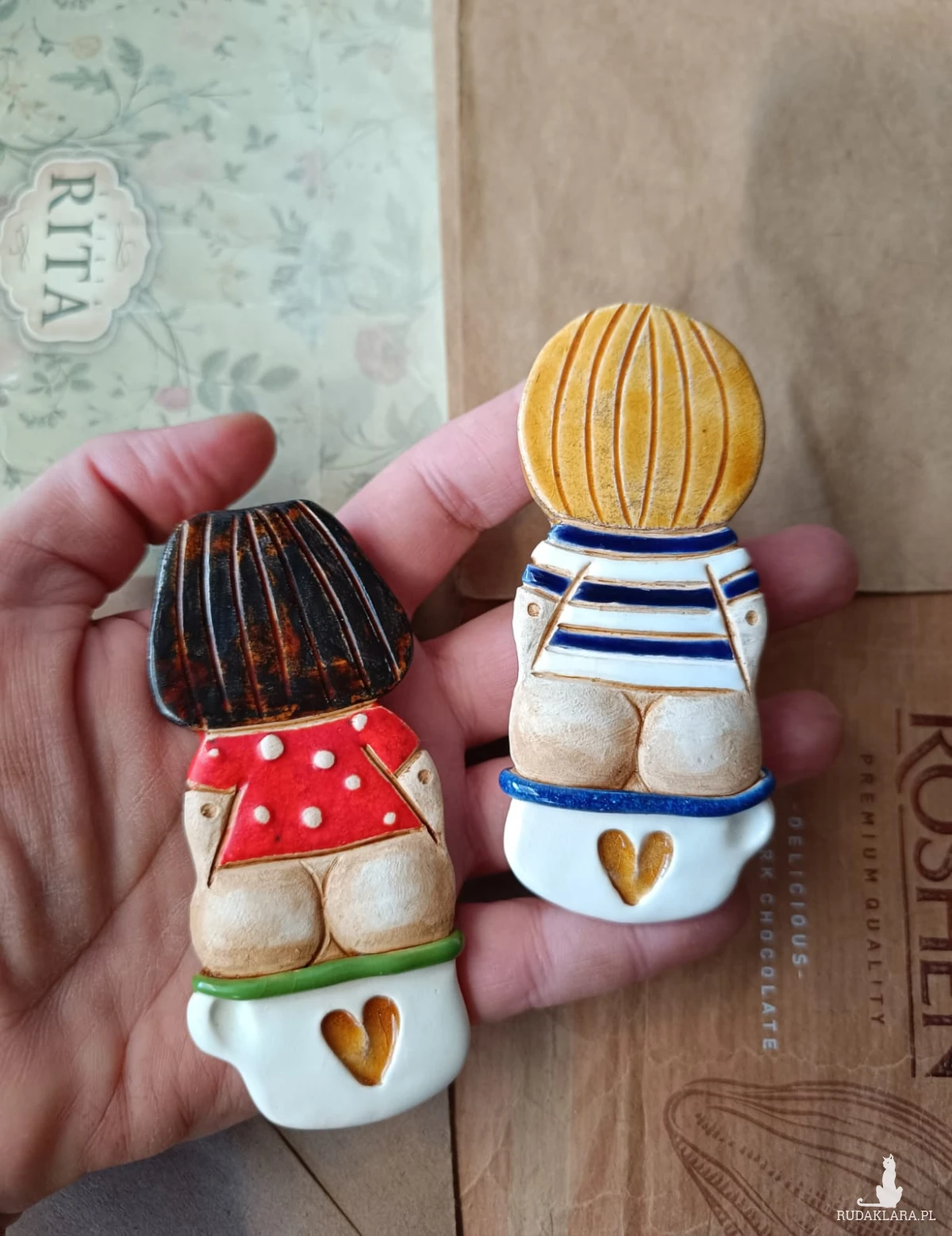 Komplet złożony z 2 zawieszek na drzwi łazienkowe. Wykonany z gliny szamotowej, wypalony na biskwit, a następnie szkliwiony w temperaturze 1260 stopni C. Idealnie sprawdzą się jako prezent okolicznościowy lub ozdoba domu. Zalecany sposób mocowania - taśma klejąca Tessa. Istnieje również możliwość zrobienia dziurek w szyldach.