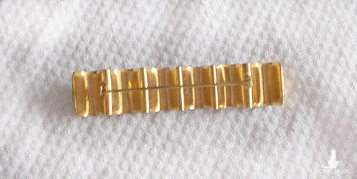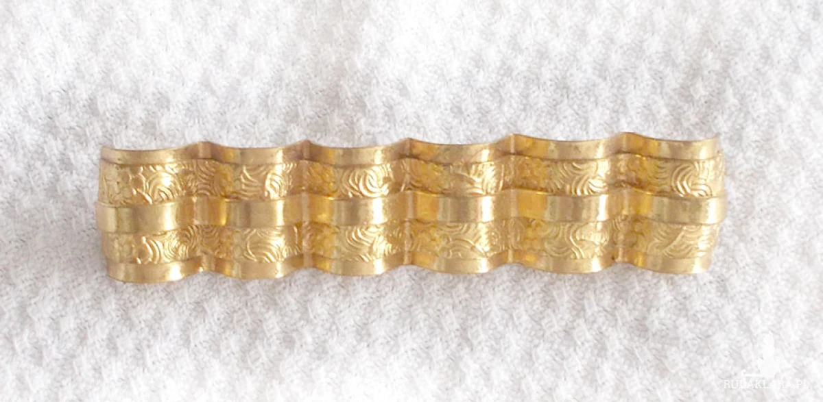 Oryginalny przedmiot retro z lat 60/70 XX w. Metalowa broszka w złotym kolorze. Wymiary: 6,5 cm x 1 cm. Przedmiot dla kolekcjonera lub do ozdoby ubrania, żakietu, sukienki, bluzki, swetra itp.