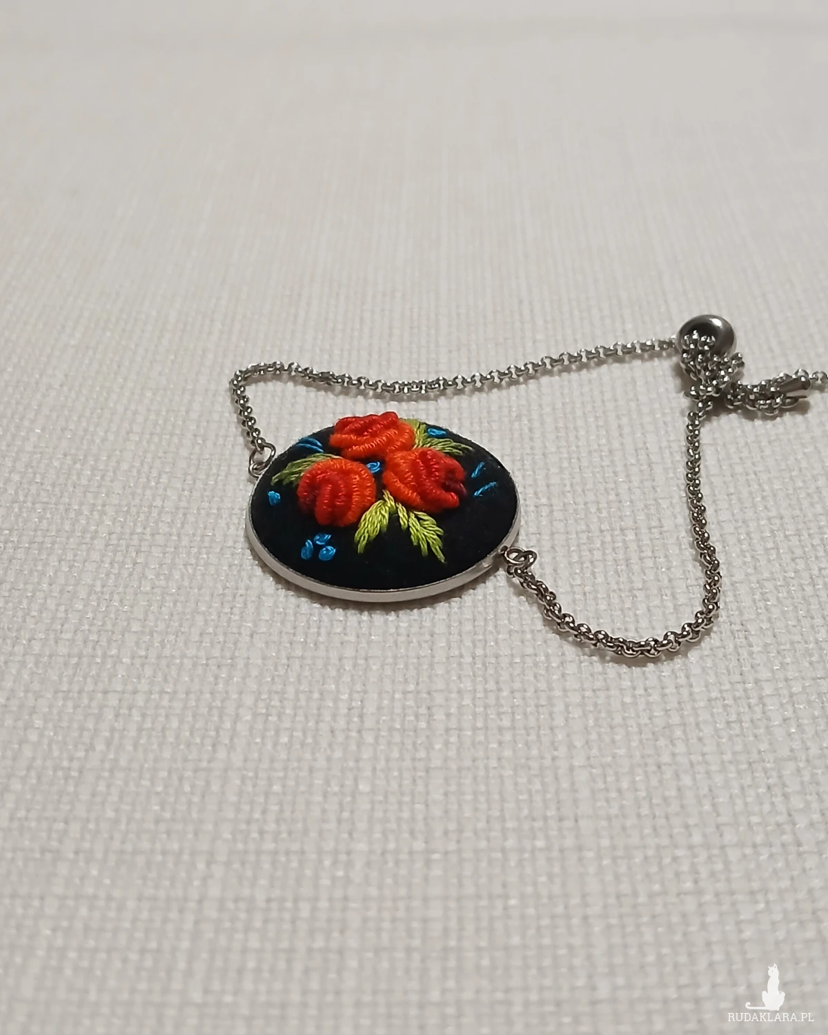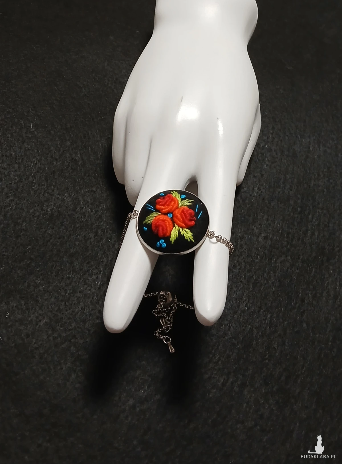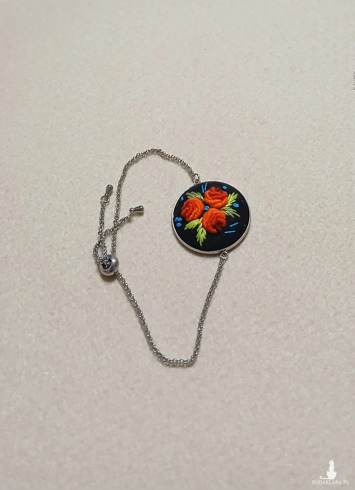 Perfekcyjnie dopracowany haft na filcu wykonałam polską bawełnianą muliną za pomocą igły. Jest on zabezpieczony impregnatem do tkanin ale po dłuższym użytkowaniu można go odświeżyć przy użyciu delikatnego mydła i letniej wody.