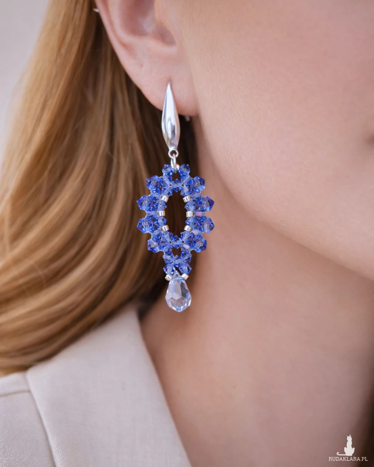 W kolczykach błękitne kryształki tworzą ramę, srebrne akcenty rozjaśniają kompozycję, a fasetowana kropla domyka ją z wdziękiem.