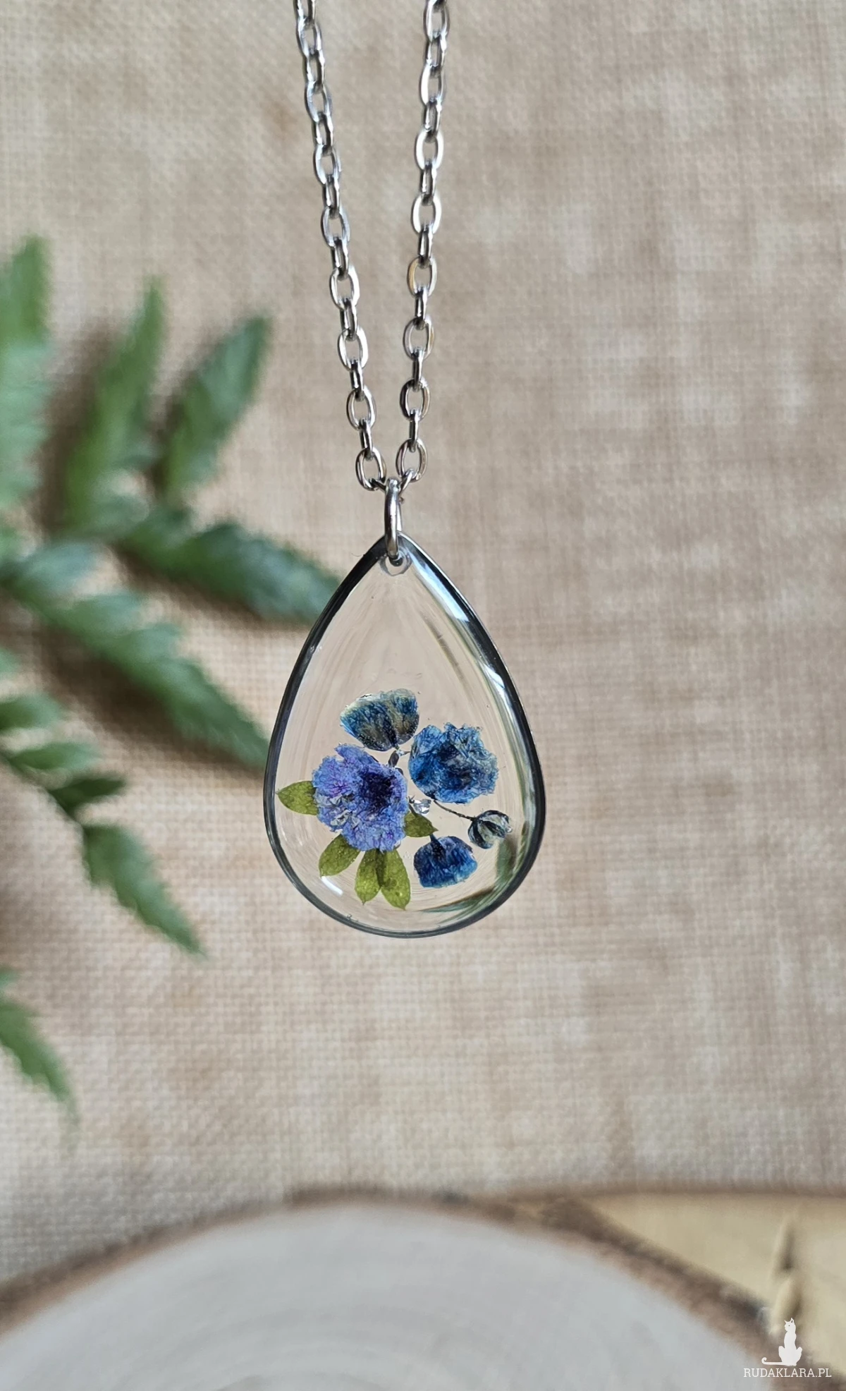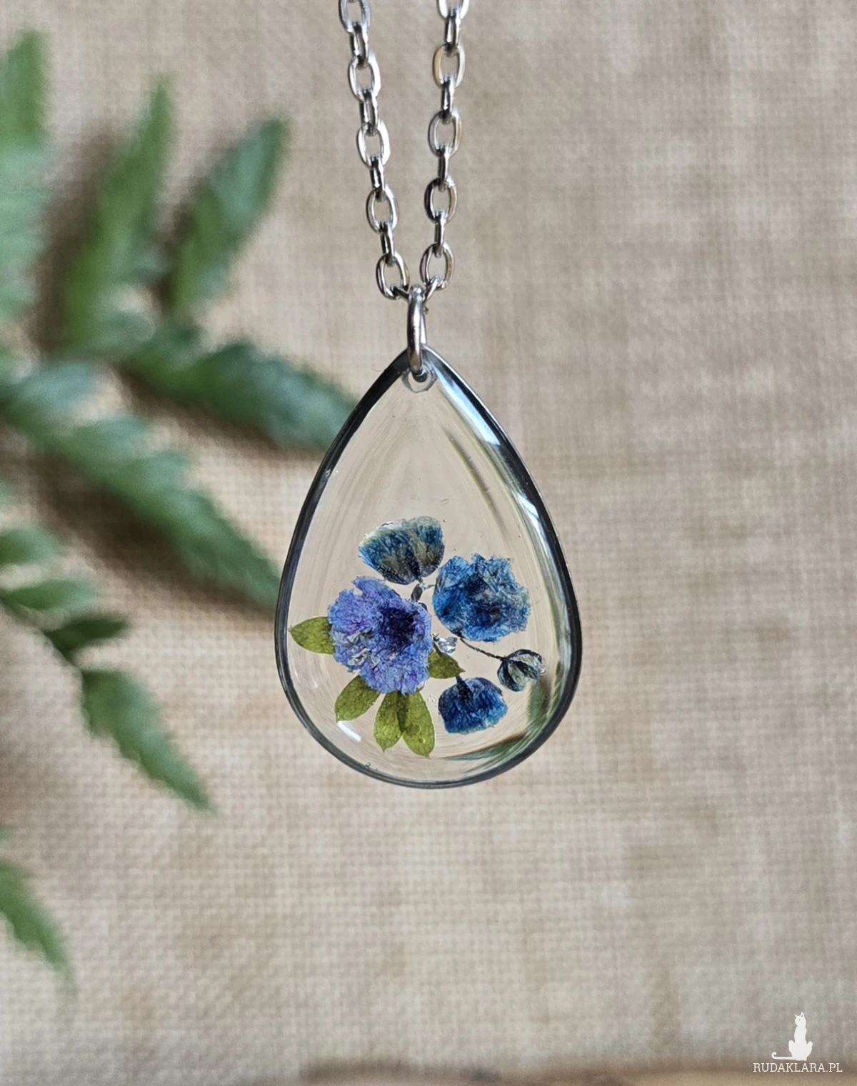 Oferuję Państwu unikalną biżuterię. Zawieszka jest wykonana z suszonych kwiatów i żywicy epoksydowej. Biżuteria jest wspaniałym i oryginalnym prezentem na lata.