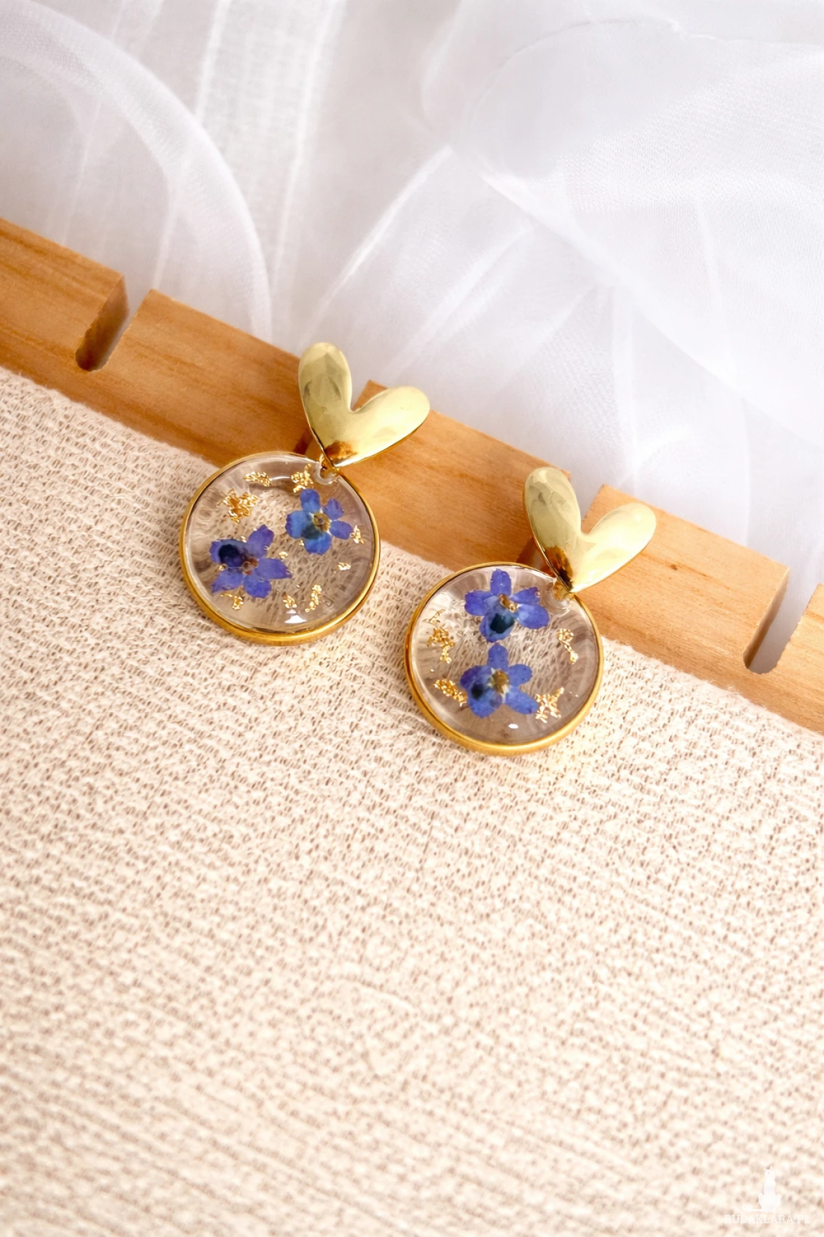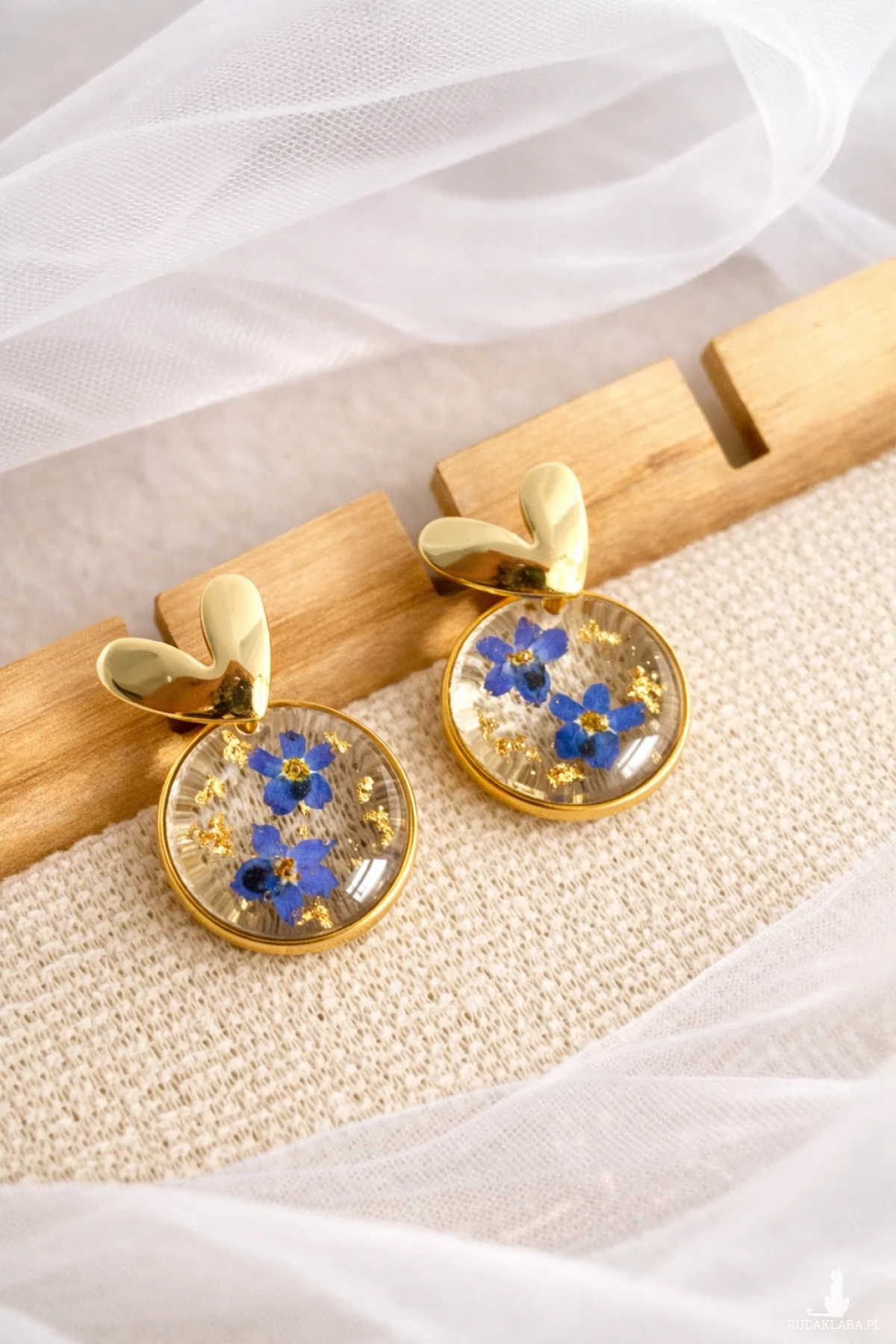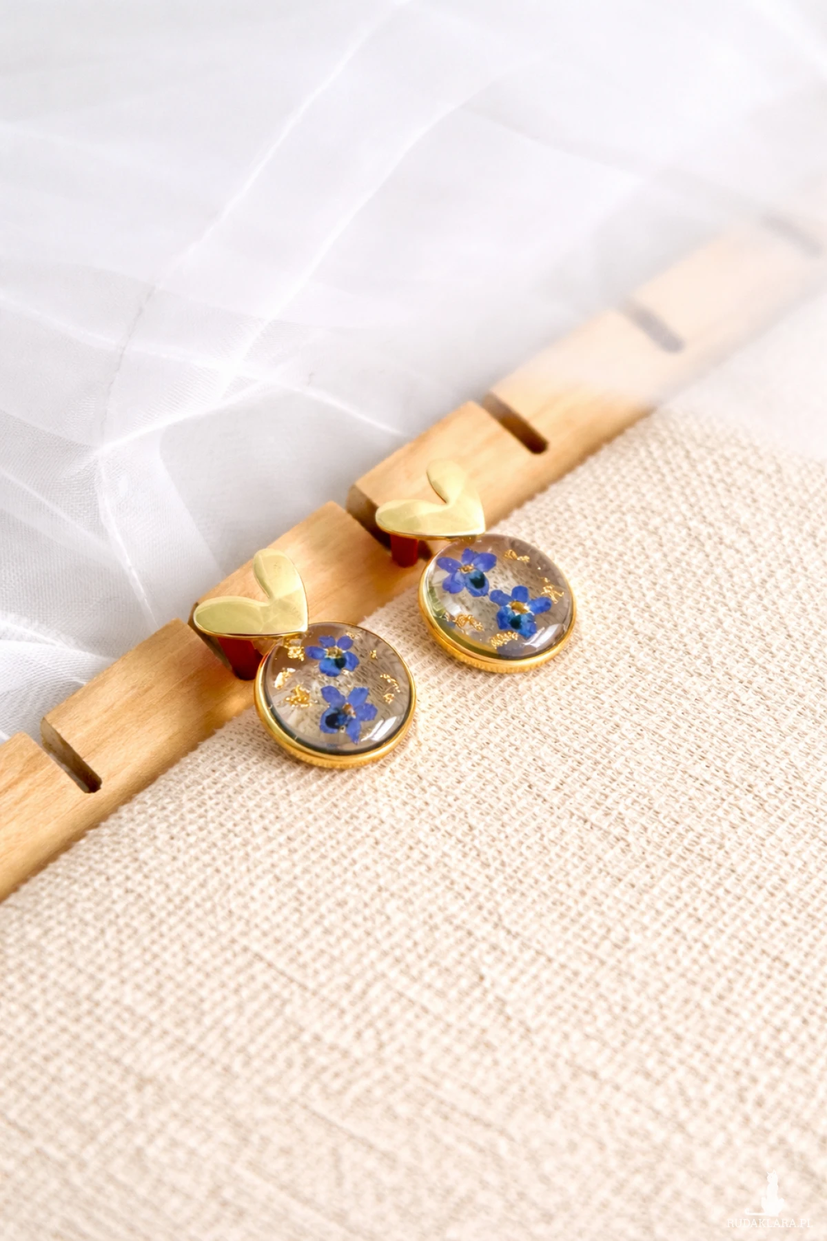 Romantyczne kolczyki z prawdziwymi niezapominajkami zatopionymi w przejrzystej żywicy. Niebieskie kwiaty zostały ręcznie ułożone i ozdobione subtelnymi złotymi drobinkami, które pięknie odbijają światło.