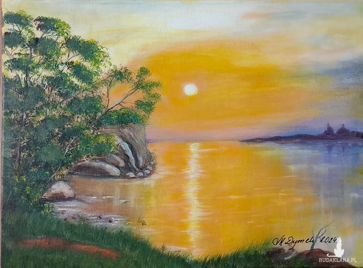 Na pierwszym planie skalisty brzeg, kontrastujący z miękkim światłem nieba, w oddali, na horyzoncie zarysowuje się panorama portu, co nadaje kompozycji głębi. Nastrojowy pejzaż, który wprowadzi do wnętrza spokój i relaks. Niezwykle realistycznie oddany sielankowy klimat zaprasza w głąb natury. Przepięknie udekoruje ściany salonu, sypialni, czy biura. Idealny również jako prezent na każdą okazję.