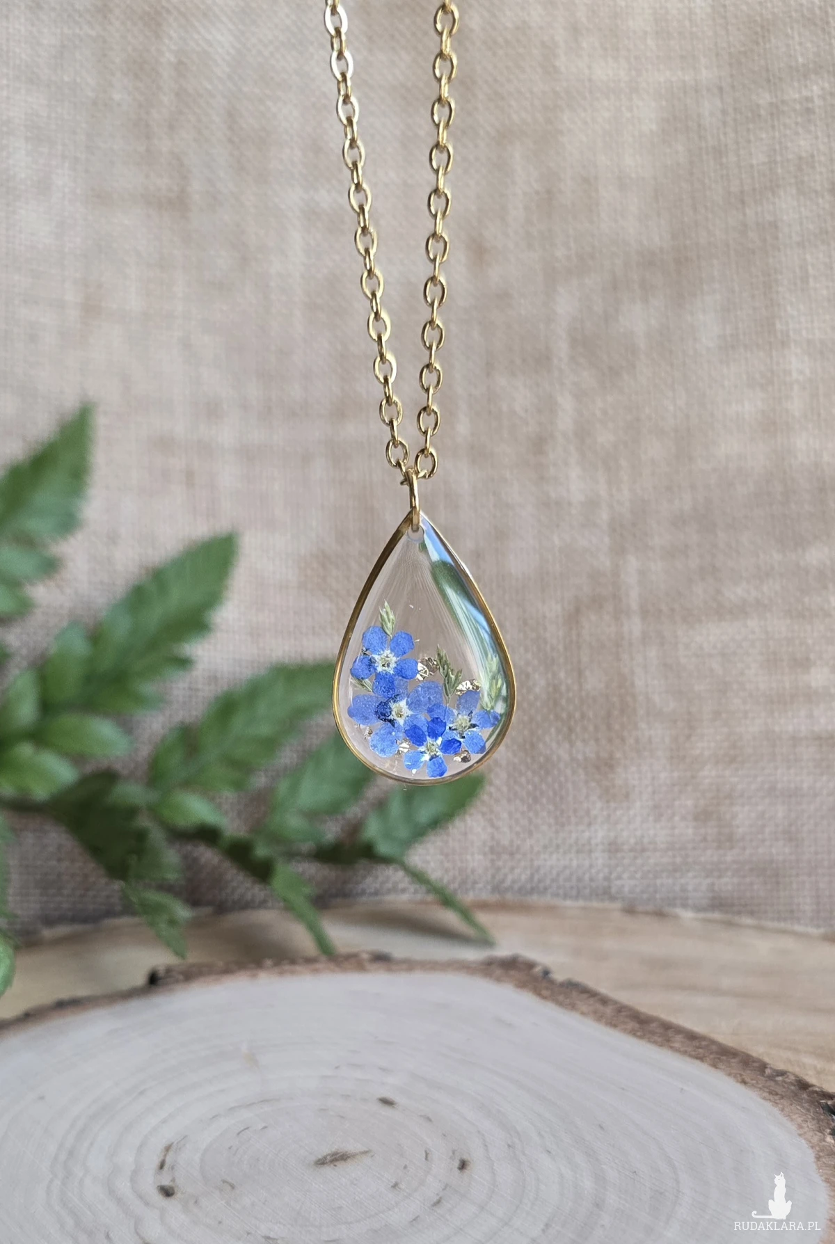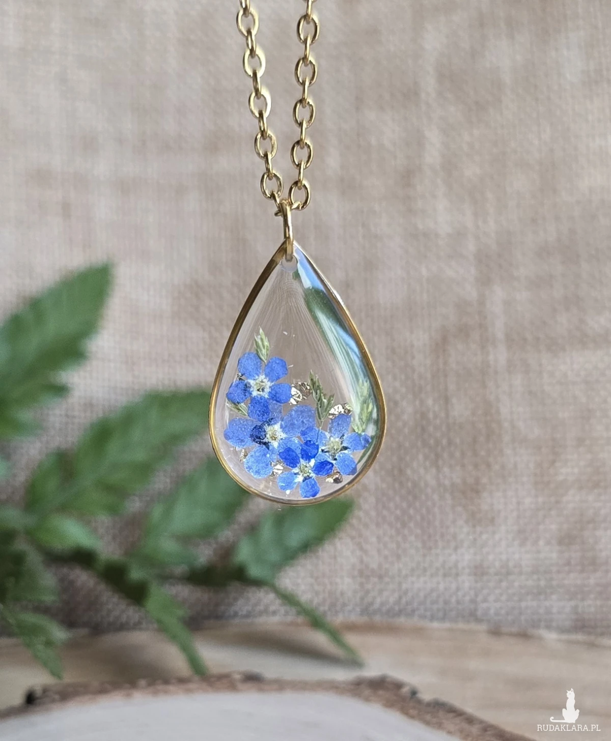 Złota zawieszka złoty wisiorek kwiat naszyjnik żywica z żywicy kwiaty łezka łza niezapominajka niezapominajki