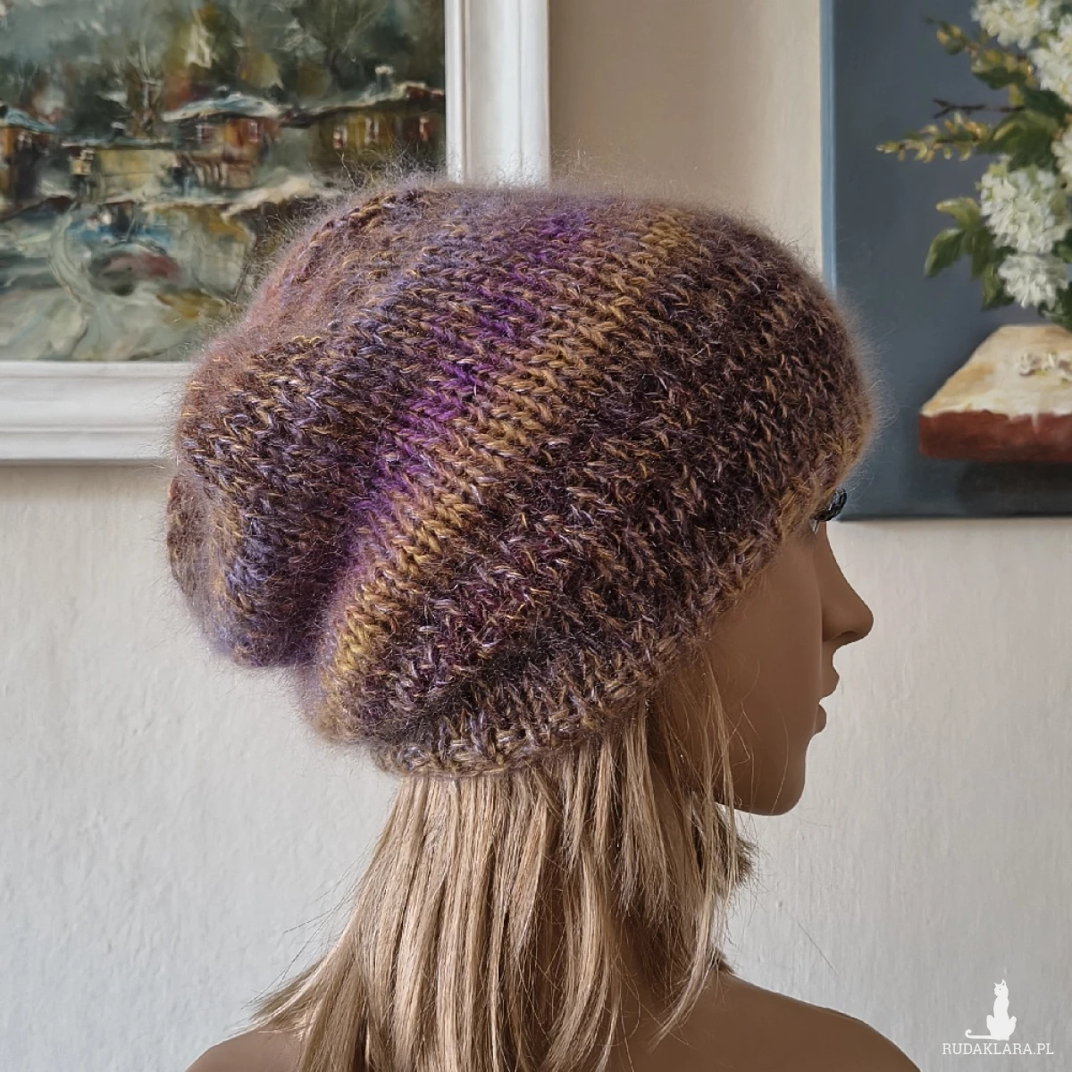 Miła, ciepła, puchata, lekka czapka wykonana ręcznie na drutach potrójną nitką z doskonałych włóczek o składzie: jedwab, najdelikatniejszy moher i ekskluzywna wełenka merino. Czapka nie jest typem grubaśnej czapy, ale bardzo ciepła. Zdjęcia nie oddają miękkości i delikatności włóczek. Polecam dla obwodów głowy 56-58 cm, wys. 27 cm. Brak klasycznego ściągacza nie grozi rozciągnięciem czapki.