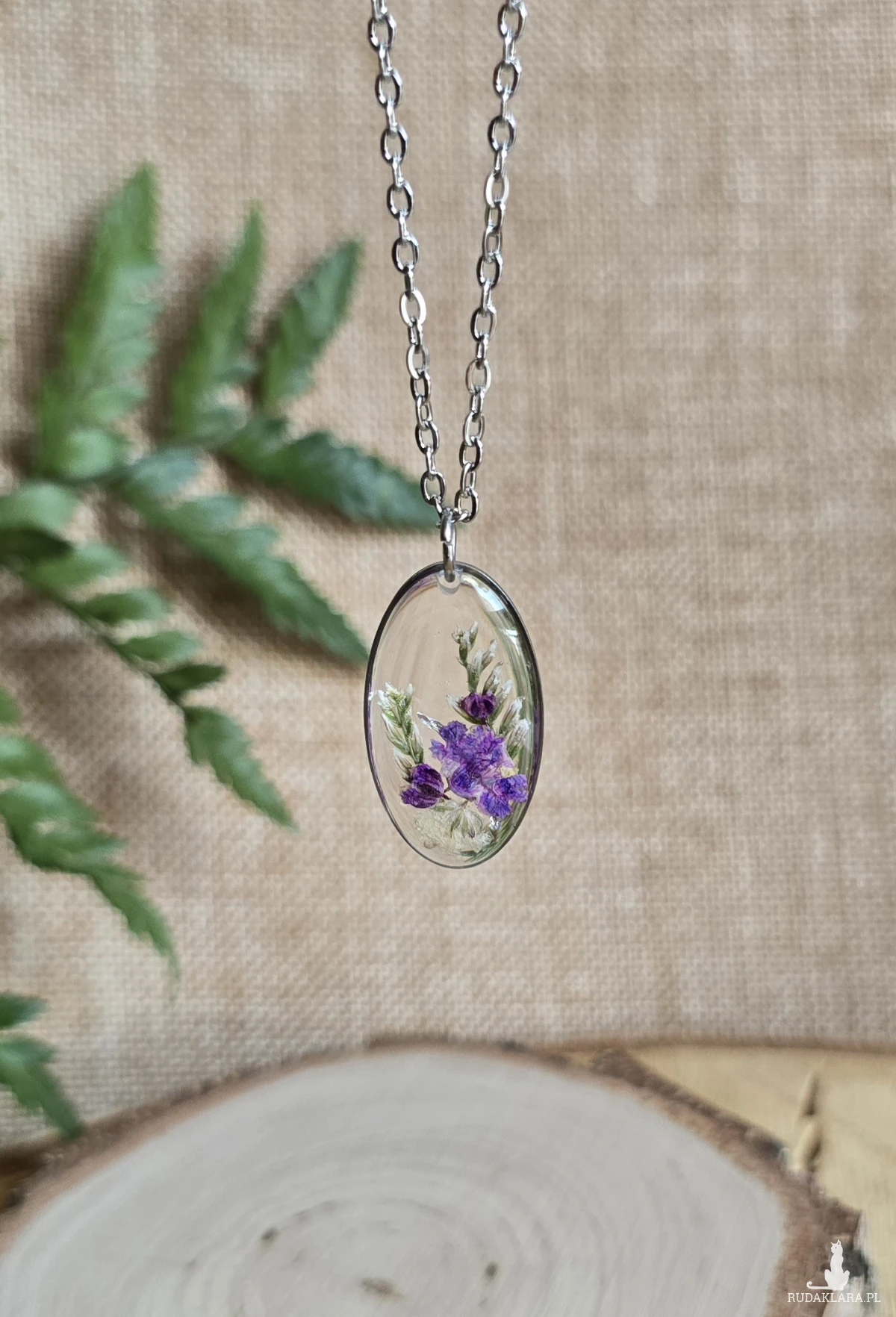 Srebrna zawieszka srebrny wisiorek naszyjnik żywica z żywicy kwiaty z kwiatami jajowata rośliny fioletowa