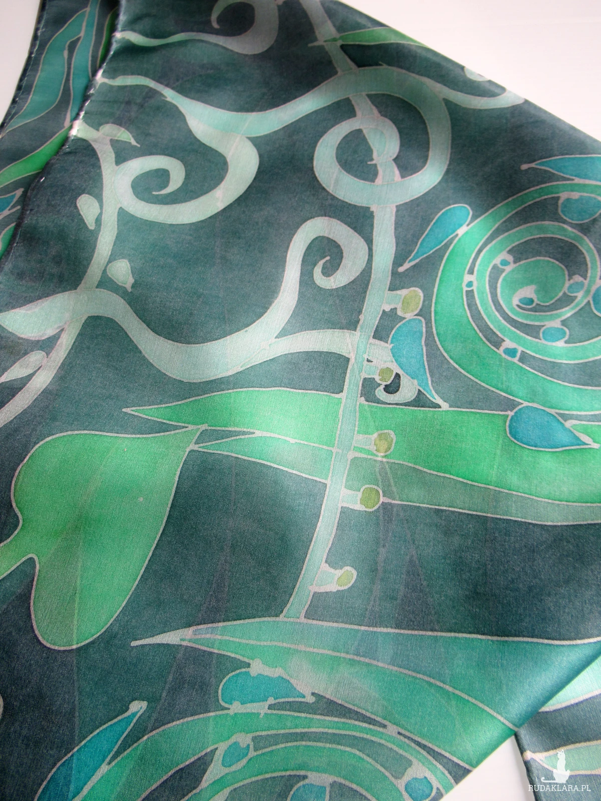 Jedwabna ręcznie malowana apaszka Zielona z dekoracją roślinną.
