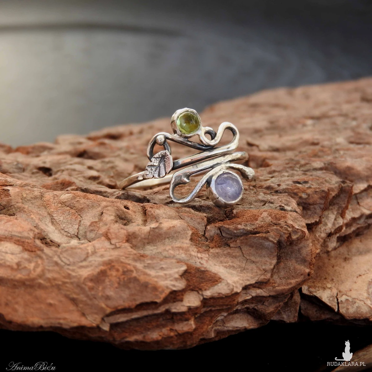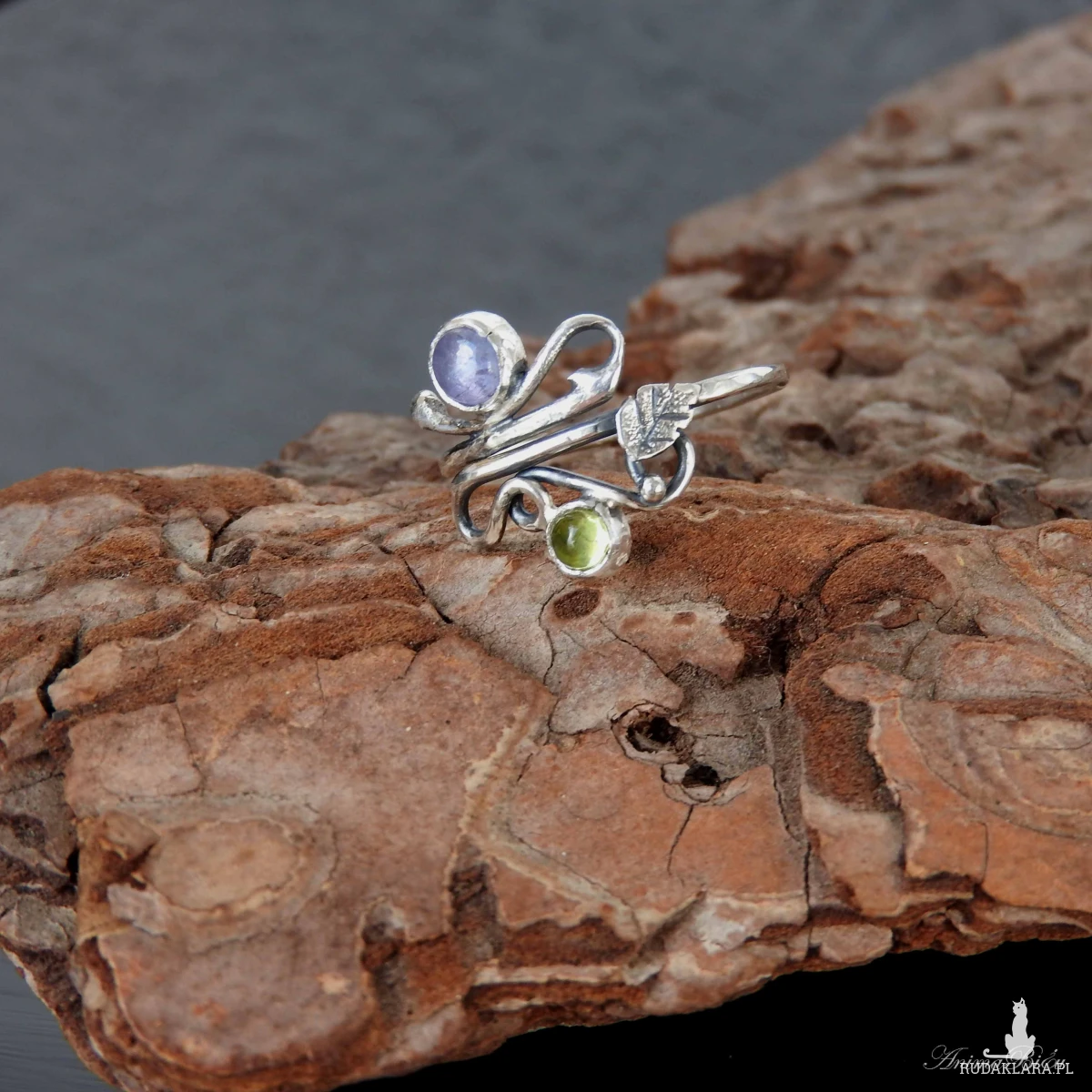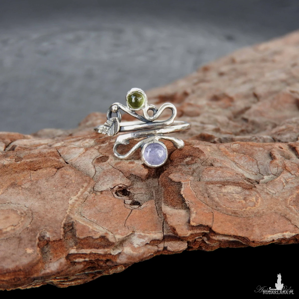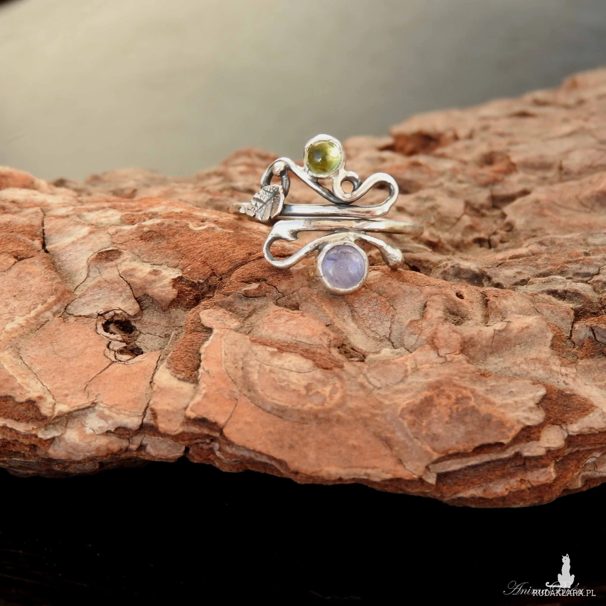 Pierścionek srebrny z oliwinem i tanzanitem. Pierścionek