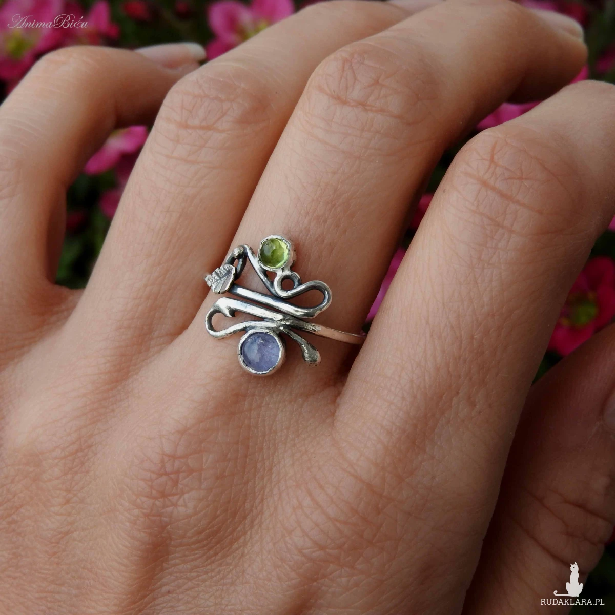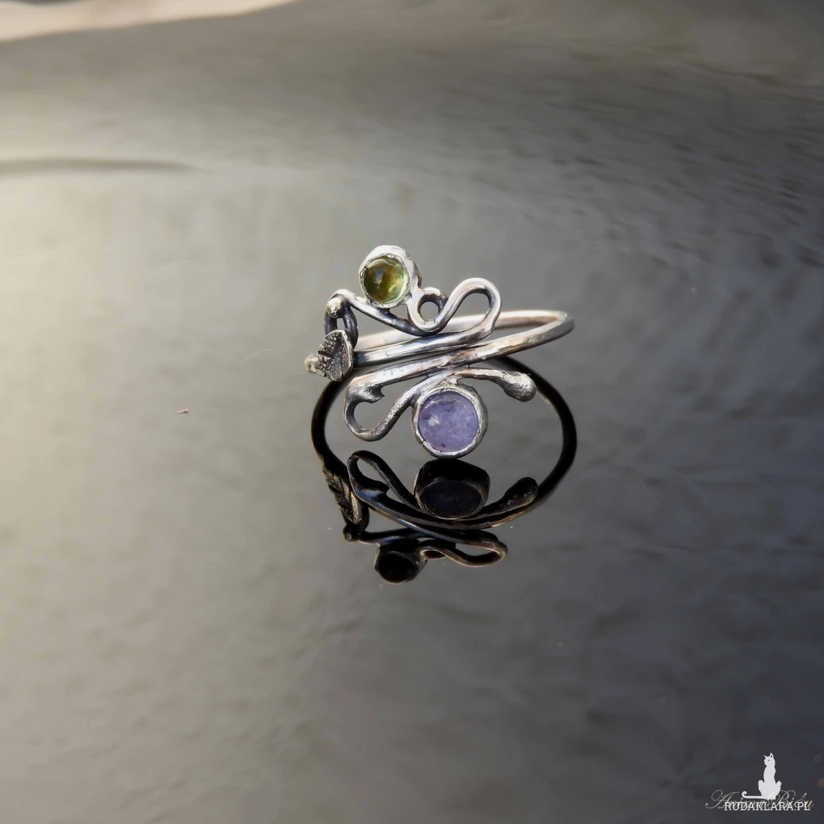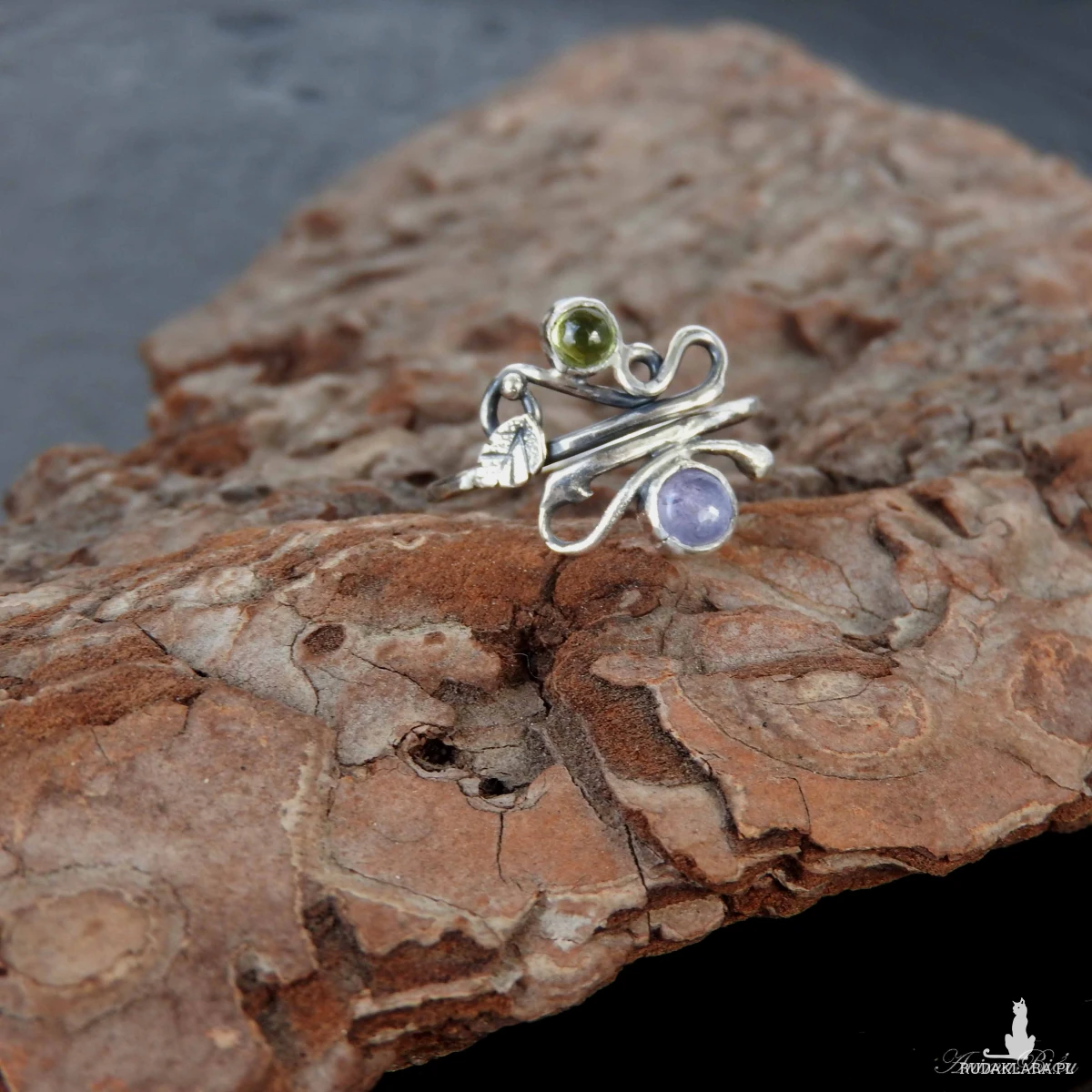 Pierścionek srebrny z oliwinem i tanzanitem. Pierścionek