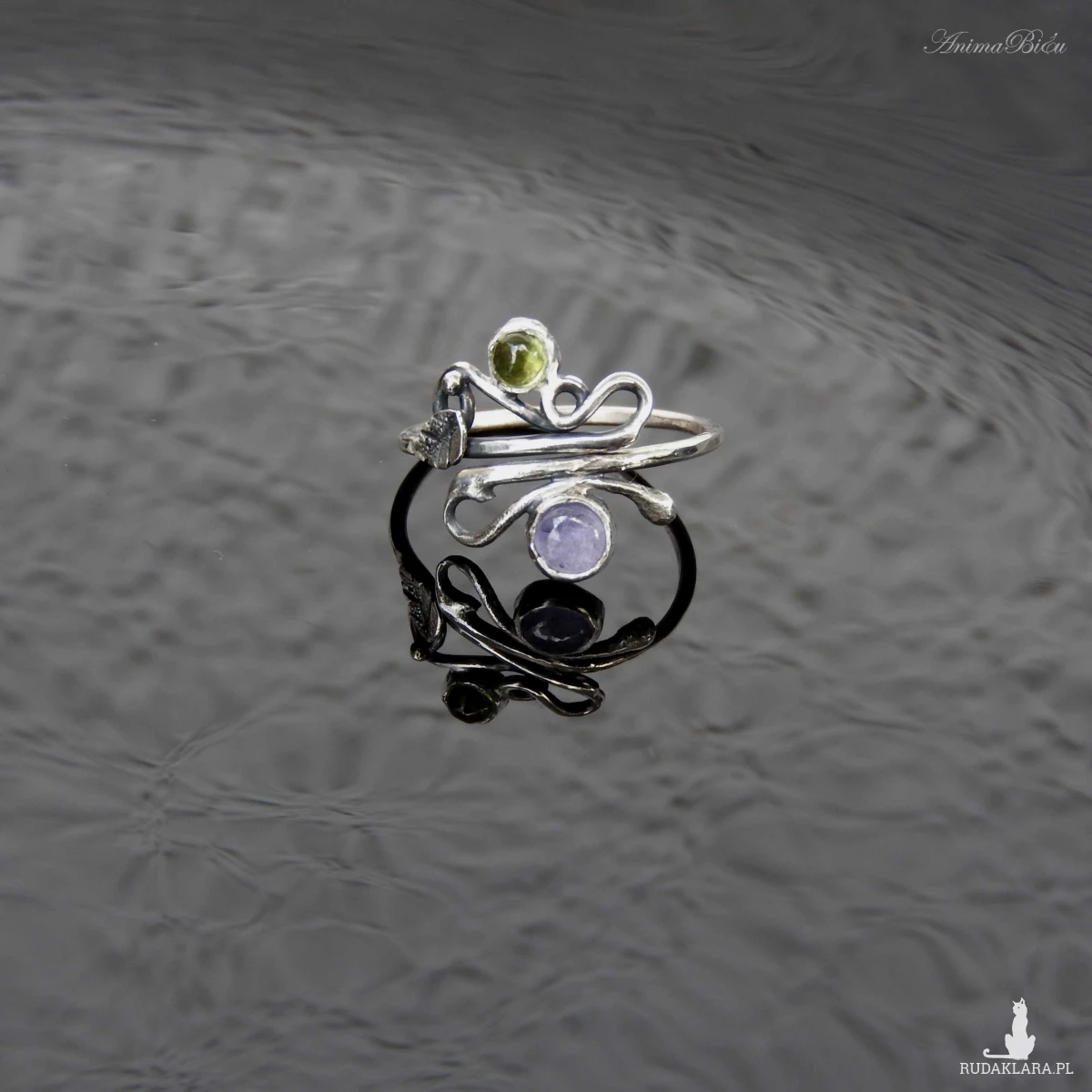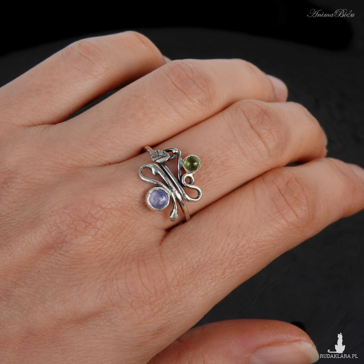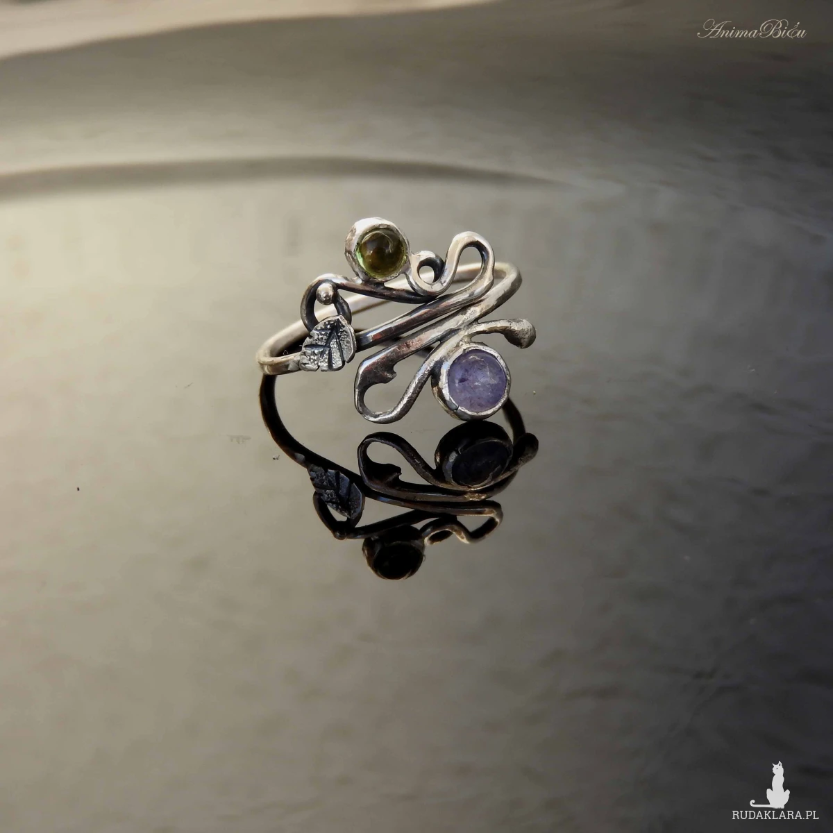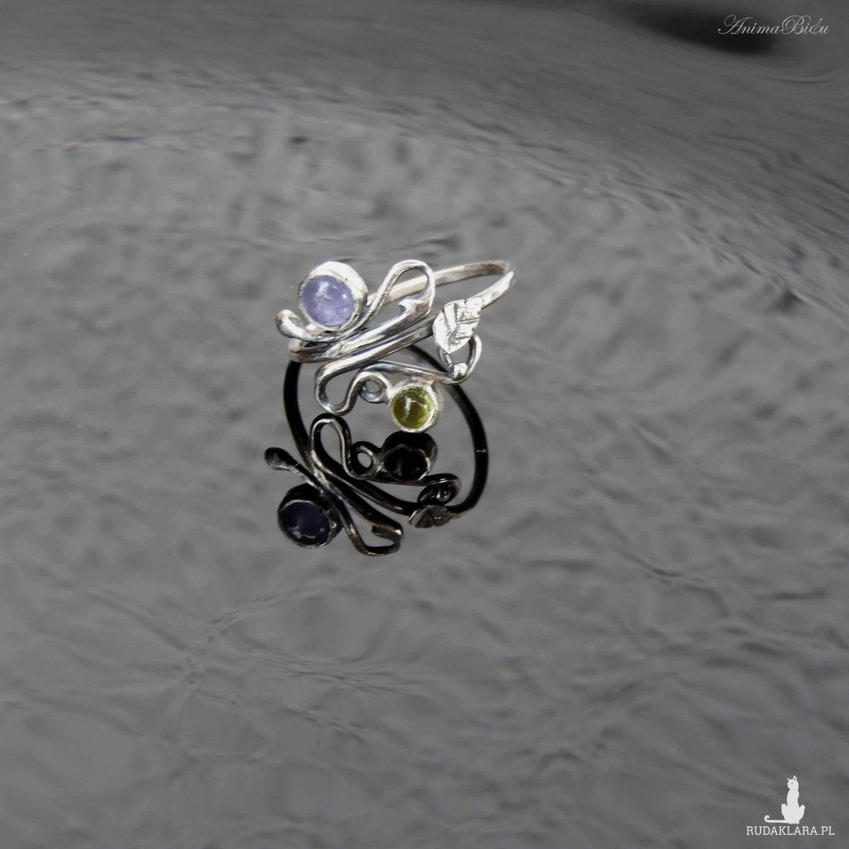 Pierścionek srebrny z oliwinem i tanzanitem. Pierścionek