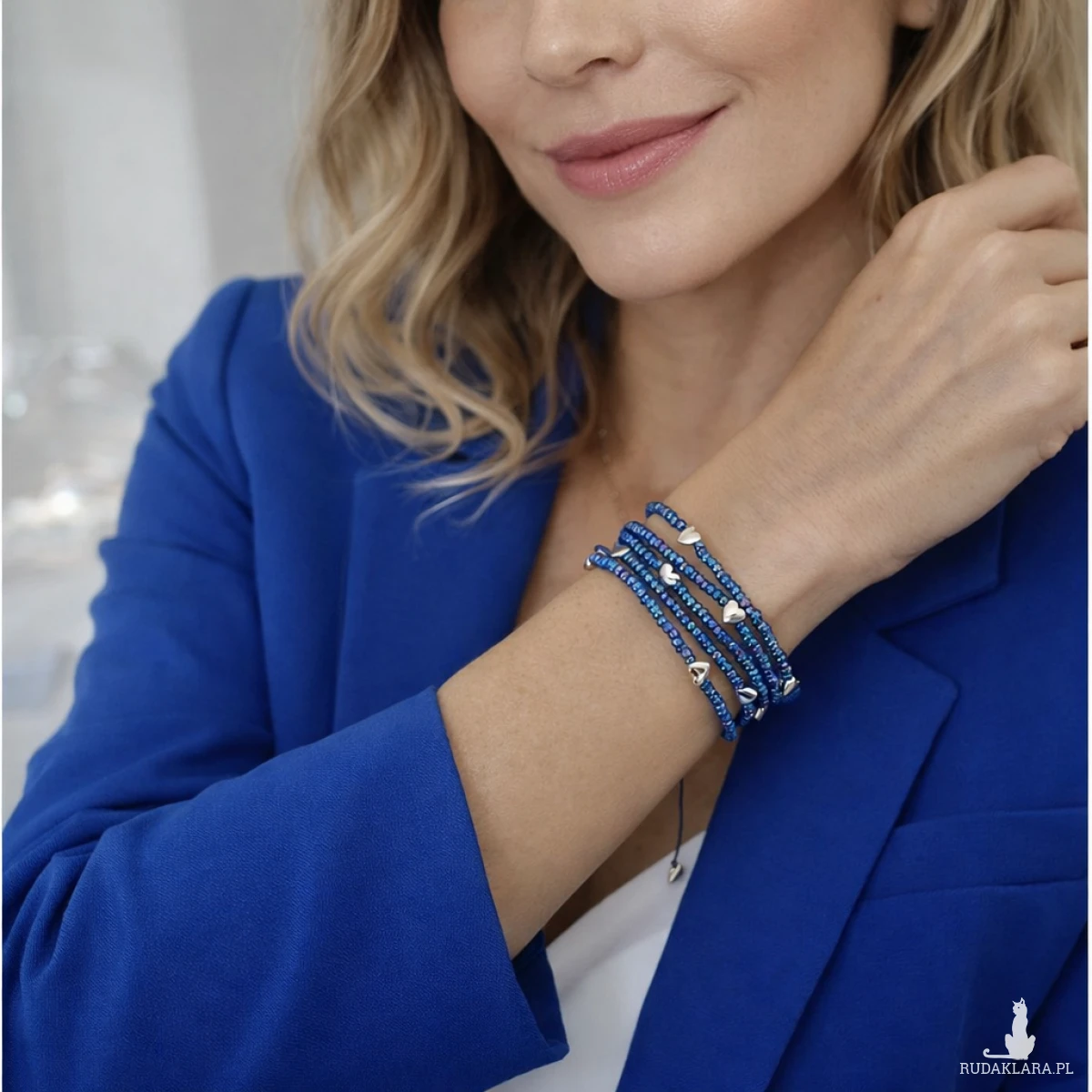 Bransoletka wykonana jest ręcznie z niebieskich koralików i wplecionymi w nią małymi serduszkami z hematytu. Posiada regulowane, makramowe zapięcie. Idealnie komponuje się z każdą stylizacją i dodaje unikalnego charakteru. Można nosić jako naszyjnik