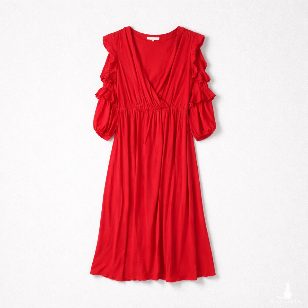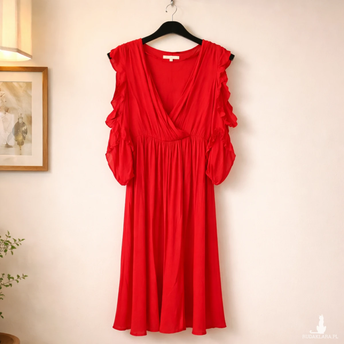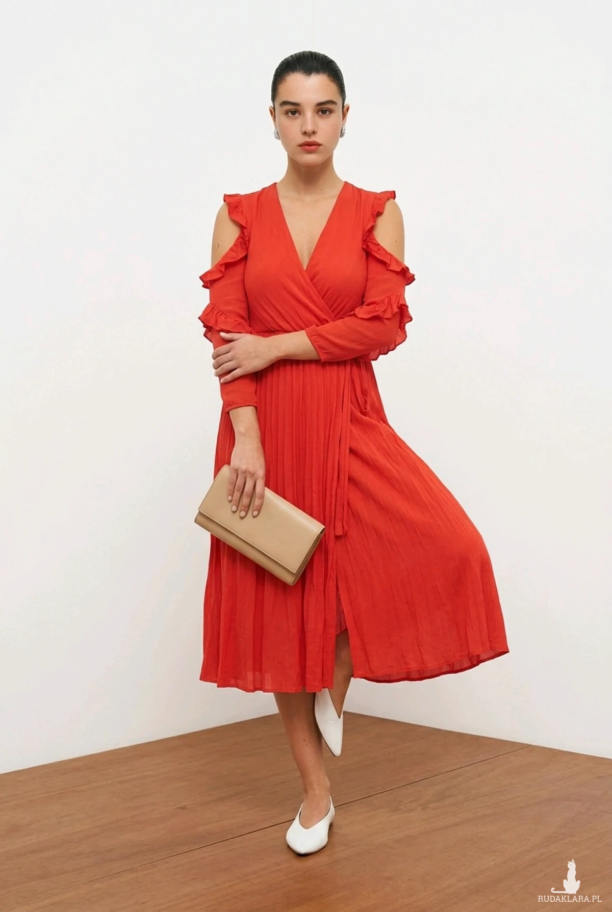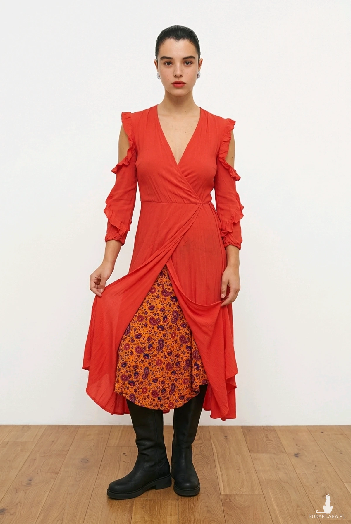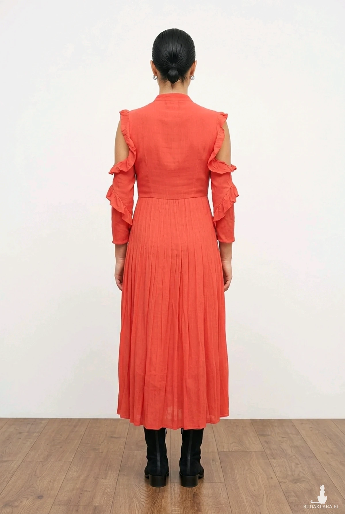 Długa pomarańczowa sukienka w rozmiarze SM przepiękna materiał a la żorżeta w pasie gumka rozciąga się do 88 cm długość całości 130 cm długość rękawa 55 cm wycięcia na ramionach sukienka idealna do noszenia na szerokie spodnie na inną sukienkę jako dodatek tunikę ewentualnie na lato piękna na mnie za mała