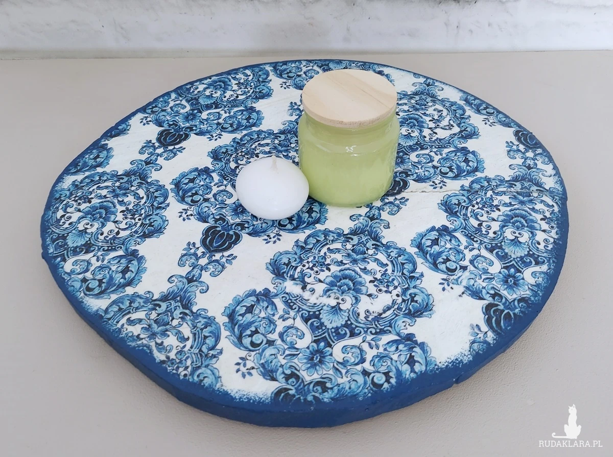 Świece i inne drobiazgi możesz wreszcie zgromadzić na jednej podstawce, a jednocześnie oryginalnej dekoracji. To stary plaster drewna wraz z naturalnymi spękaniami, nierównościami z cięcia oraz przebarwieniami, który został odnowiony w technice decoupage. Średnica ok. 35cm.