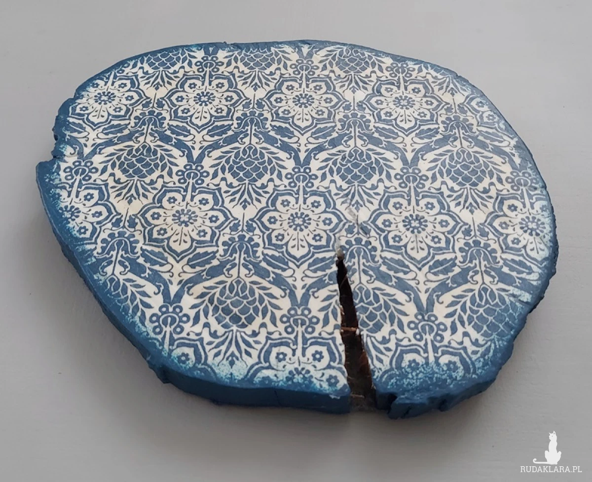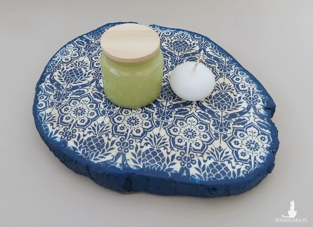 Świece i inne drobiazgi możesz wreszcie zgromadzić na jednej podstawce, a jednocześnie oryginalnej dekoracji. To stary plaster drewna wraz z naturalnymi spękaniami, nierównościami z cięcia oraz przebarwieniami, który został odnowiony w technice decoupage. Średnica ok. 23 cm.