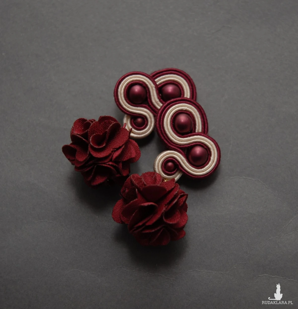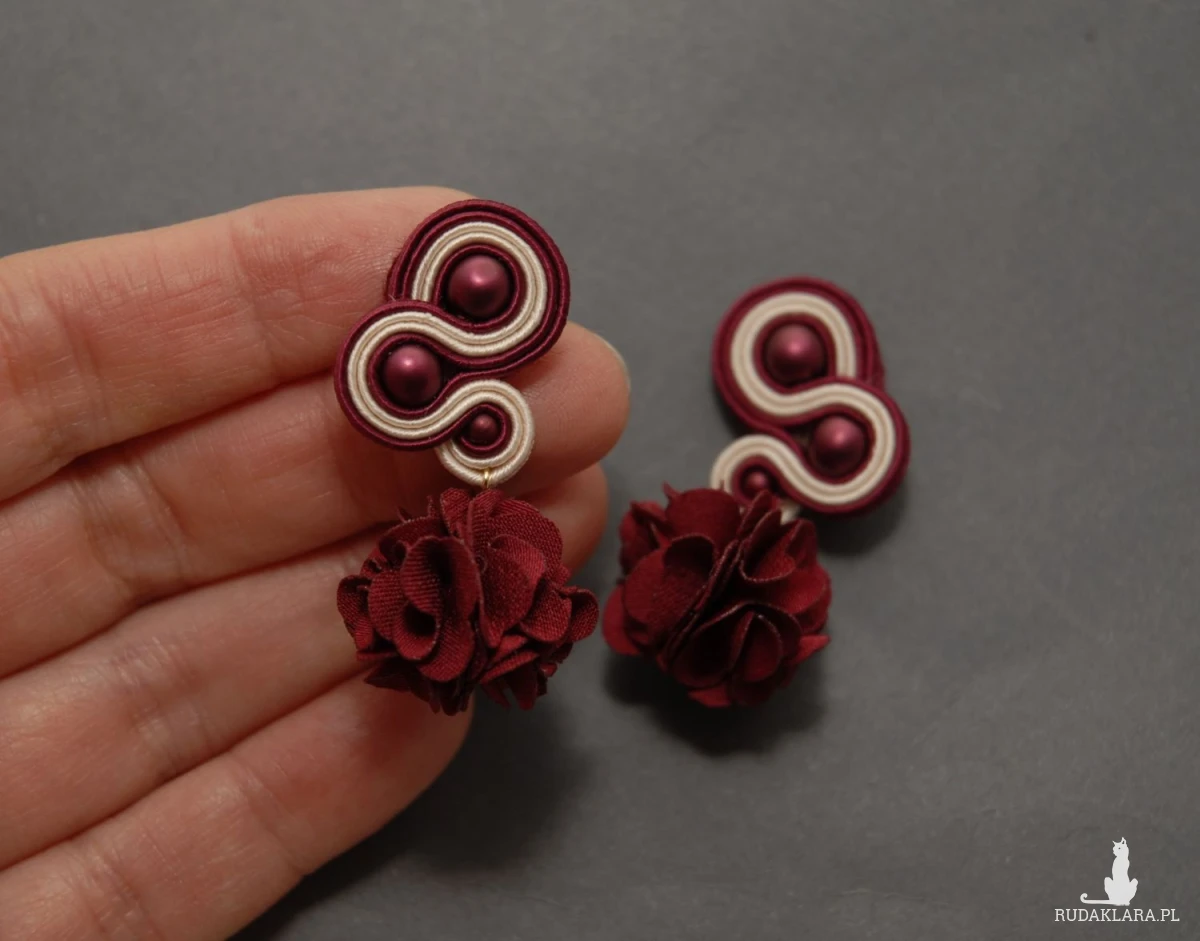 bordowo-kremowe kolczyki lub klipsy sutasz z kwiatkami