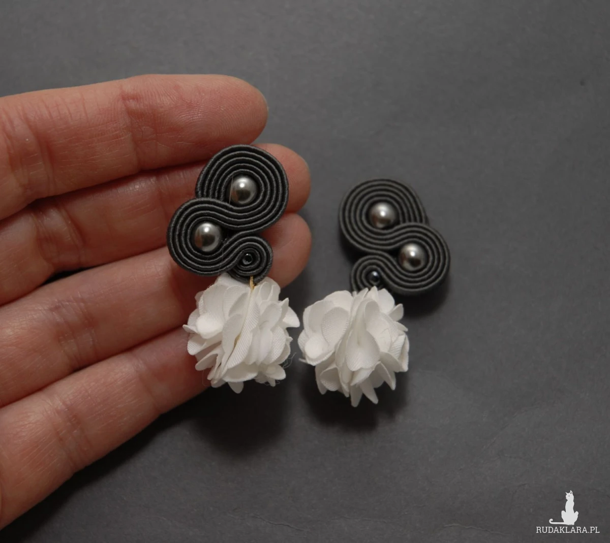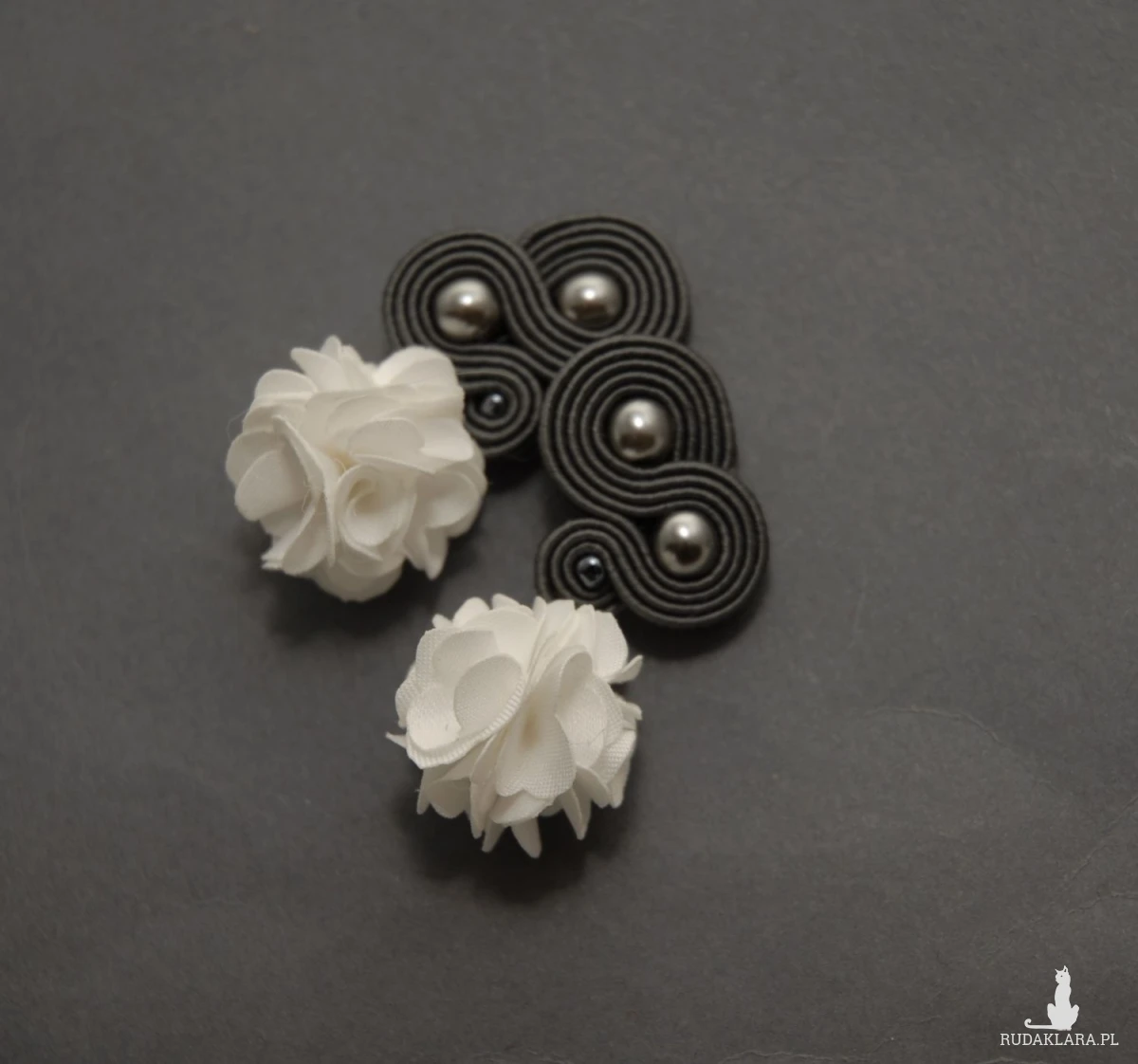 grafitowo-białe kolczyki lub klipsy sutasz z kwiatkami