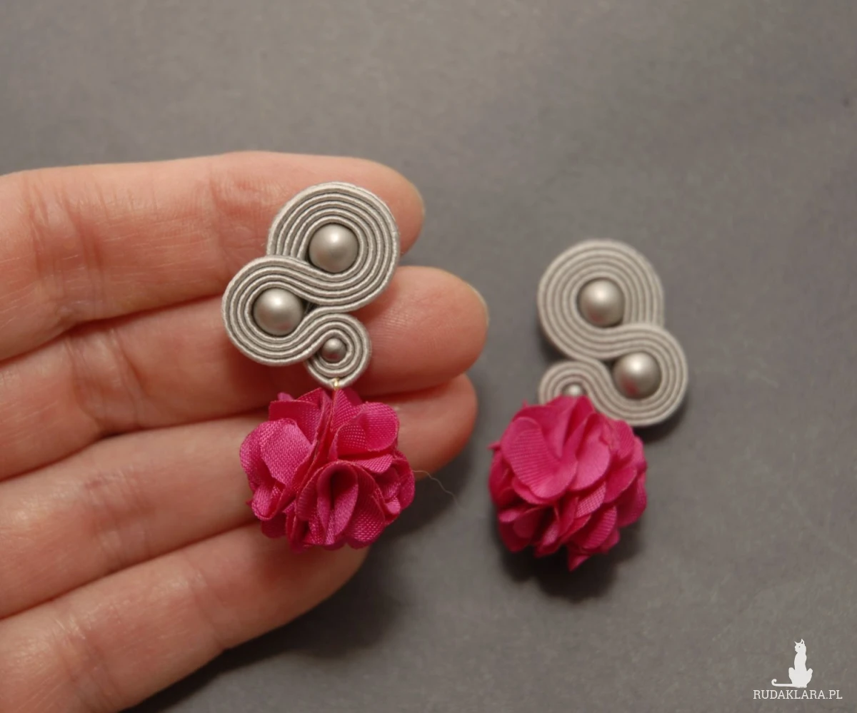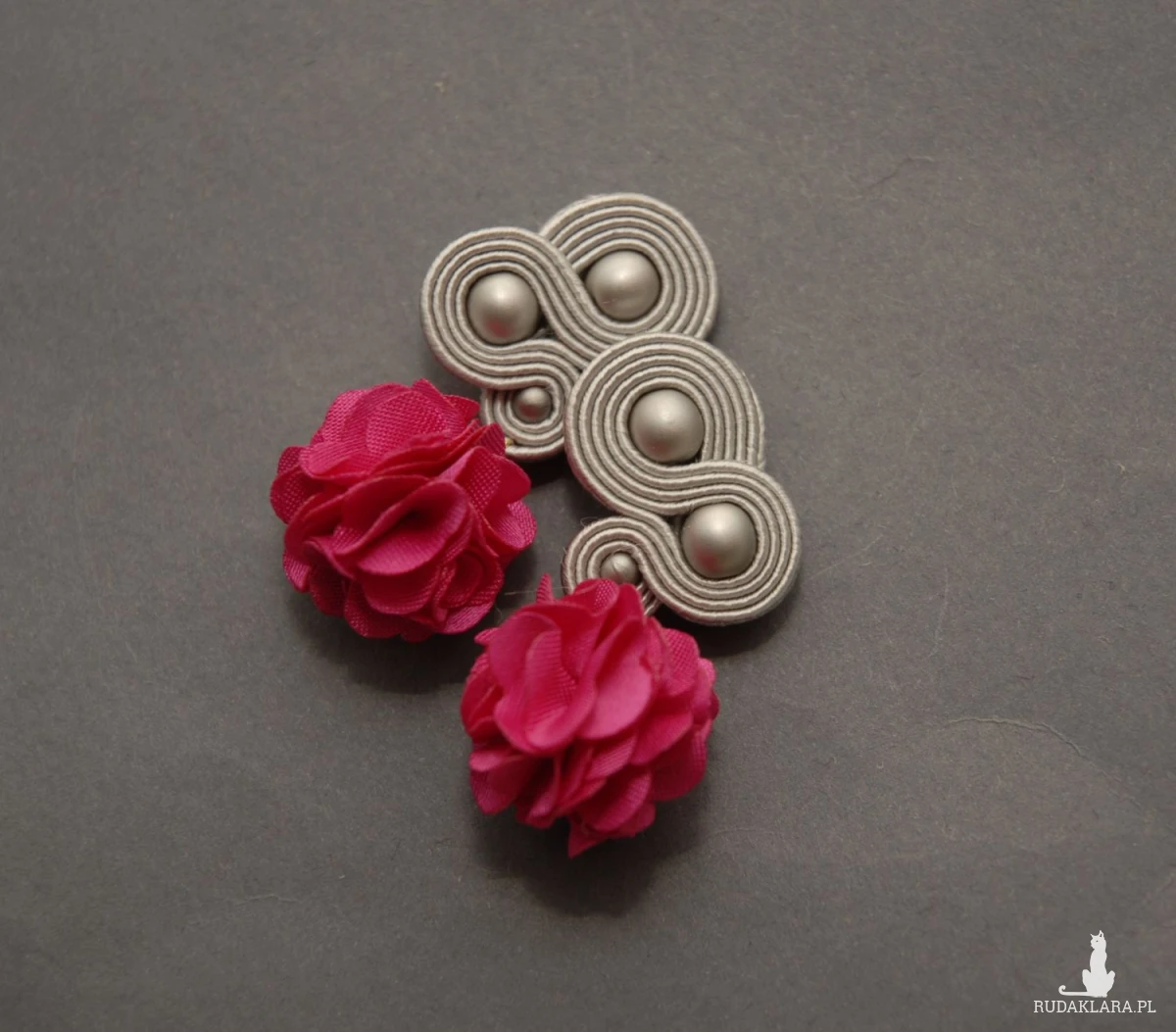 szaro-fuksjowe kolczyki lub klipsy sutasz z kwiatkami