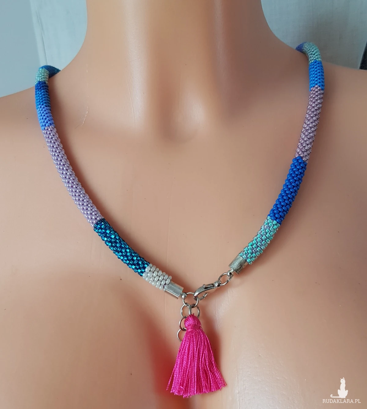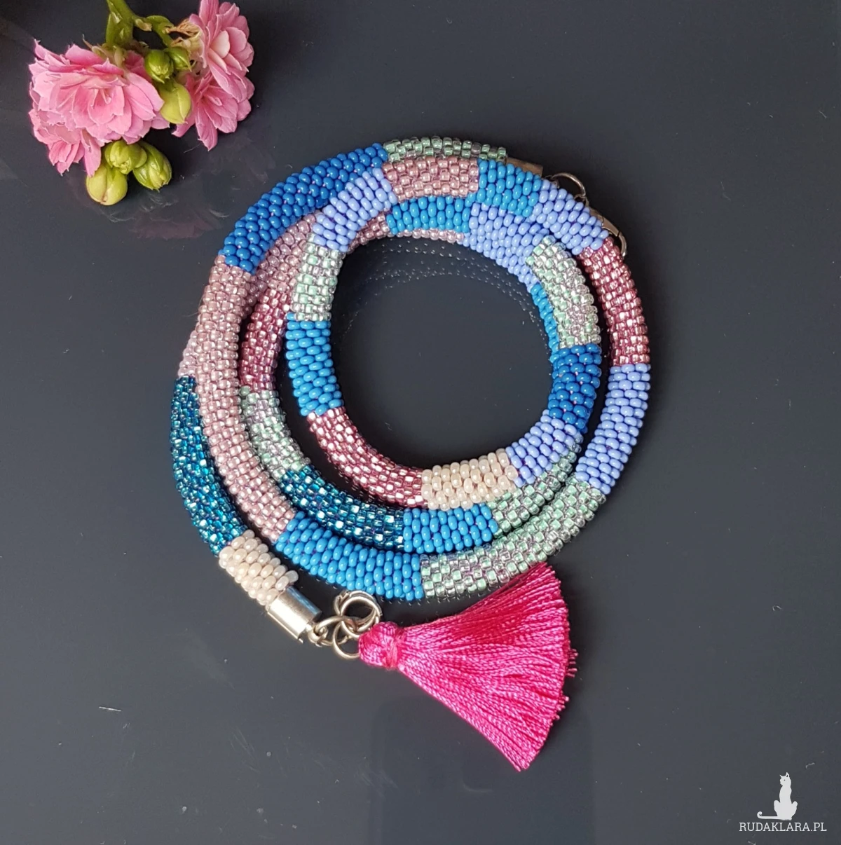 Bransoletka z koralików szklanych czterokrotnie owijana wokół nadgarstka, z amarantowym chwostem, dł całego sznura 70 cm, można nosić jako naszyjnik.