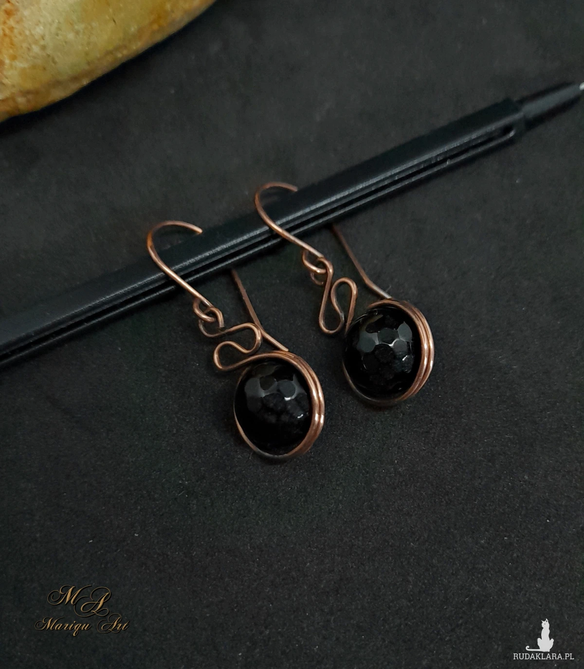 Piękne kolczyki wykonane ręcznie z fasetowanego czarnego jadeitu, oplecione oksydowaną miedzią, która podkreśla naturalne piękno kamienia. Subtelny, artystyczny skręt drutu dodaje kolczykom lekkości i wyjątkowego charakteru.