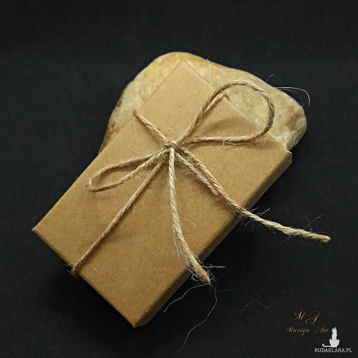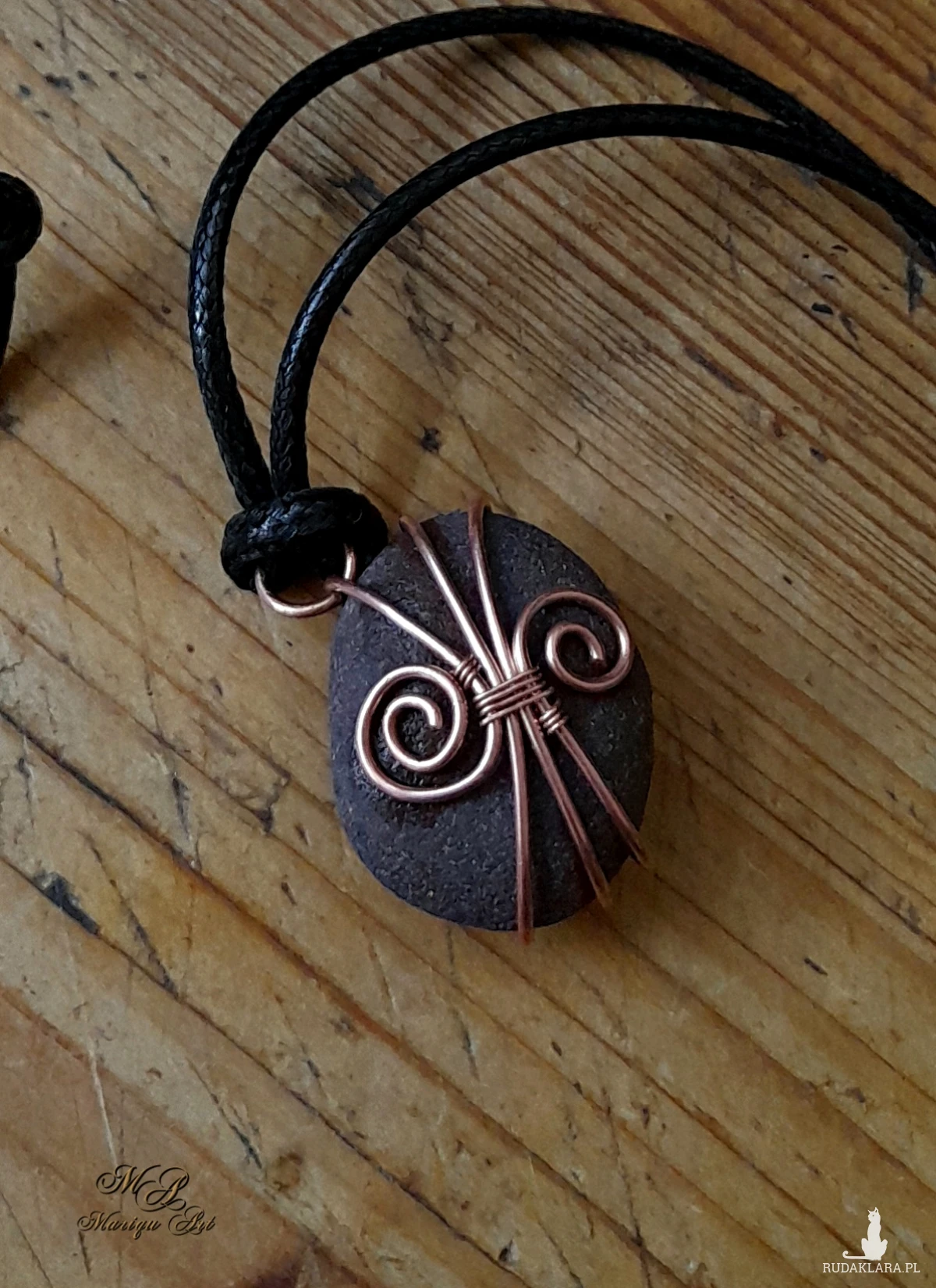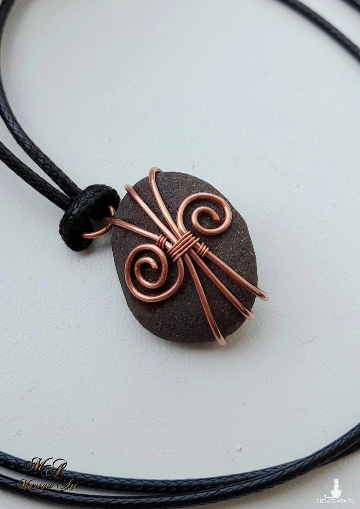 Unikatowy, naturalny kamień znaleziony nad brzegiem morza, starannie oprawiony w nieoksydowaną miedź metodą wire wrapping. Kamień ma wymiary 2,5 cm x 2 cm, a całość zawieszona jest na bawełnianym woskowanym sznurku, co podkreśla jego naturalny charakter. Idealny jako subtelny akcent codziennej biżuterii lub wyjątkowy prezent dla miłośników natury.
