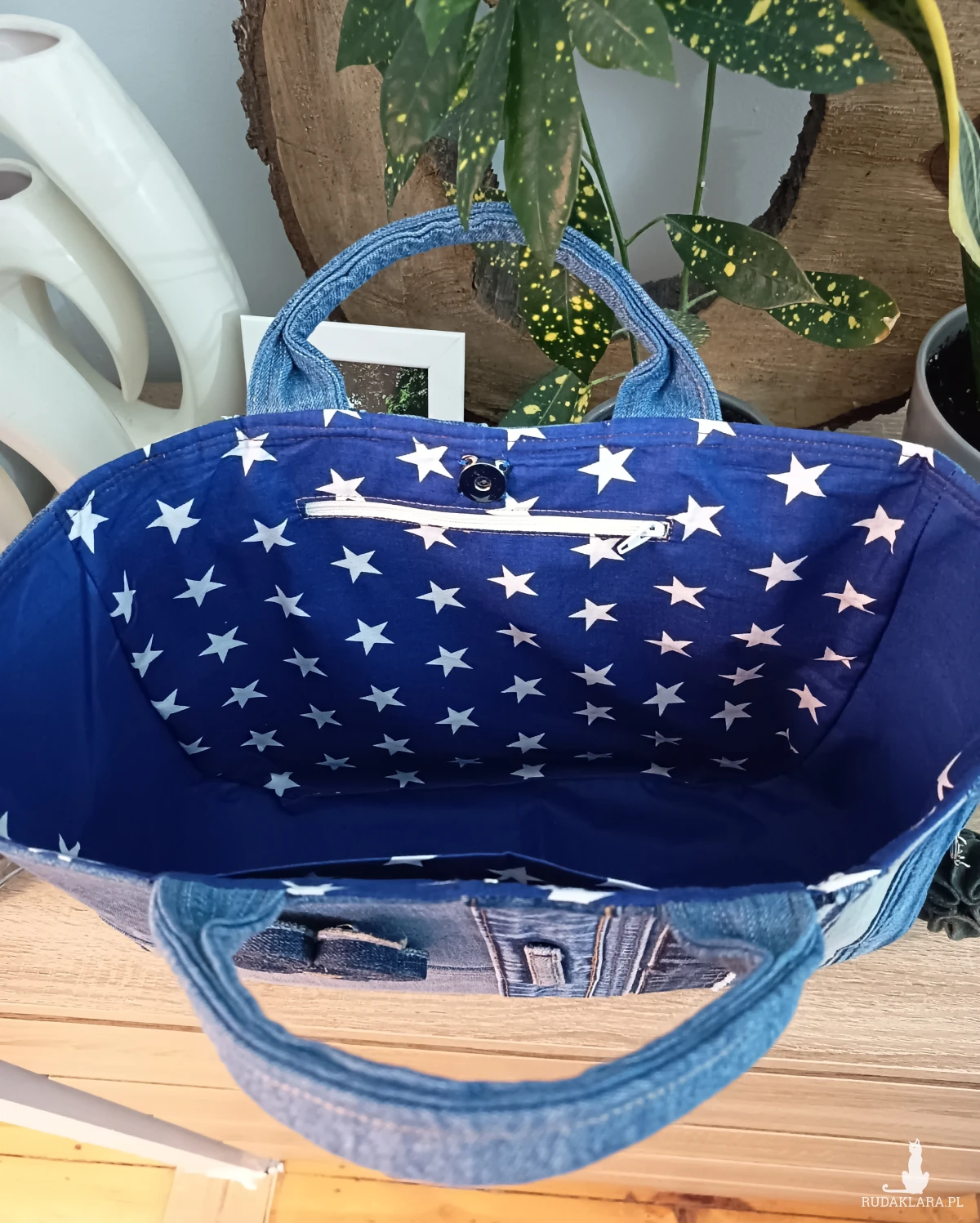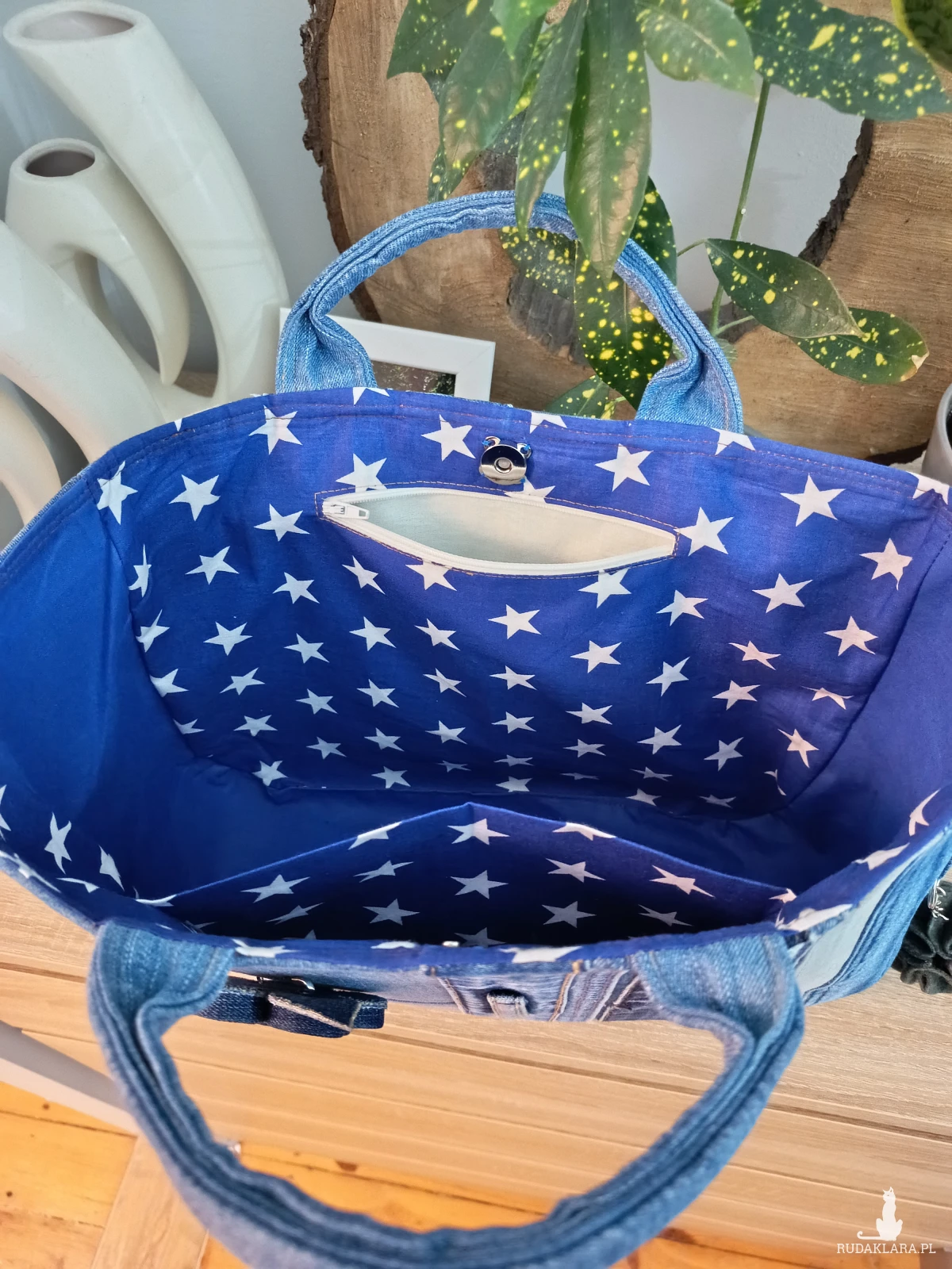 Wnętrze wykończone bawełnianą podszewką, wyposażone w dwie kieszonki, w tym jedną zapinaną na zamek. Torebka zamykana jest na magnetyczny zatrzask.
