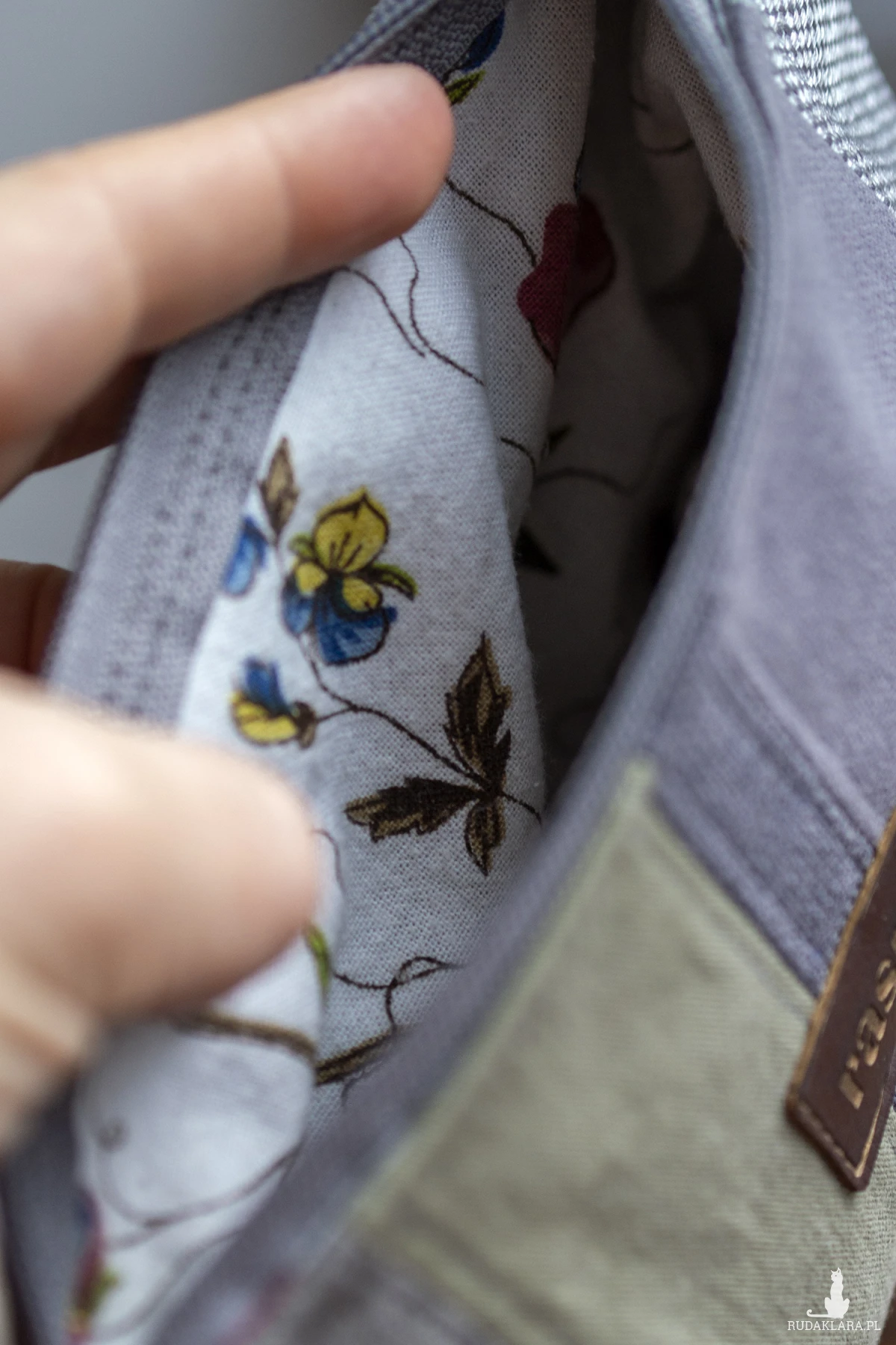 Średniej wielkości kosmetyczka wykonana kilku rodzajów tkanin. Stworzona w duchu no waste.