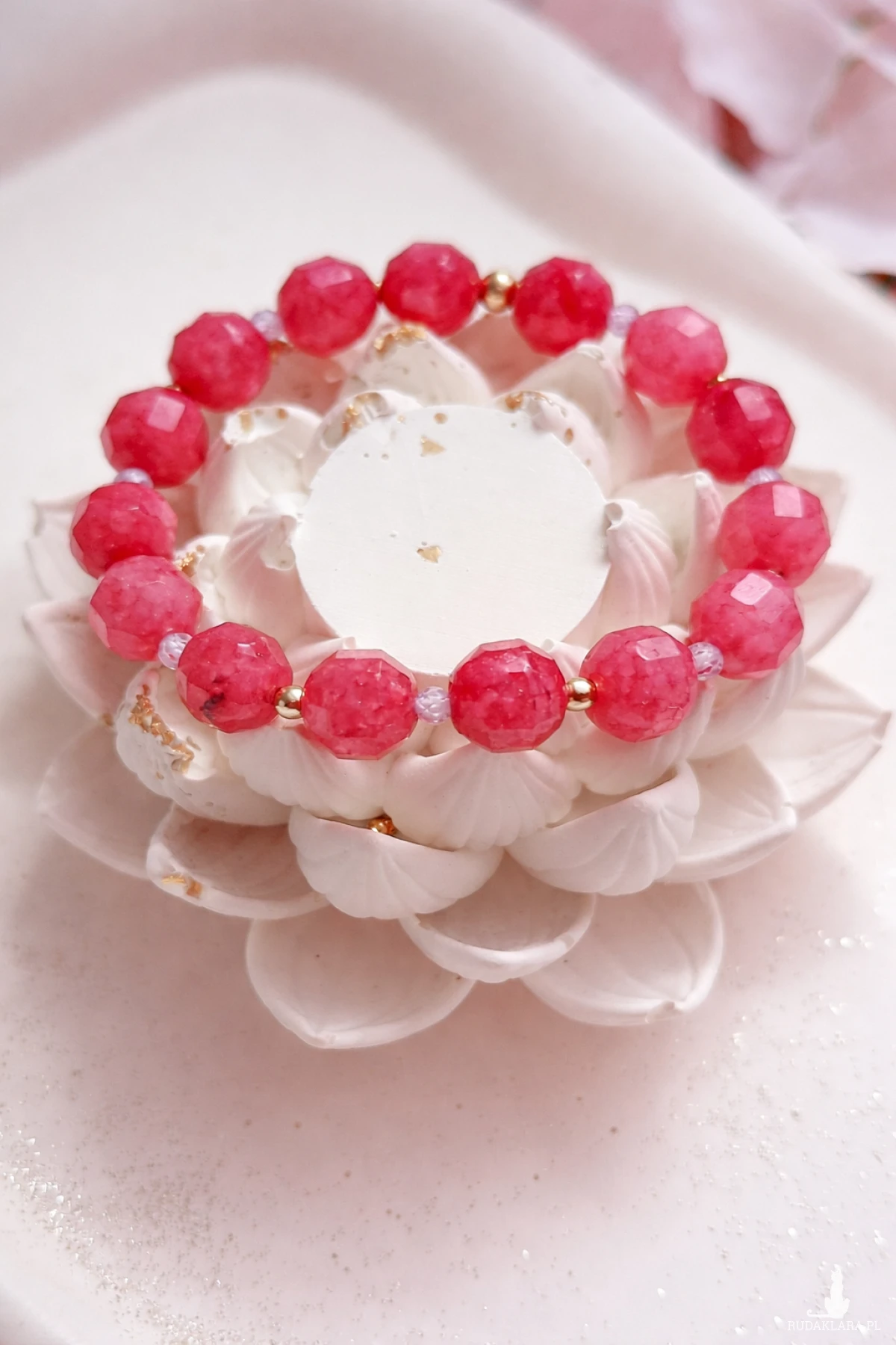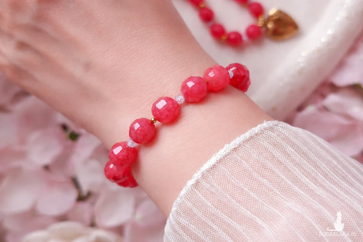 Wyjątkowa bransoletka wykonana z ciosanego rodochrozytu w pięknym malinowo-różowym odcieniu. Fasetowane kamienie subtelnie odbijają światło, dzięki czemu bransoletka delikatnie błyszczy i przyciąga wzrok.