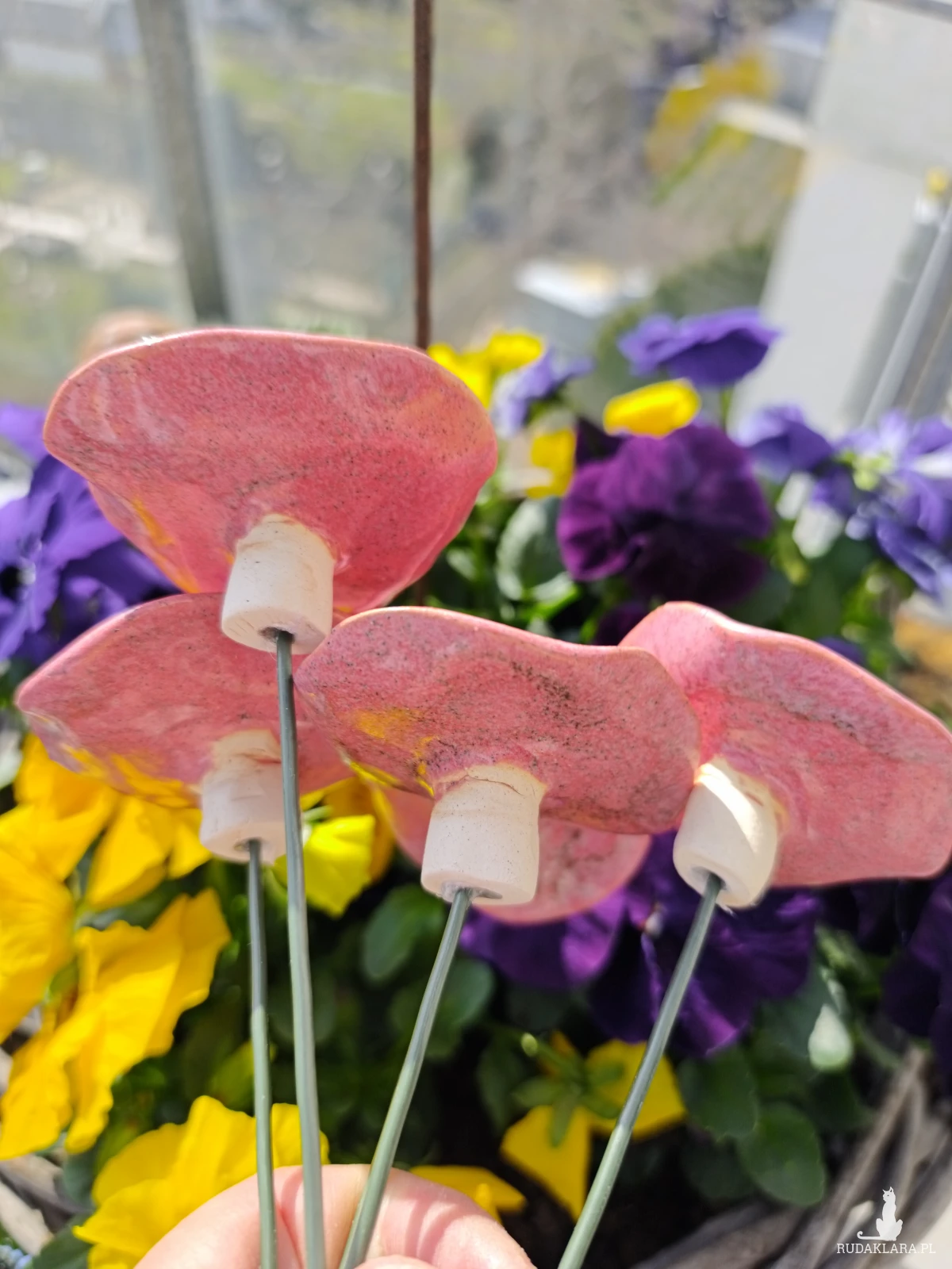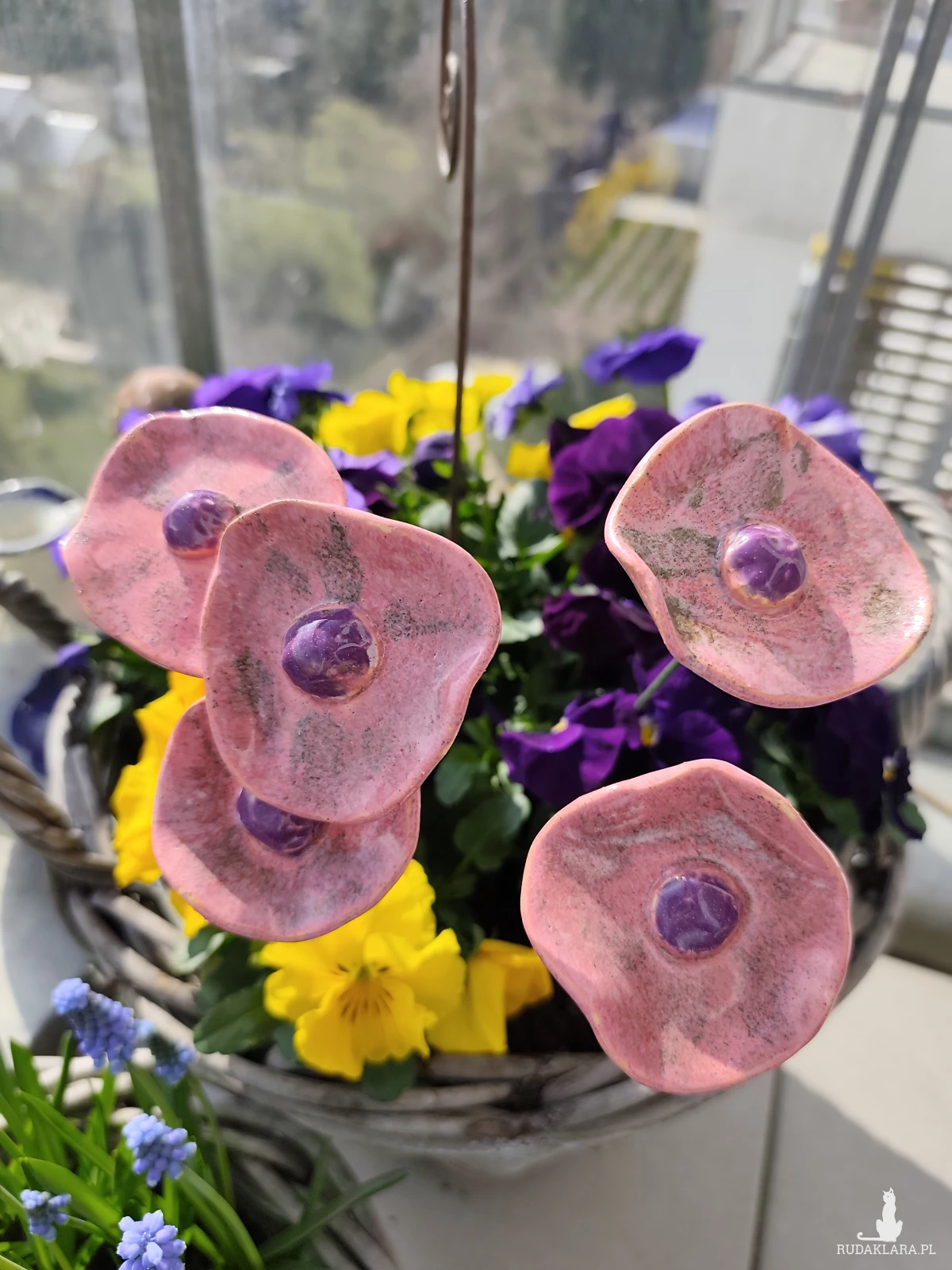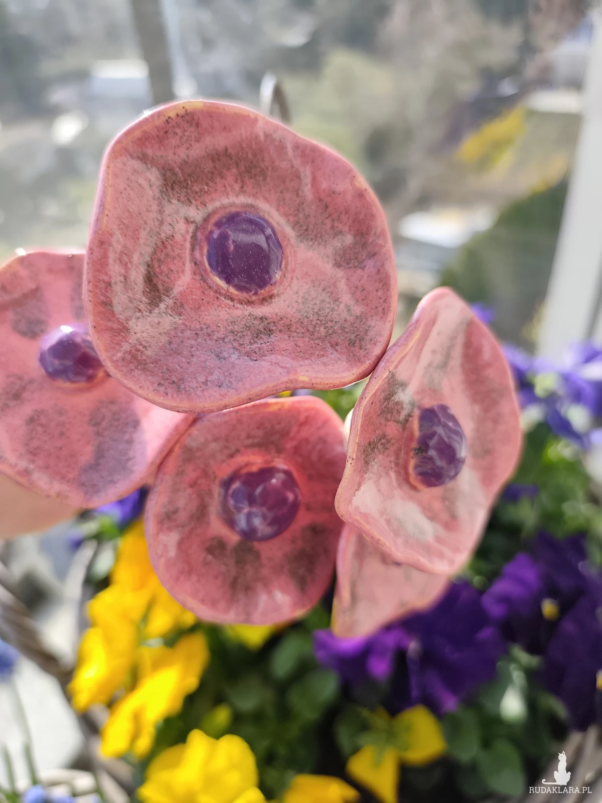 Kwiaty ceramiczne 5 szt, wykonane ręcznie z gliny szamotowej, szkliwione i dwukrotnie wypalane w piecu ceramicznym na 1050 stopni. Polecam do domu, na balkon lub do ogrodu. Średnica około 6 cm. Nie przekwitają :)