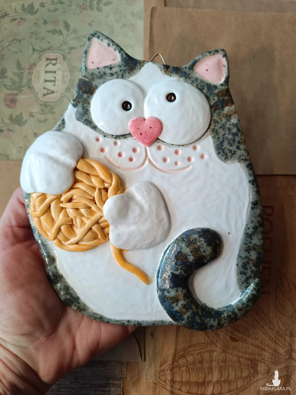 Zawieszka kota wykonana z gliny szamotowej wypalona na biskwit, a następnie szkliwiona w temperaturze 1260 stopni C. Wymiary 14 x 17 cm. Z tyłu mocowanie w postaci haczyka. Serdecznie polecam wszystkim miłośnikom kotów.