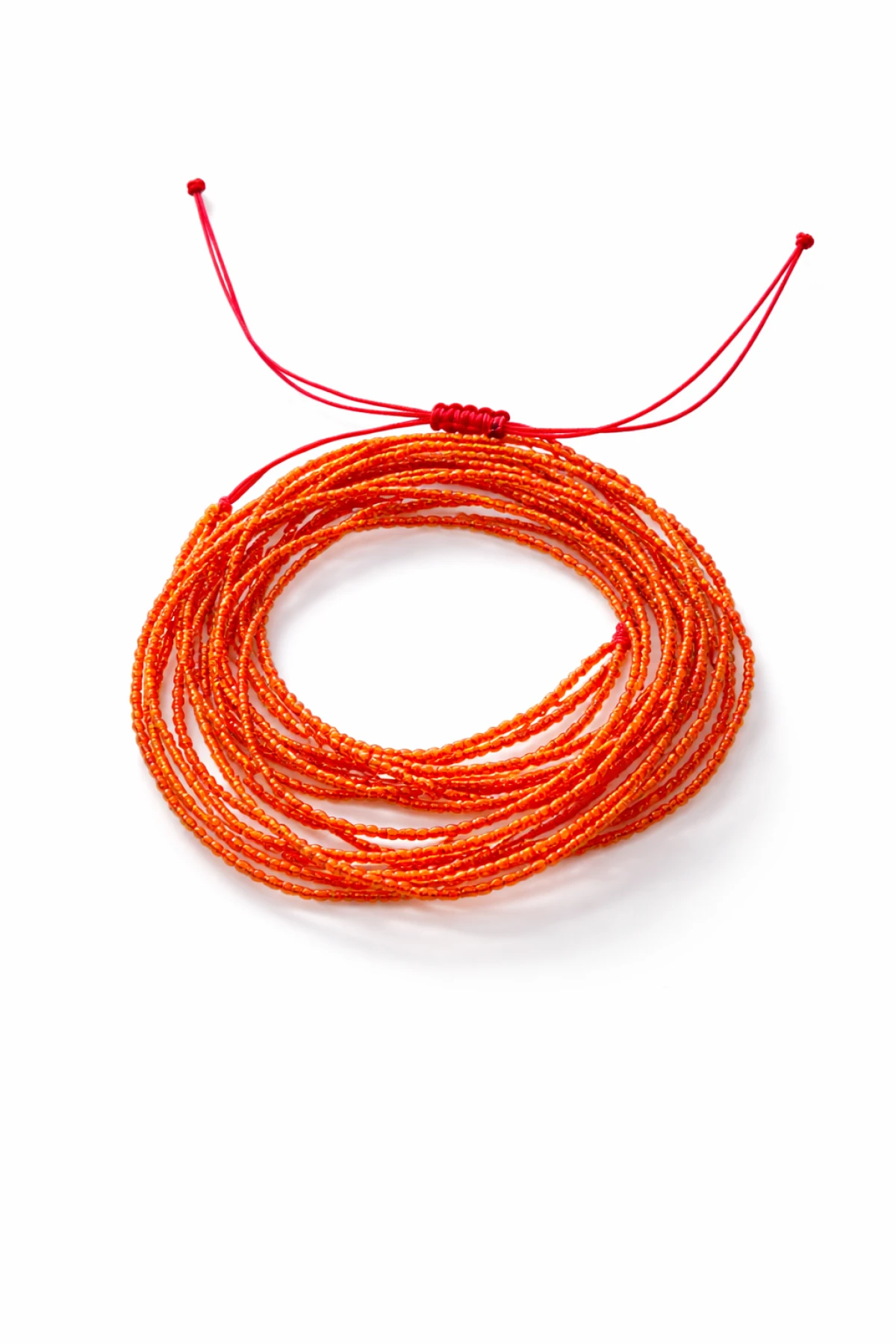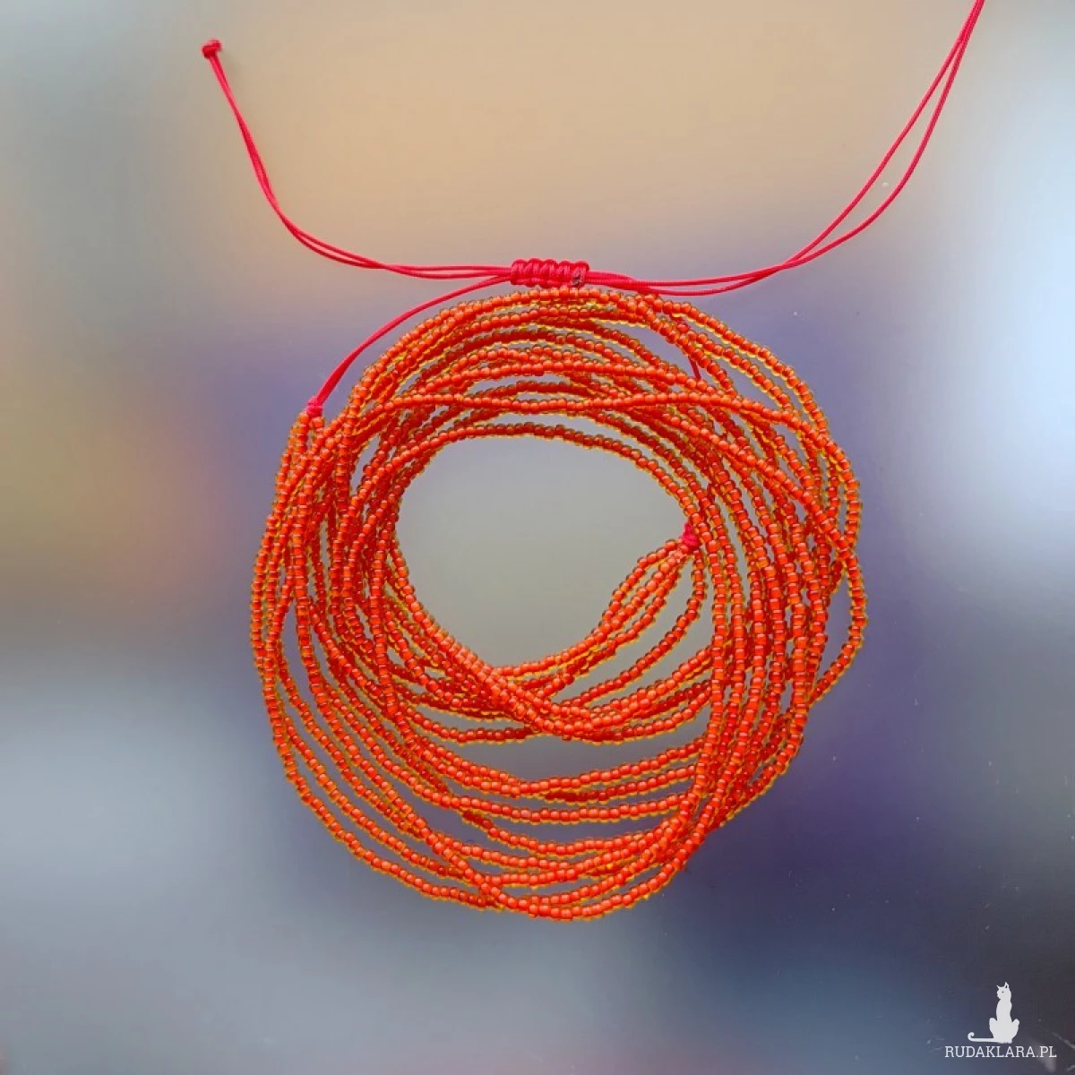 Bransoletka, naszyjnik w jednym to wygodna forma biżuterii, nosimy w zależności od potrzeby i nastroju. wygląda znakomicie jako dlugi naszyjnik, ale równie dobrze prezentuje się na nadgarstku. Można ją wzbogacić dokladając skromna zlota celebrytkę. Objętość bransoletki uniwersalna. Koraliki pomarańczowo czerwone w mocnym kolorze. Długość naszyjnika 49 cm