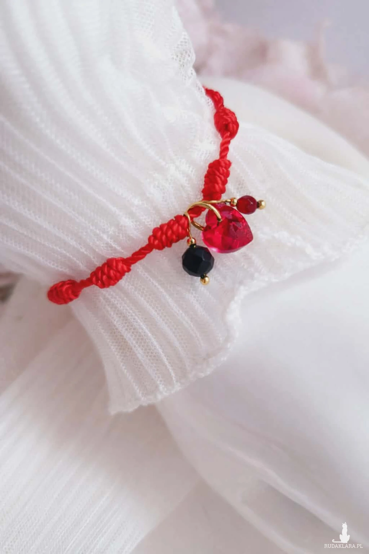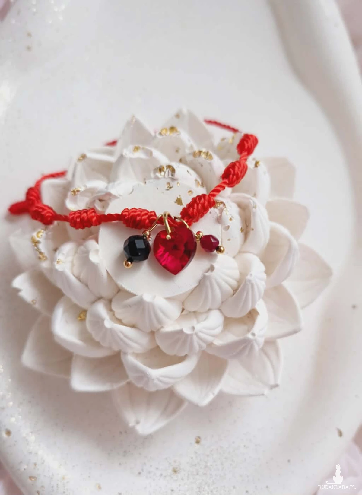 Centralnym elementem jest kryształowe serce Swarovski, które symbolizuje czystość uczuć, miłość oraz piękno energii płynącej prosto z serca. Jego blask przyciąga dobre wibracje i przypomina o tym, że najważniejsza siła zawsze rodzi się wewnątrz nas. Towarzyszą mu dwa wyjątkowe kamienie: Czarny turmalin – jeden z najsilniejszych kamieni ochronnych. Tworzy energetyczną tarczę, która pomaga chronić przed negatywną energią, zazdrością i złymi intencjami. Wspiera stabilność emocjonalną, uziemia i przywraca poczucie bezpieczeństwa. Granat – kamień odwagi i życiowej siły. Pobudza wewnętrzną energię, wzmacnia determinację i pomaga iść za głosem serca. Od wieków uważany jest za kamień pasji, ochrony i witalności. Połączenie tych energii sprawia, że bransoletka staje się małym talizmanem ochrony i mocy, który przypomina, że Twoje serce jest Twoją największą siłą. Bransoletka wykonana jest na regulowanym czerwonym sznurku, symbolizującym ochronę, szczęście i dobrą energię. Każde zamówienie pakowane jest w logowane pudełko CUDowny Szept, gotowe do wręczenia jako wyjątkowy prezent.