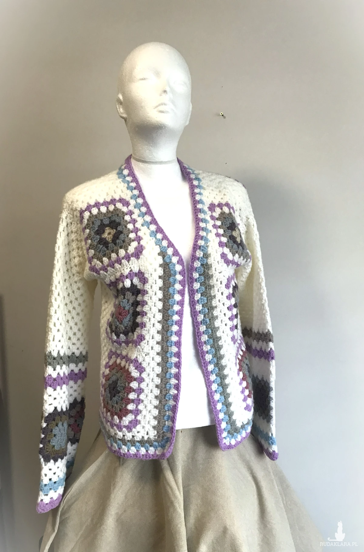 Oryginalny, ręcznie wykonany krótki kardigan; miękki (włóczka akrylowa), rozmiar uniwersalny, pojedynczy egzemplarz. Może stanowić ciekawą propozycję bądź uzupełnienie wiosennych stylizacji.