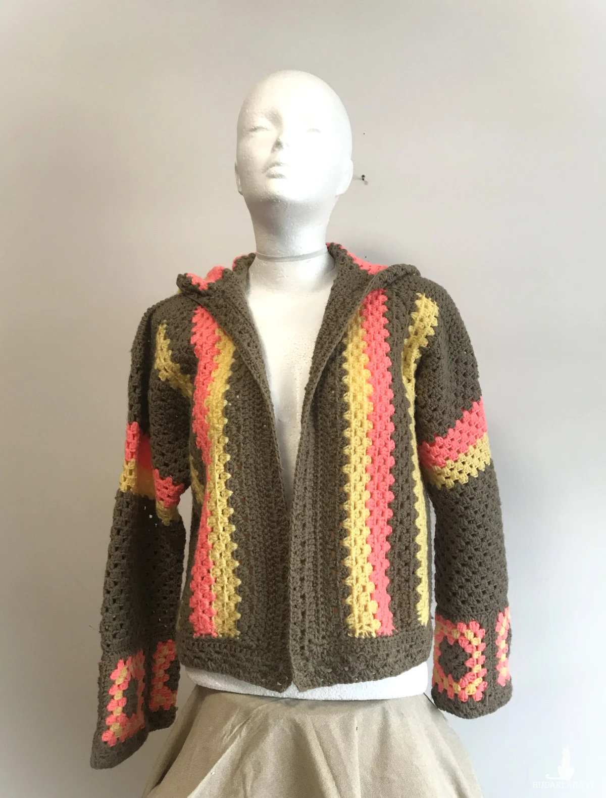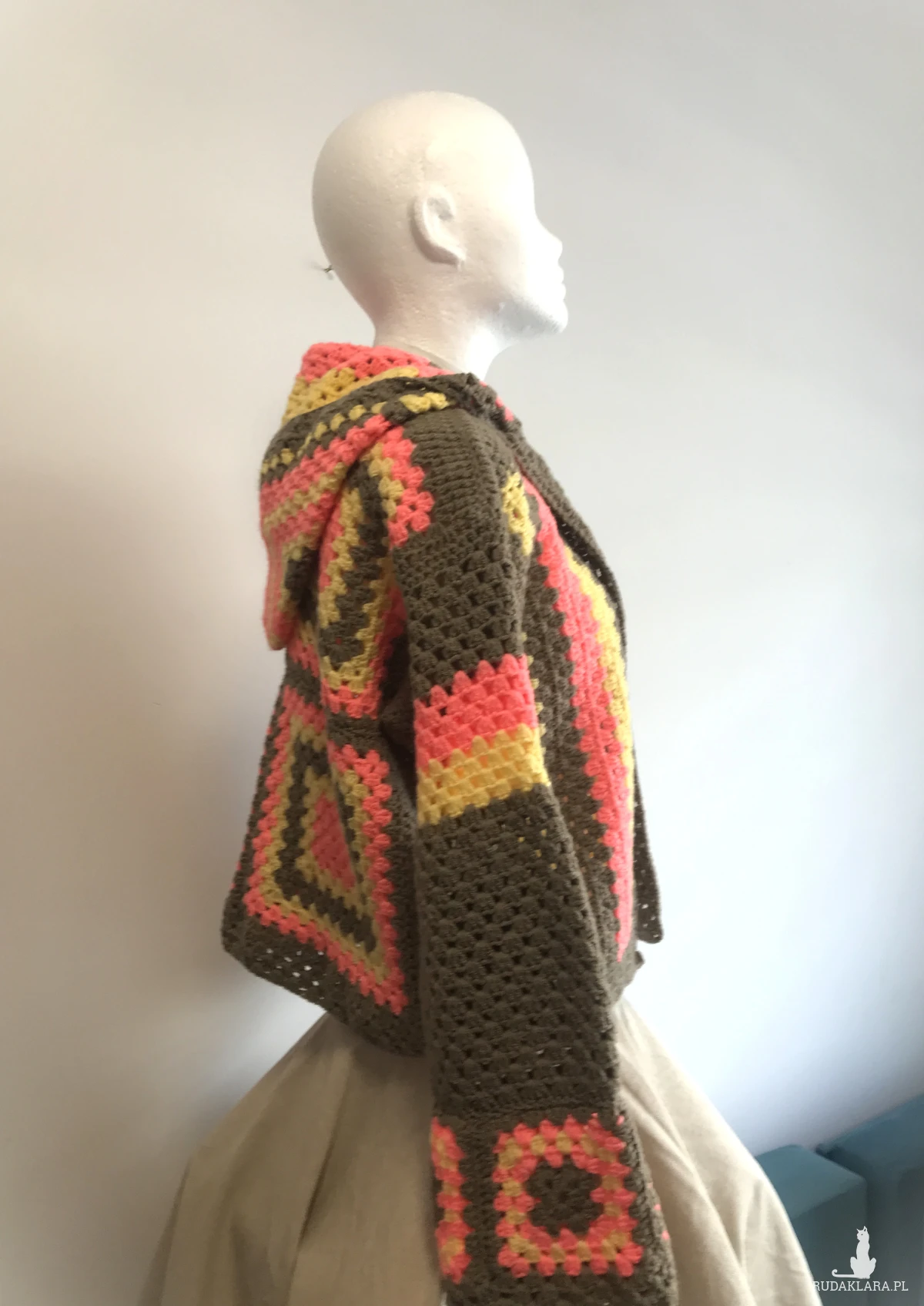 Oryginalny, ręcznie wykonany krótki kardigan; miękki (włóczka akrylowa), rozmiar uniwersalny, pojedynczy egzemplarz. Może stanowić ciekawą propozycję bądź uzupełnienie wiosennych stylizacji.