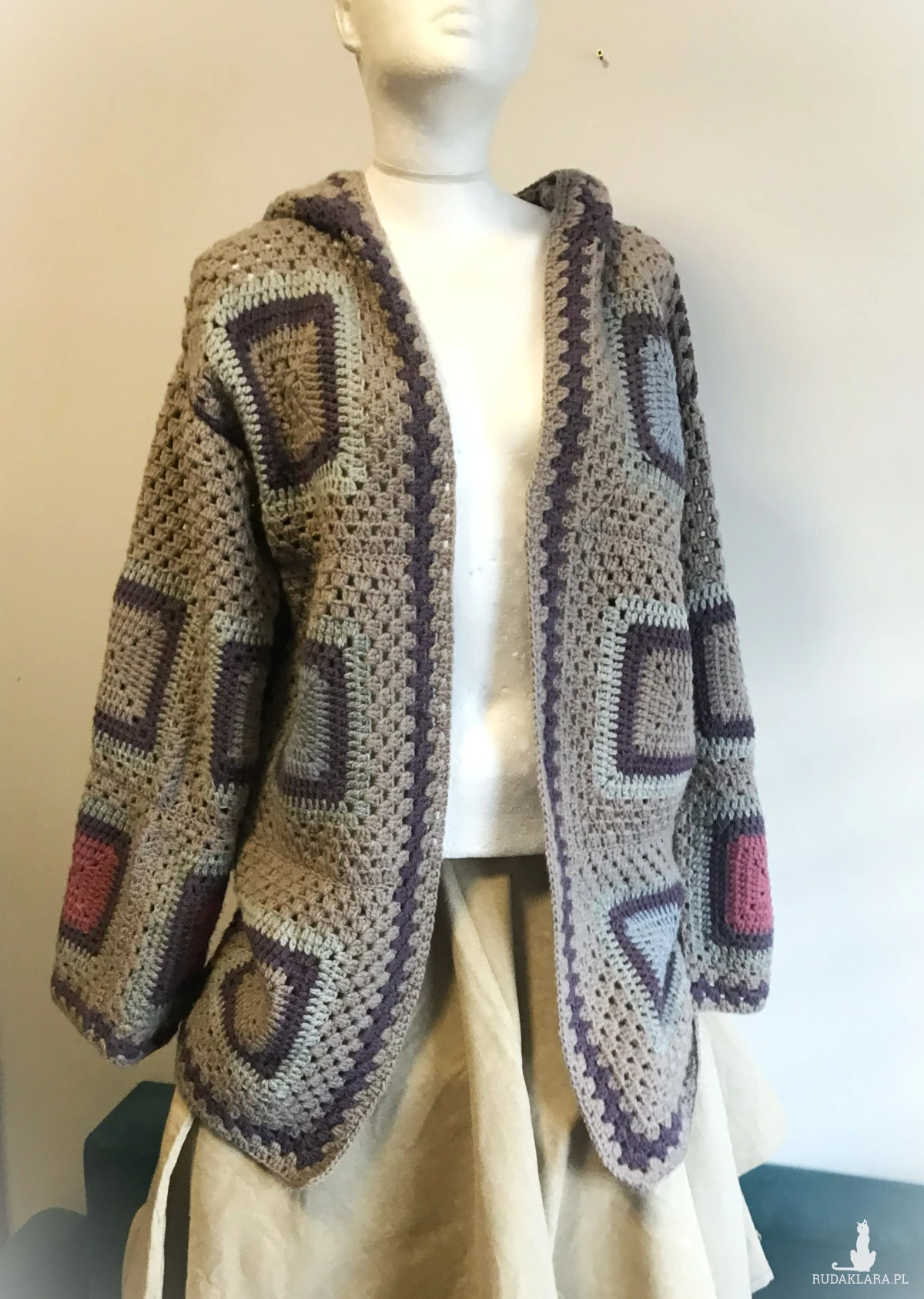 Oryginalny, ręcznie wykonany dłuższy kardigan; miękki (włóczka akrylowa), rozmiar uniwersalny, pojedynczy egzemplarz. Może stanowić ciekawą propozycję bądź uzupełnienie wiosennych stylizacji.
