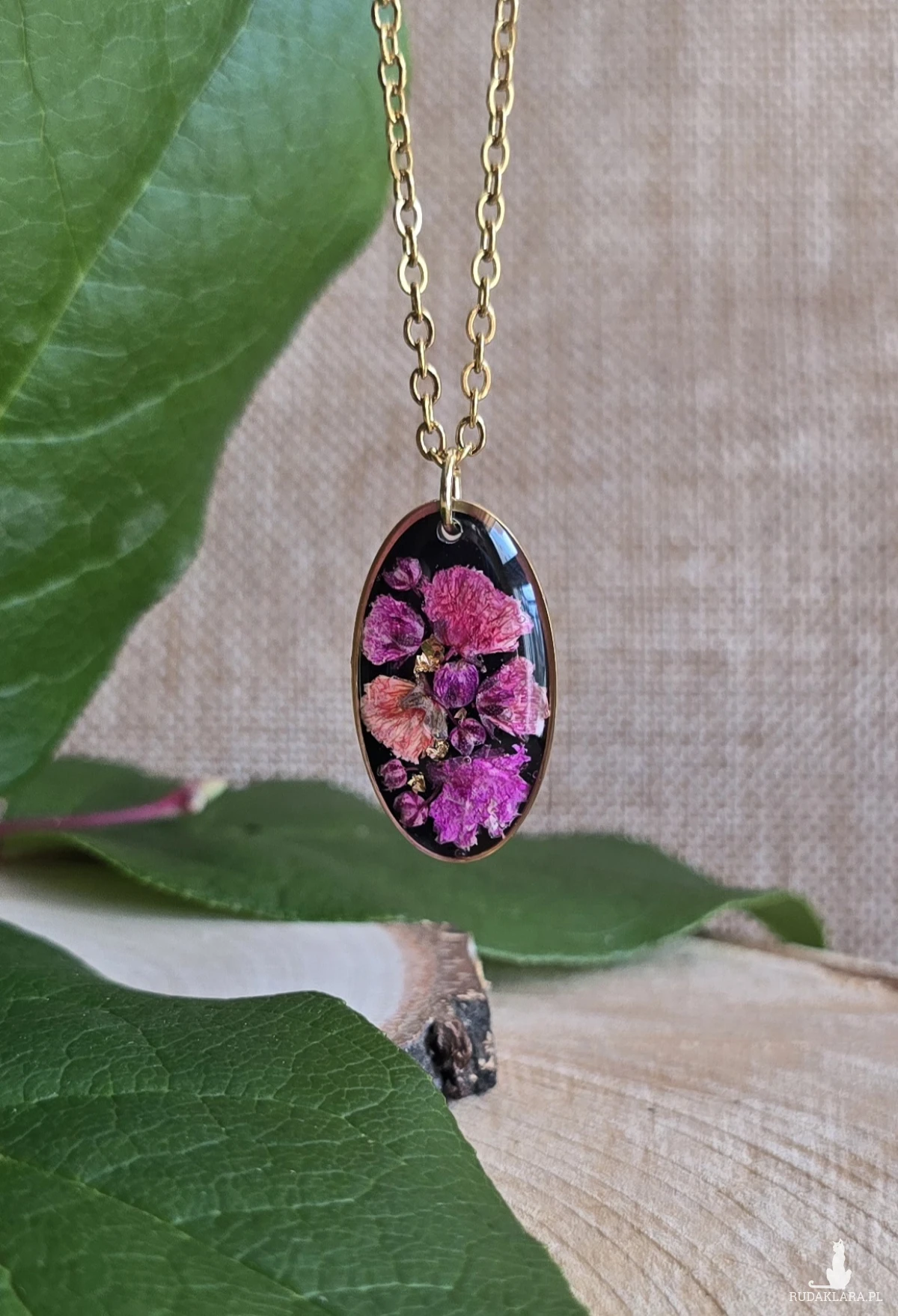 Oferuję Państwu unikalną biżuterię. Zawieszka jest wykonana z suszonych kwiatów i żywicy epoksydowej. Biżuteria jest wspaniałym i oryginalnym prezentem na lata.