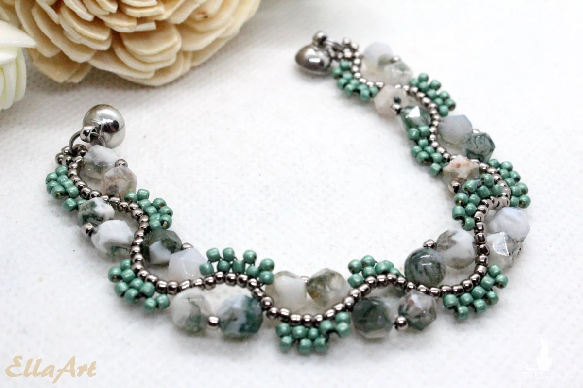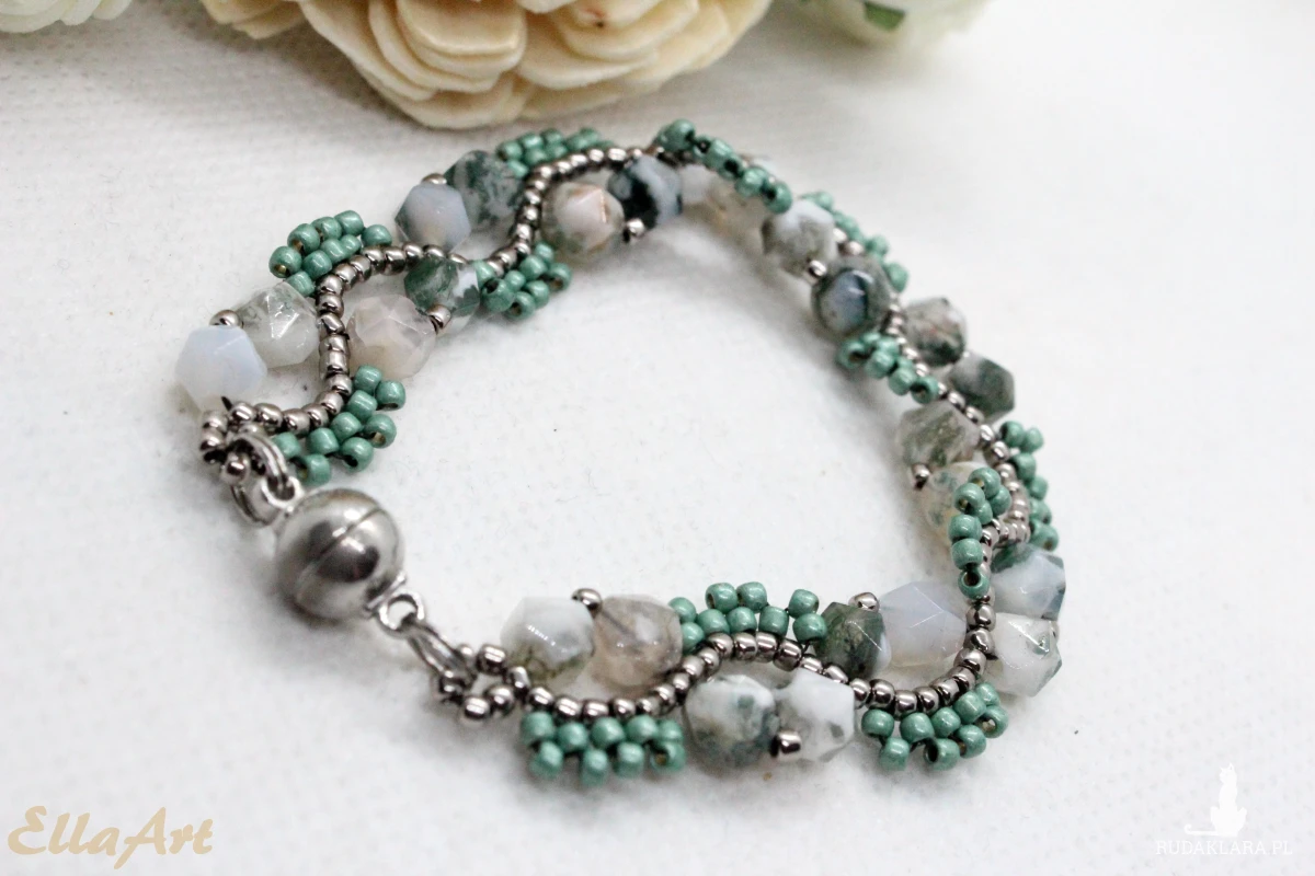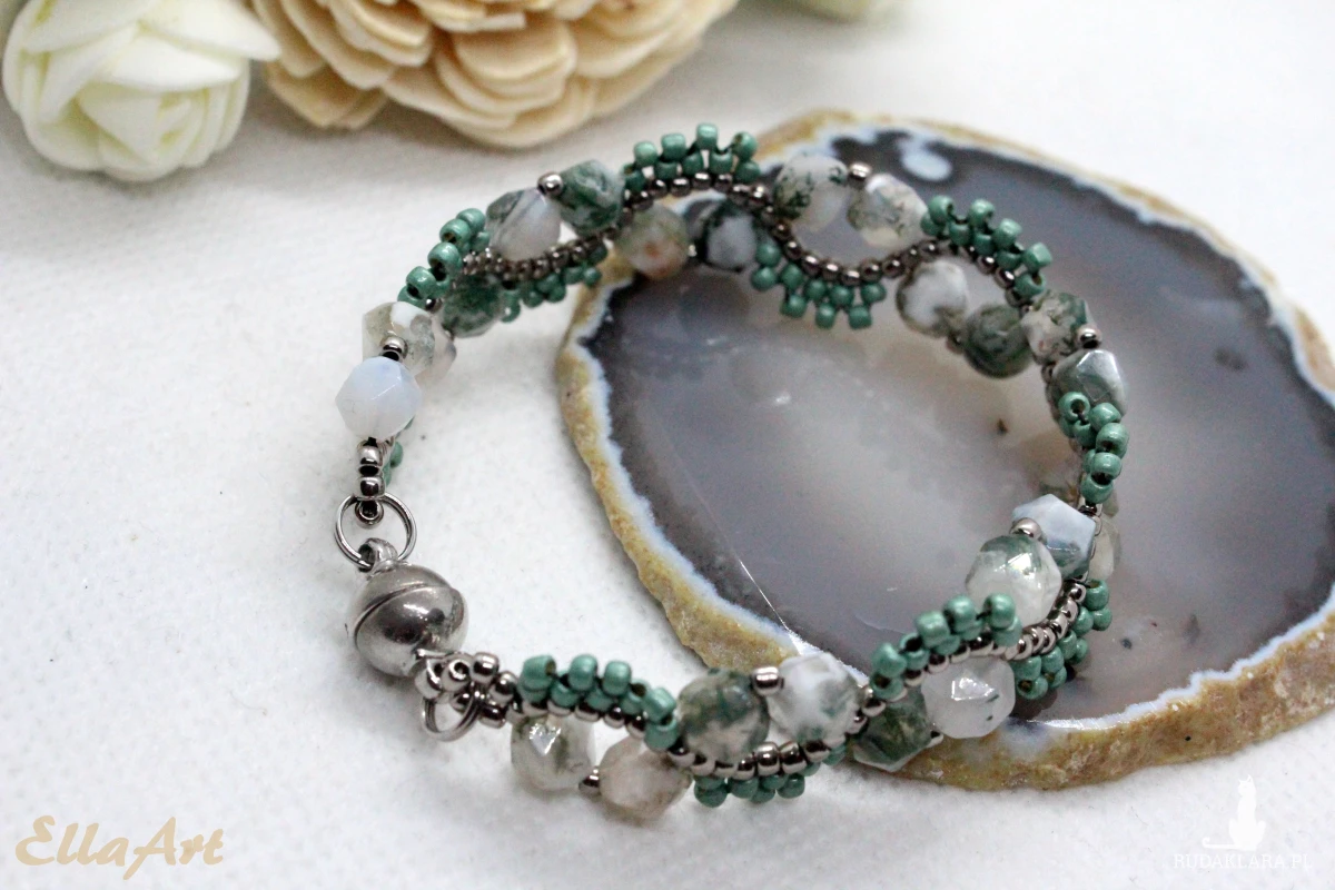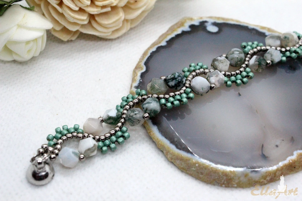 Bransoletka uszyta z kamieni naturalnych agatu mszystego oraz drobniutkich, szklanych koralików japońskiej firmy Toho.