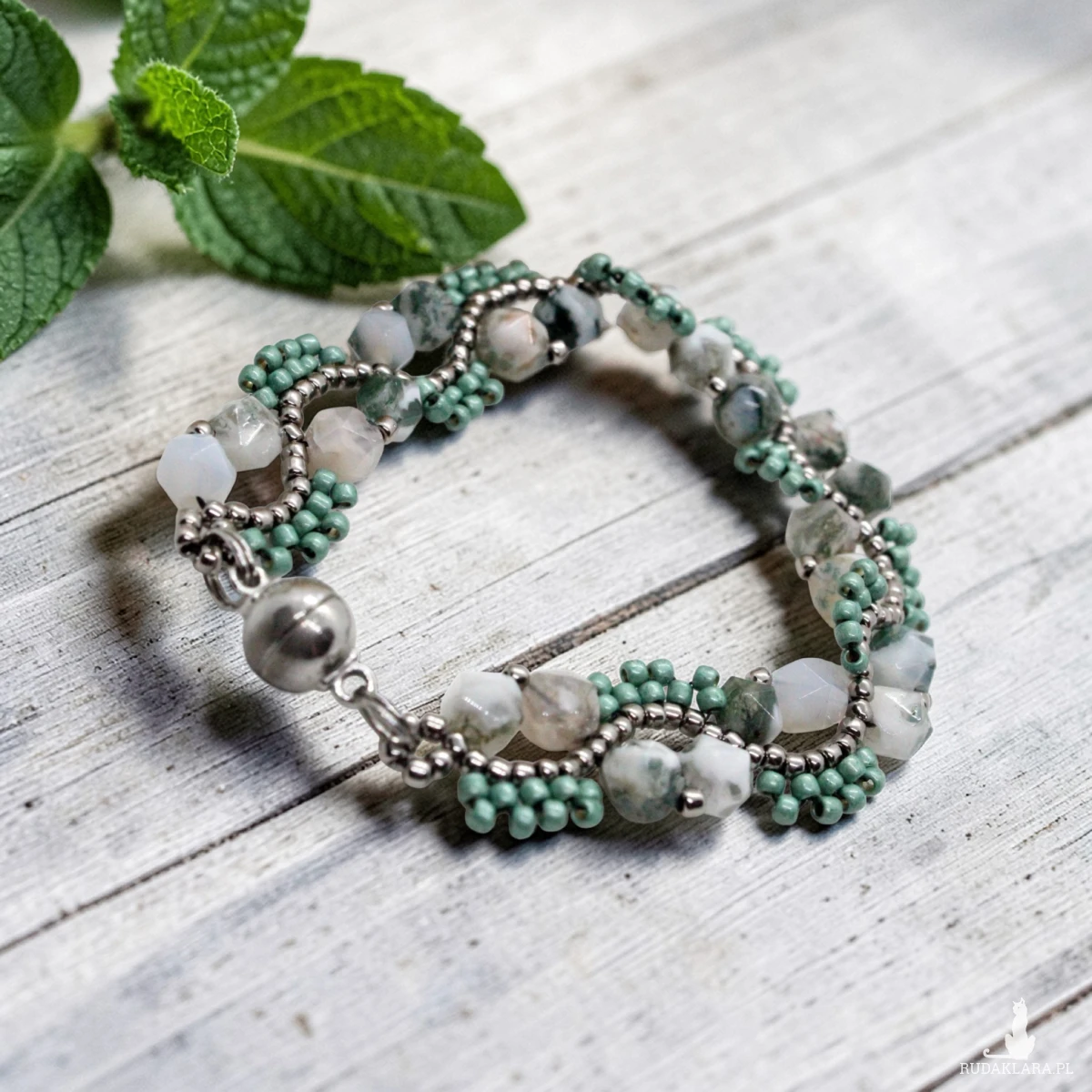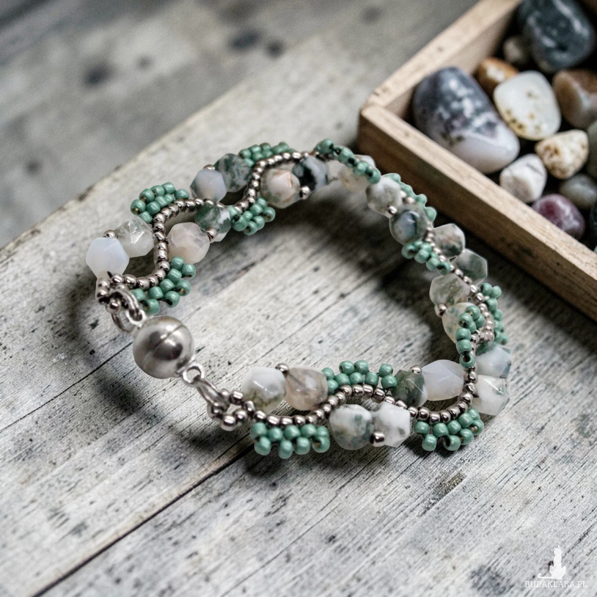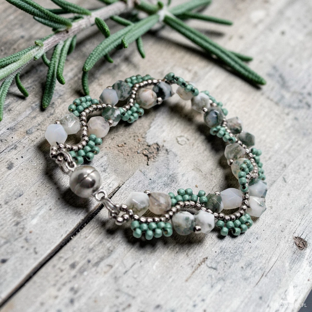 Bransoletka uszyta z kamieni naturalnych agatu mszystego oraz drobniutkich, szklanych koralików japońskiej firmy Toho.