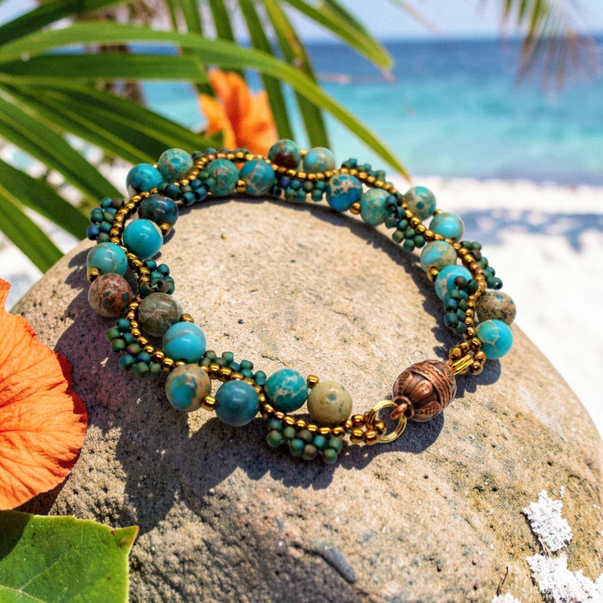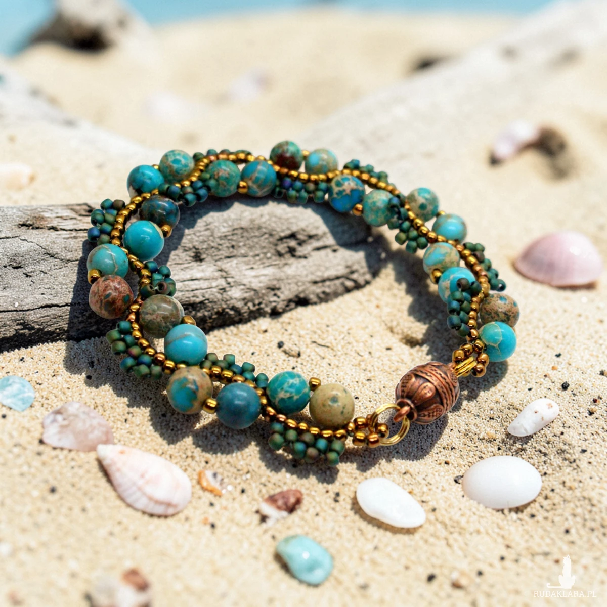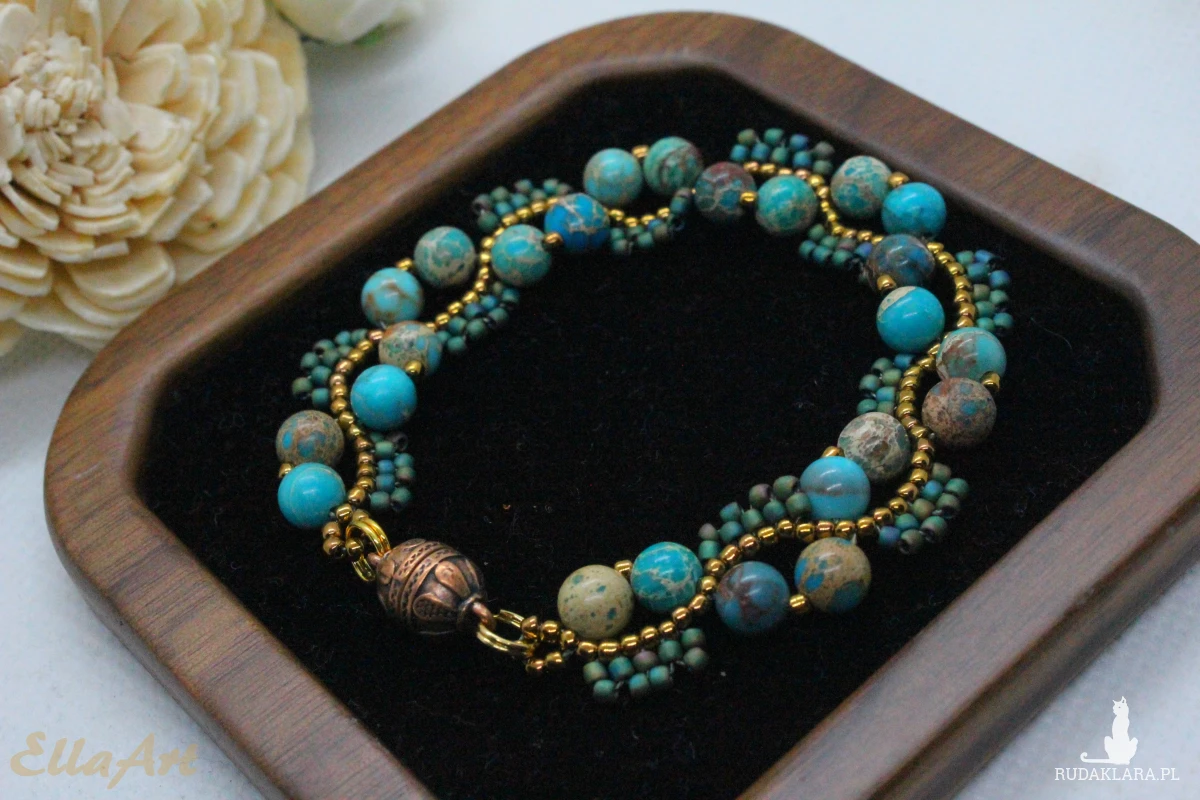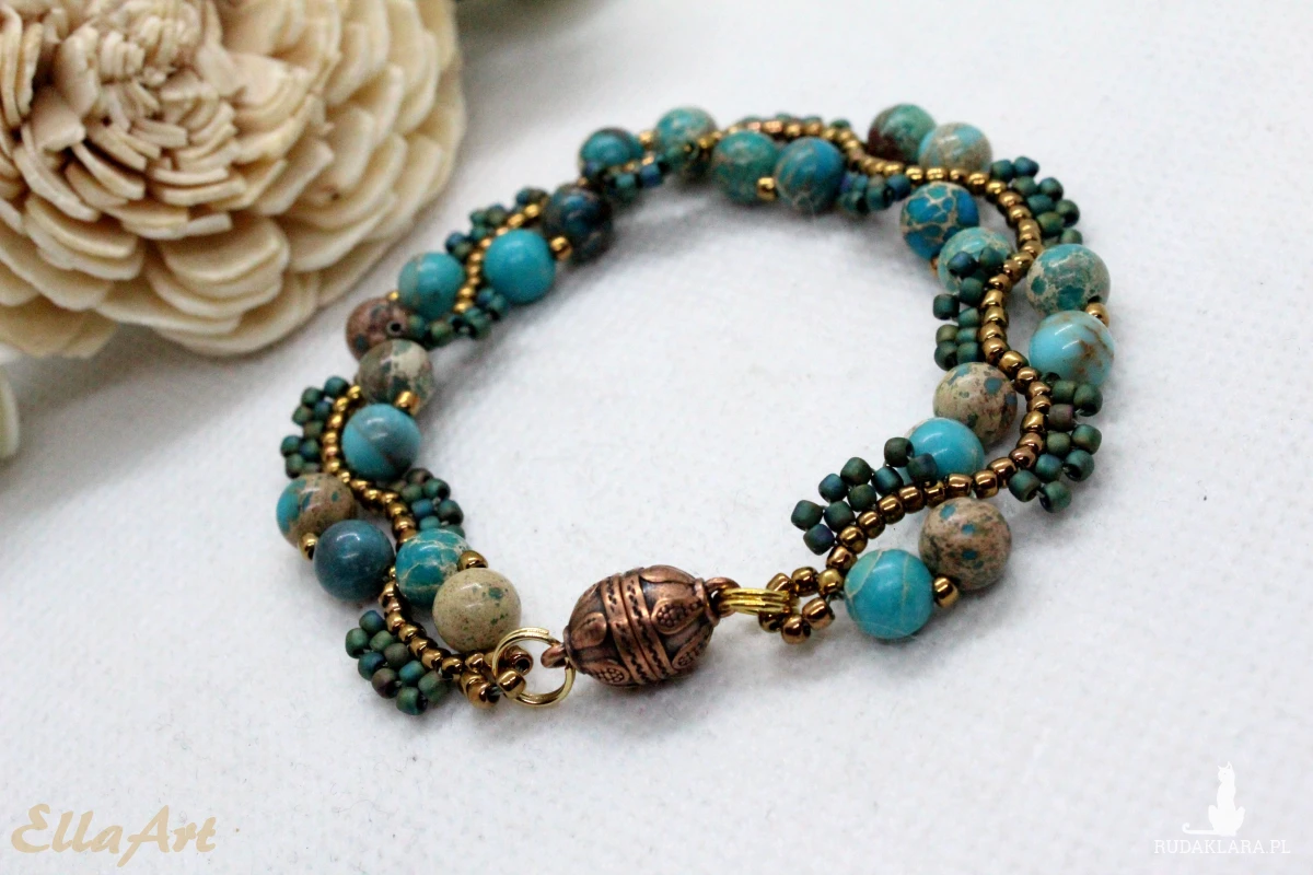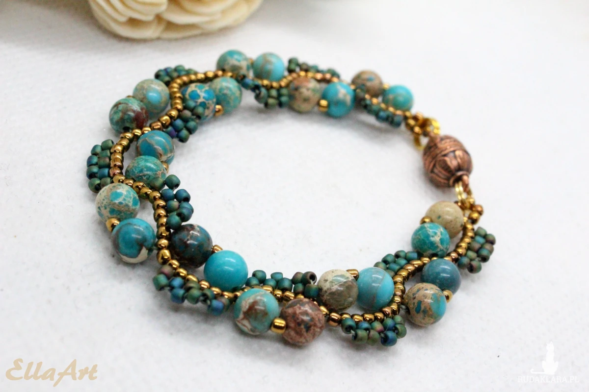 Bransoletka uszyta z kamieni naturalnych jaspisu oraz drobniutkich, szklanych koralików japońskiej firmy Toho.