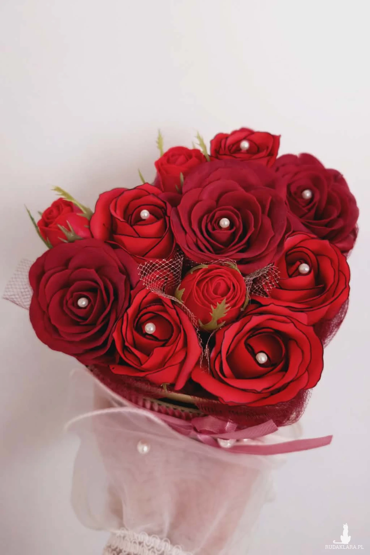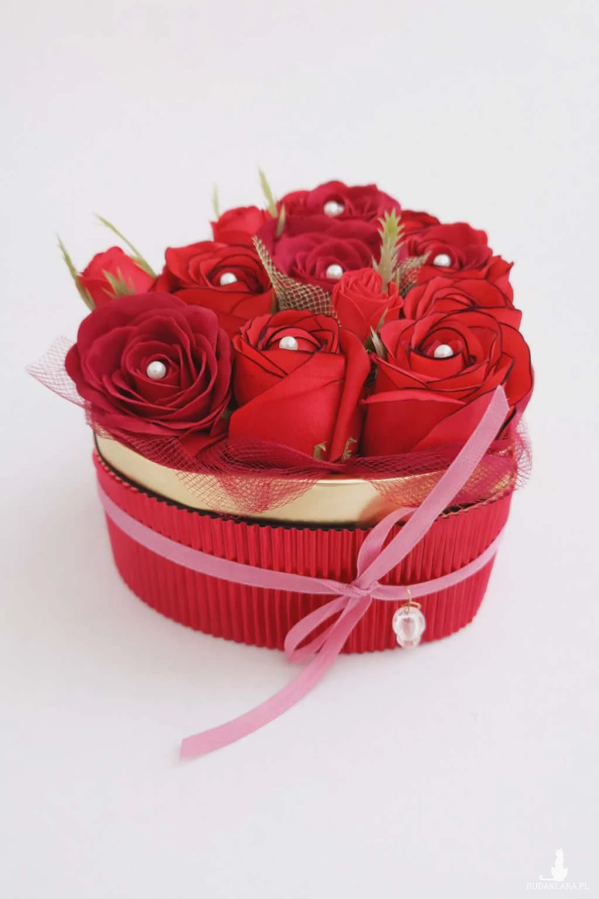 Niewielki, ale pełen uroku flowerbox w kształcie serca, który zachwyca swoją formą i romantycznym charakterem. W jego wnętrzu znajdują się wysokiej jakości róże mydlane, zdobione delikatnymi imitacjami perełek, które dodają całości elegancji i wyjątkowego blasku. Całość dopełnia urocza zawieszka z kryształu górskiego – kamienia uznawanego za symbol czystości, harmonii i wzmocnienia energii. Wierzy się, że wspiera wewnętrzną równowagę i potęguje pozytywne intencje. Kompozycja utrzymana jest w głębokiej czerwieni, podkreślonej złotymi detalami i subtelną wstążką, co nadaje jej wyjątkowego, kobiecego charakteru. Róże posiadają delikatny zapach i zachowują swój piękny wygląd przez długi czas. Pełnią wyłącznie funkcję dekoracyjną. To nie tylko dekoracja… To symbol uczuć, czułości i piękna zamkniętego w formie serca. Idealny jako prezent dla bliskiej osoby lub wyjątkowy gest dla samej siebie.