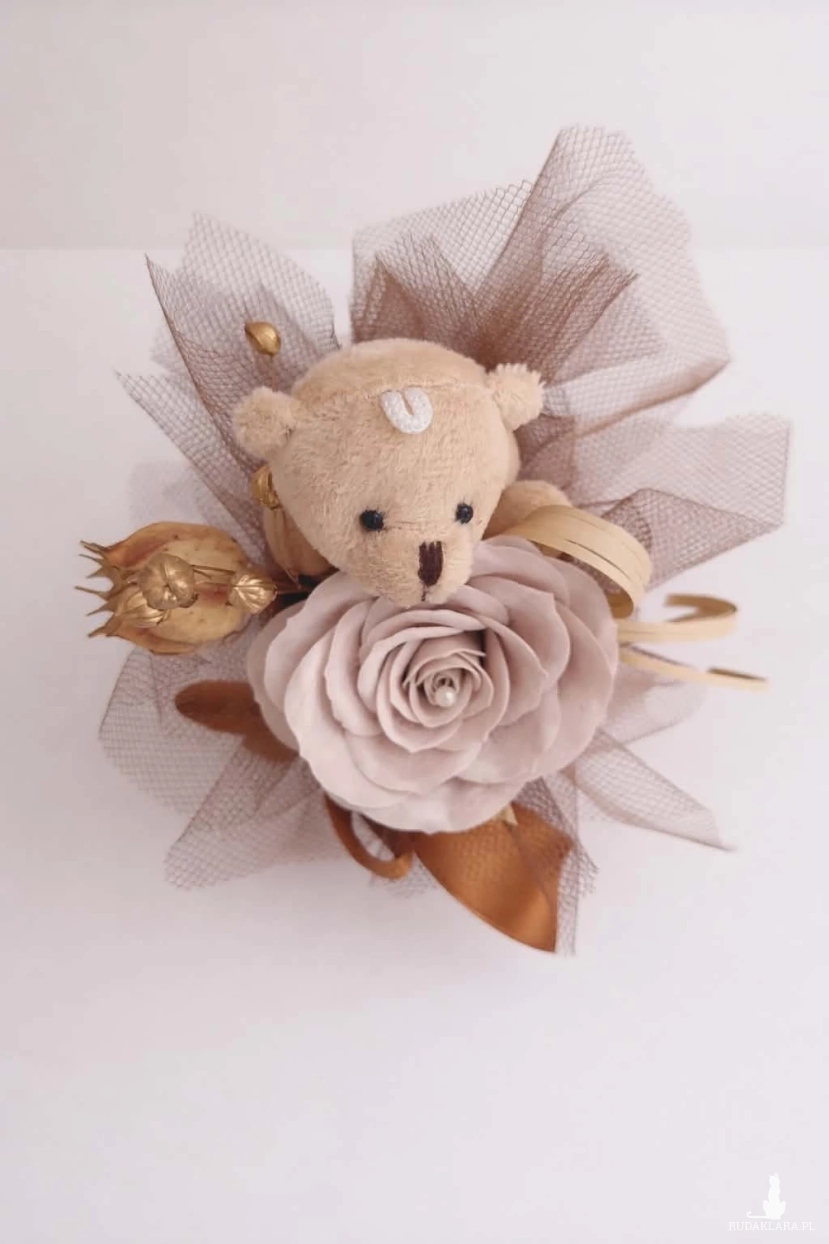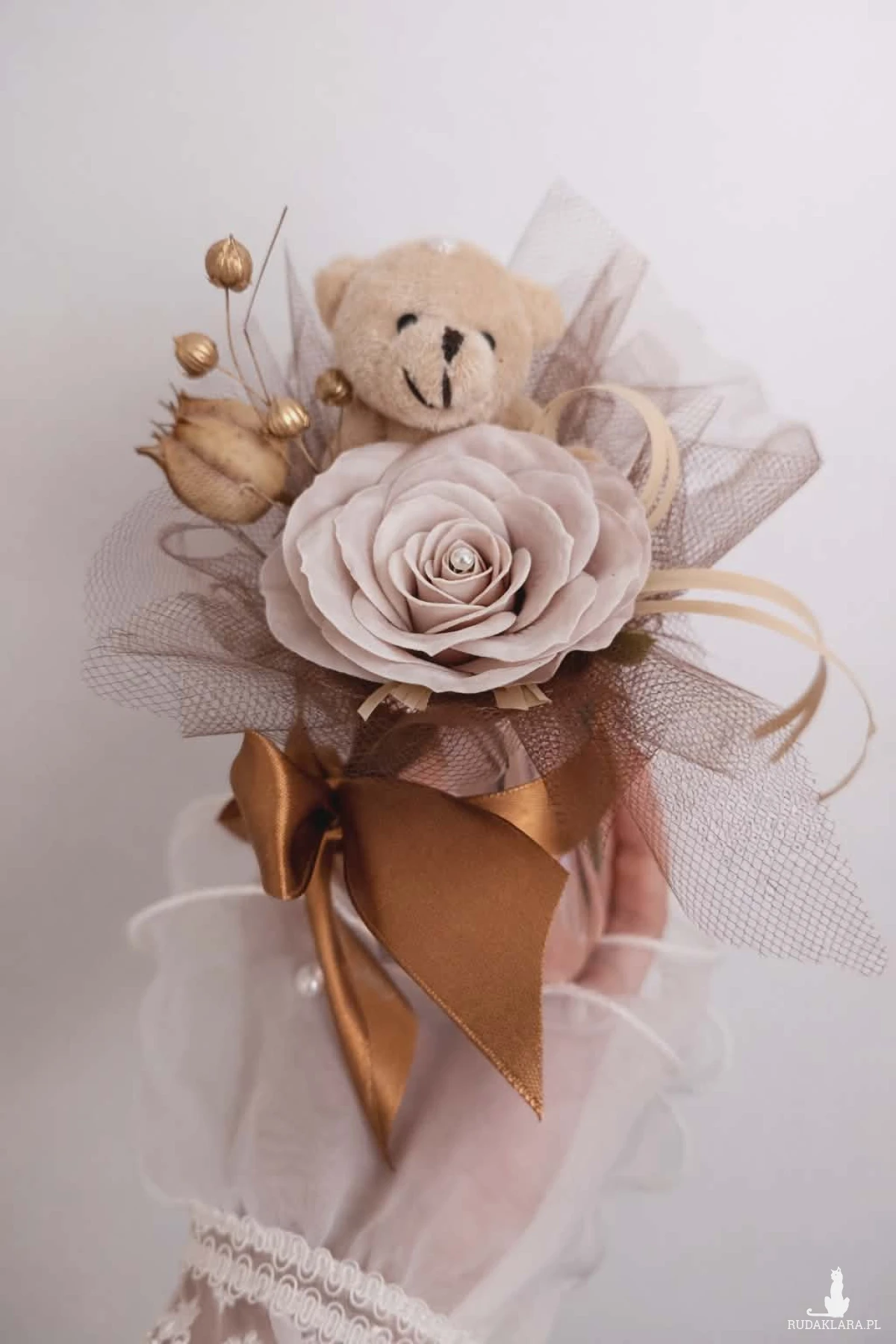 Niewielki, ale niezwykle uroczy flowerbox, który zachwyca swoją delikatnością i dopracowanymi detalami. W centralnym punkcie znajduje się elegancka róża w jasnym, subtelnym odcieniu beżu, otulona lekkim tiulem w kolorze ciepłej czekolady. Całość dopełnia malutki, uroczy miś, który nadaje kompozycji wyjątkowego, ciepłego charakteru. Drobne elementy suszu dodają naturalności i lekkości, tworząc harmonijną i spójną całość. To idealny, symboliczny prezent – pełen uroku, czułości i kobiecej delikatności. Róże wykorzystane w kompozycji pełnią wyłącznie funkcję dekoracyjną. Kolory mogą się nieznacznie różnić w zależności od ustawień monitora.