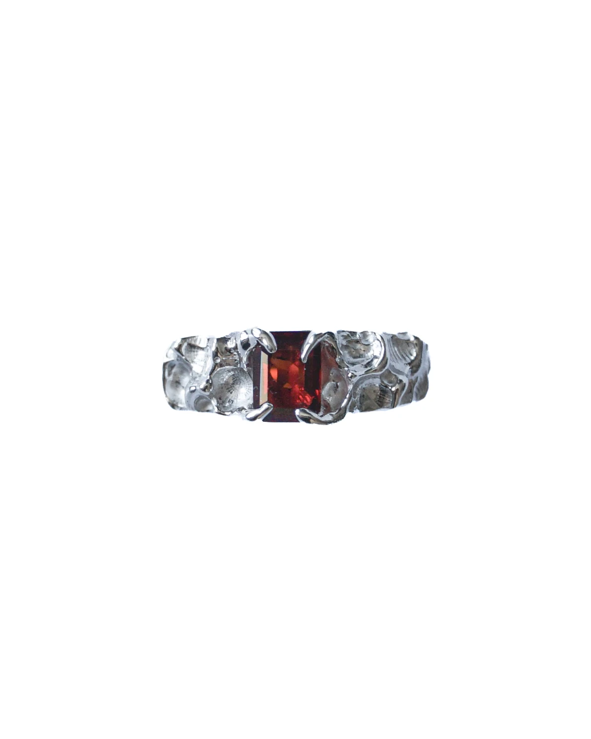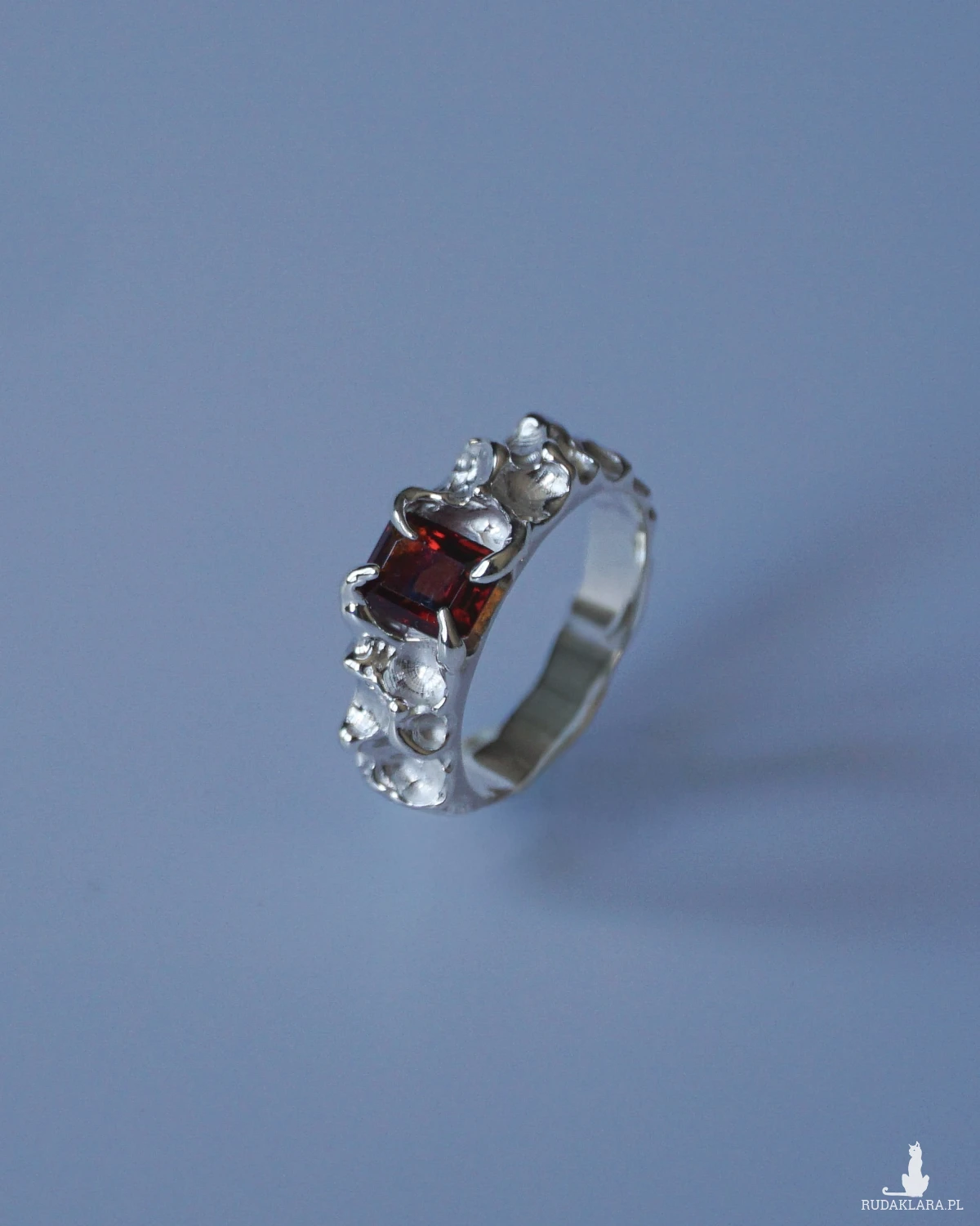 Srebrny nieregularny pierścionek z granatem. Wykonany w srebrze próby 925.