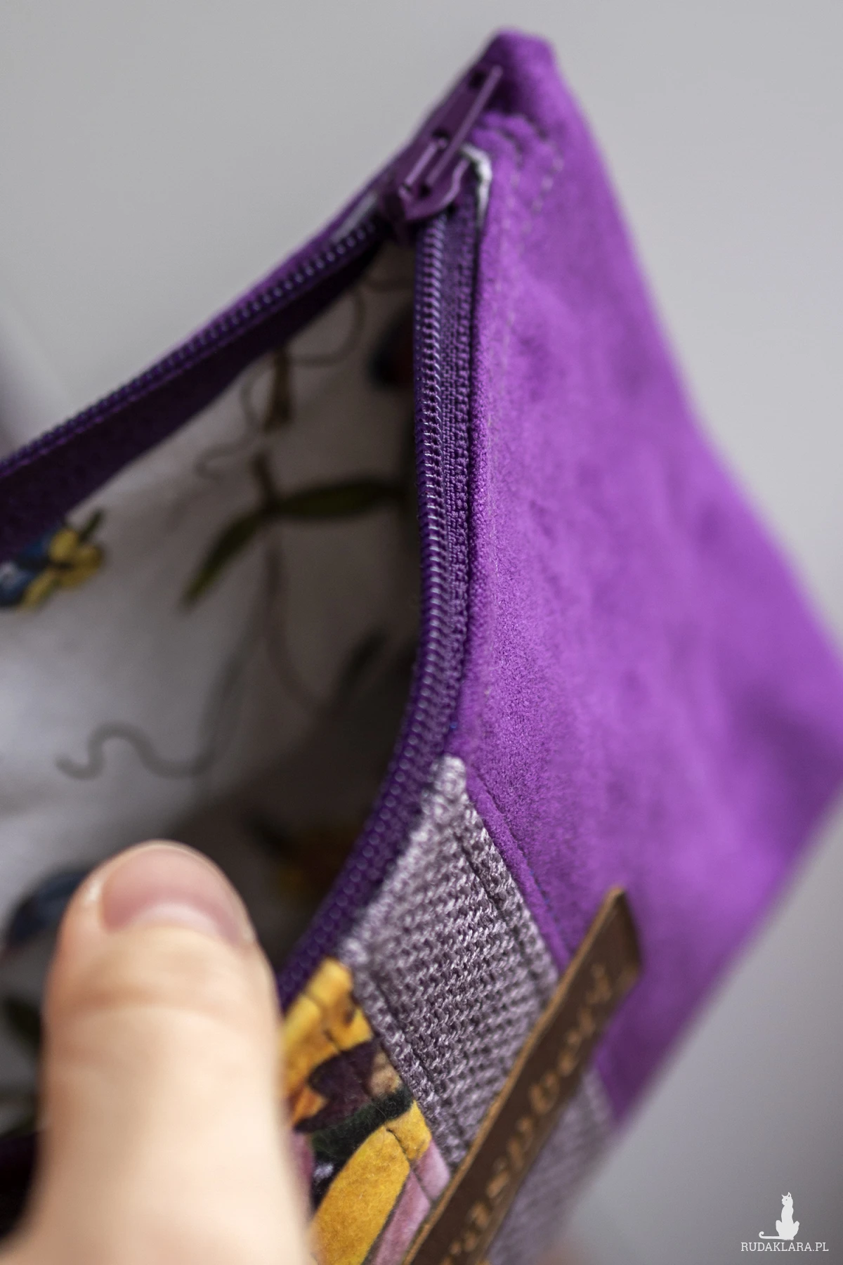 Średniej wielkości kosmetyczka wykonana kilku rodzajów tkanin. Stworzona w duchu no waste.