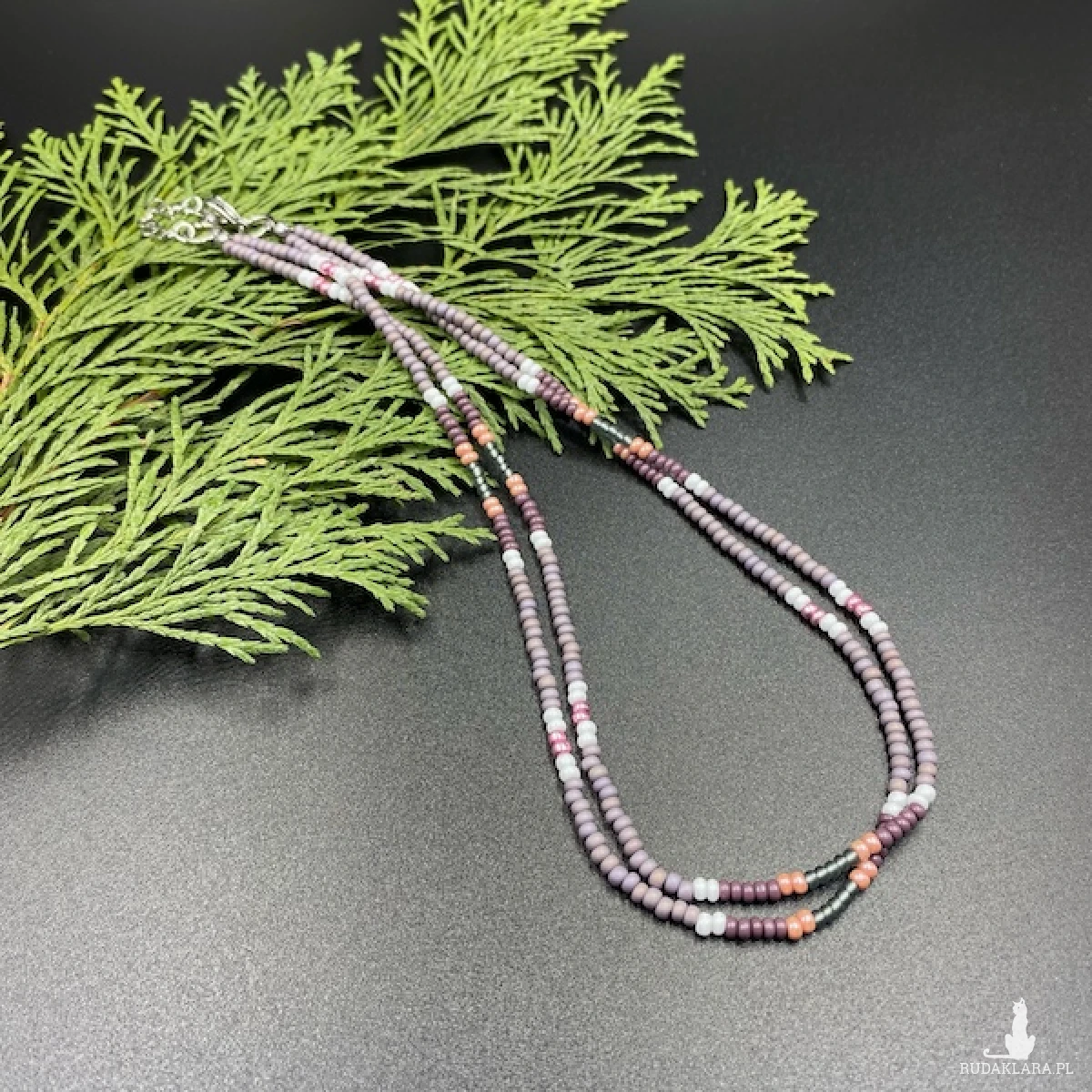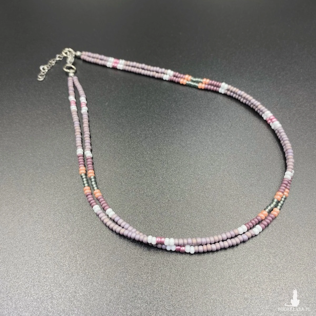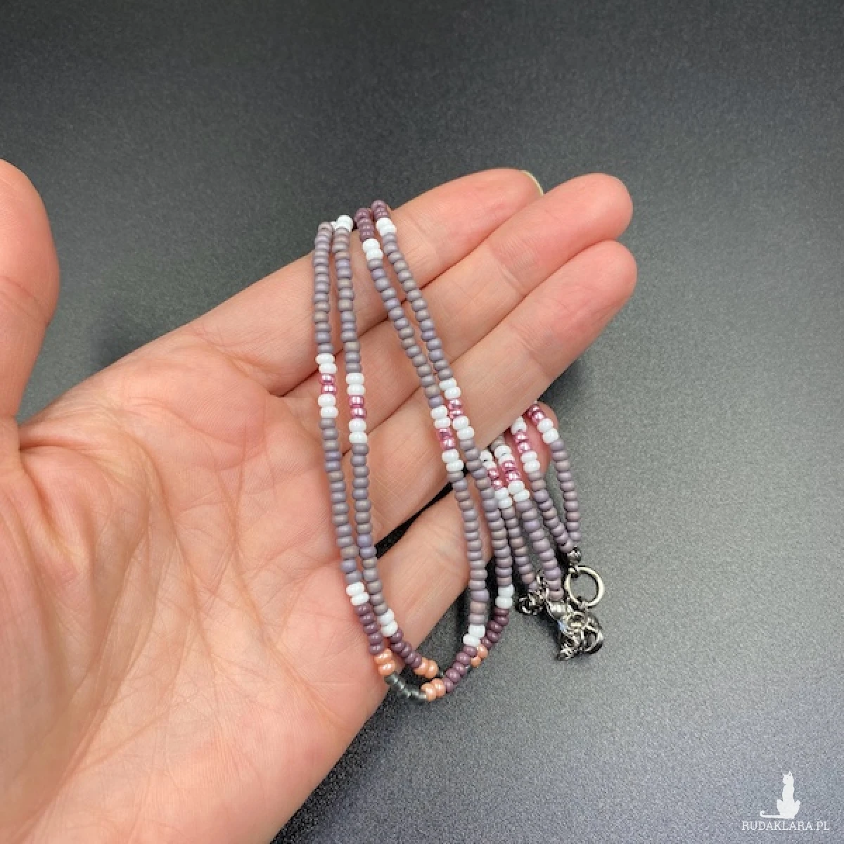Krótki naszyjnik ( złożony z dwóch sznurów ) został wykonany ręcznie ze szklanych koralików 2,7 - 3 mm w kolorze bladej lawendy, białym, szarym, odcieniach różu. Elementy metalowe ze stali chirurgicznej.