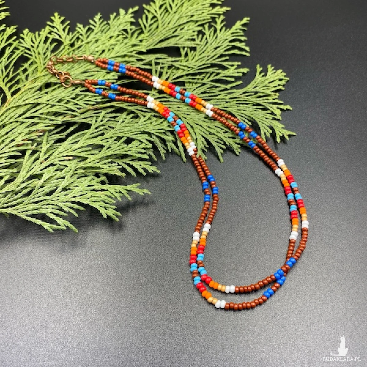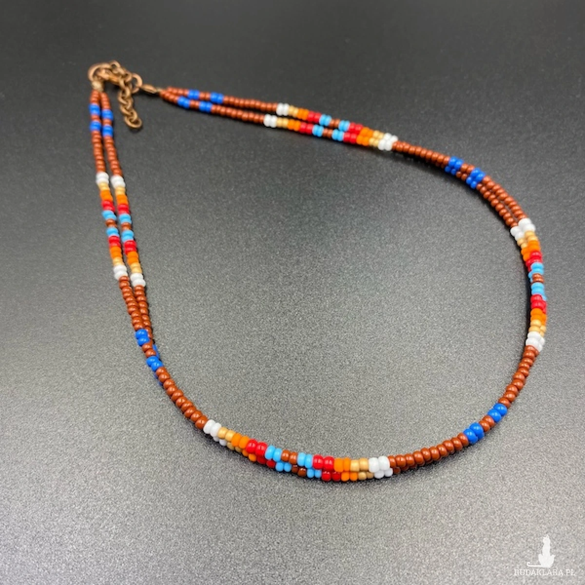 Krótki naszyjnik ( złożony z dwóch sznurów ) został wykonany ręcznie ze szklanych koralików 2,7 - 3 mm w kolorze: brązowym, niebieskim, czerwonym, miodowym, białym, pomarańczowym. Elementy metalowe w kolorze miedzi.
