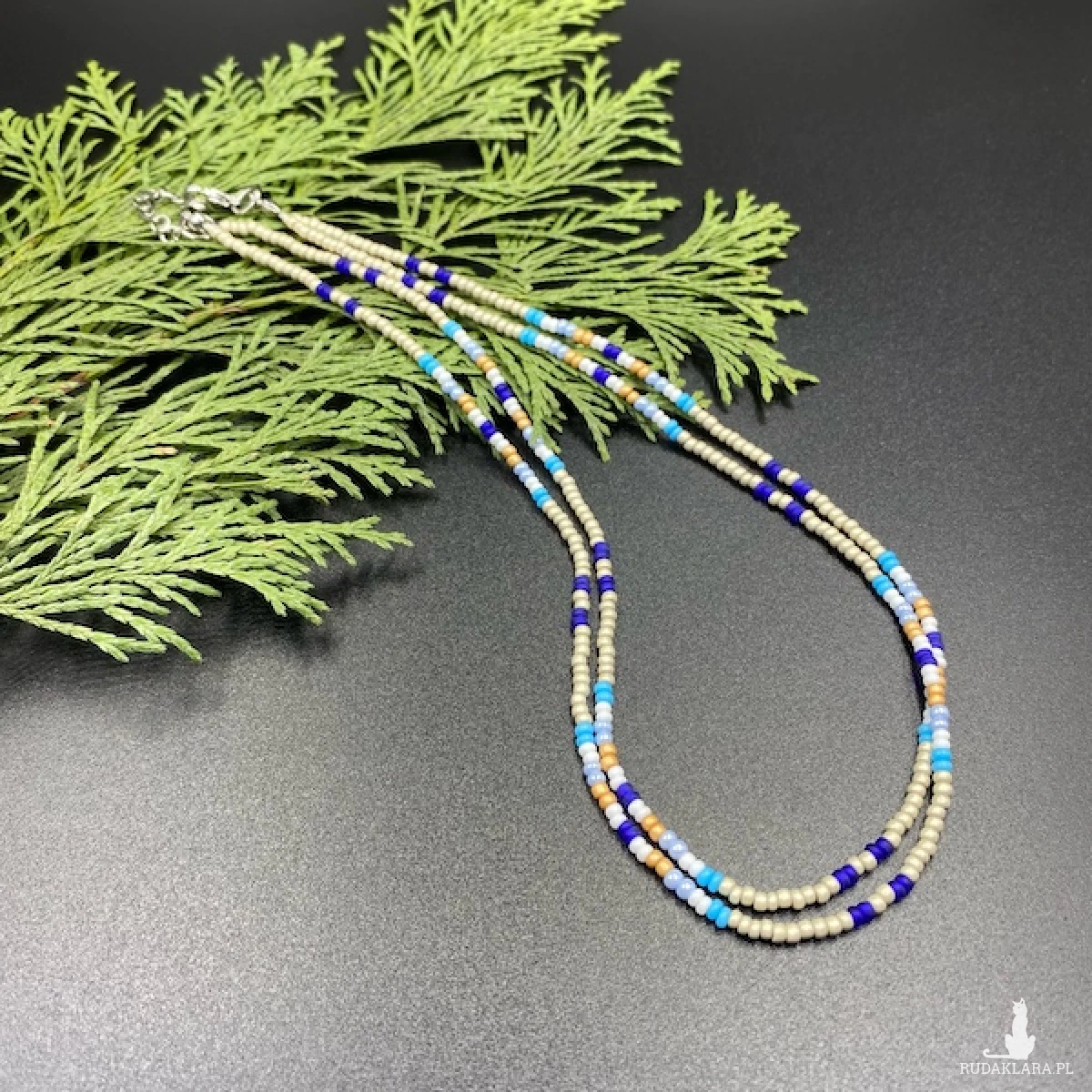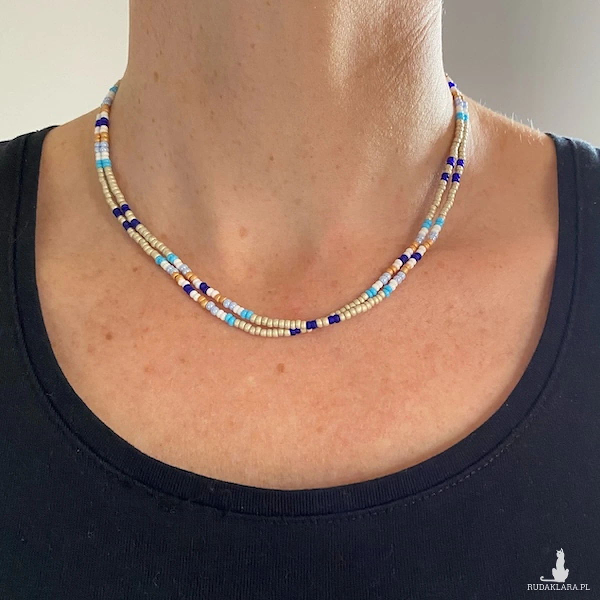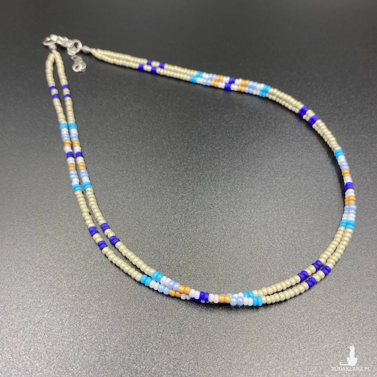 Krótki naszyjnik ( złożony z dwóch sznurów ) został wykonany ręcznie ze szklanych koralików 2,7 mm w kolorze brudnego beżu, białym, niebieskim, granatowym, miodowym. Elementy metalowe ze stali chirurgicznej w kolorze srebrnym.